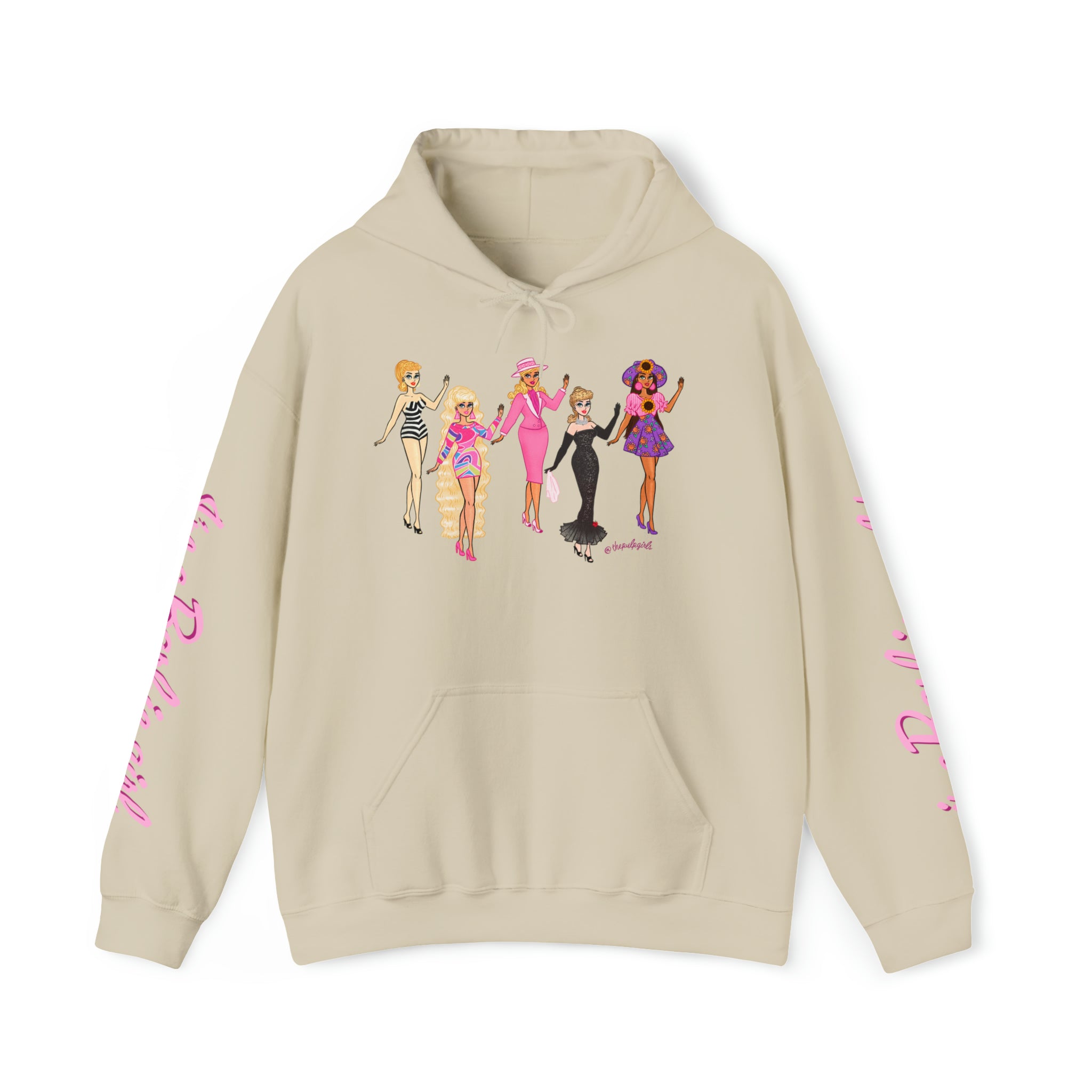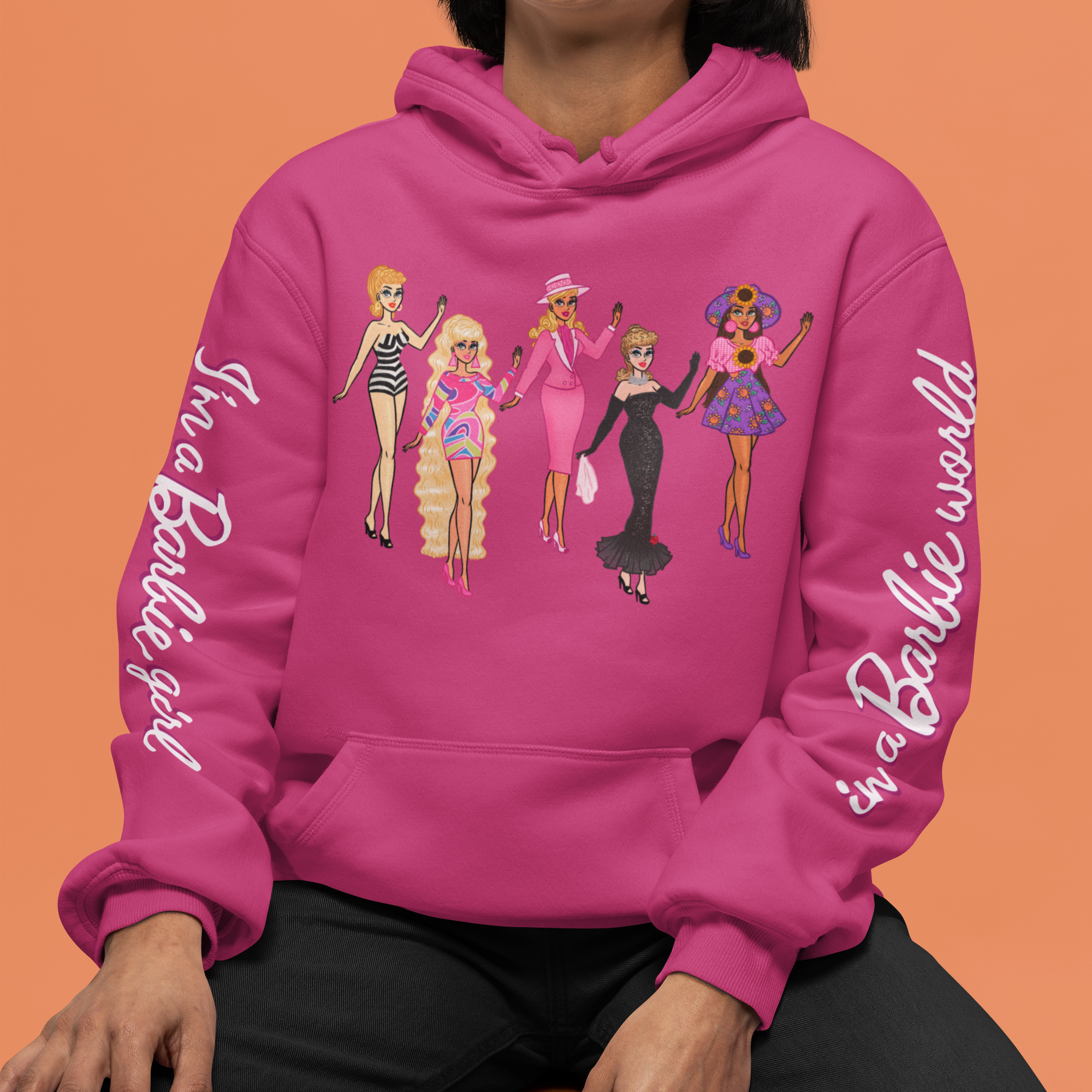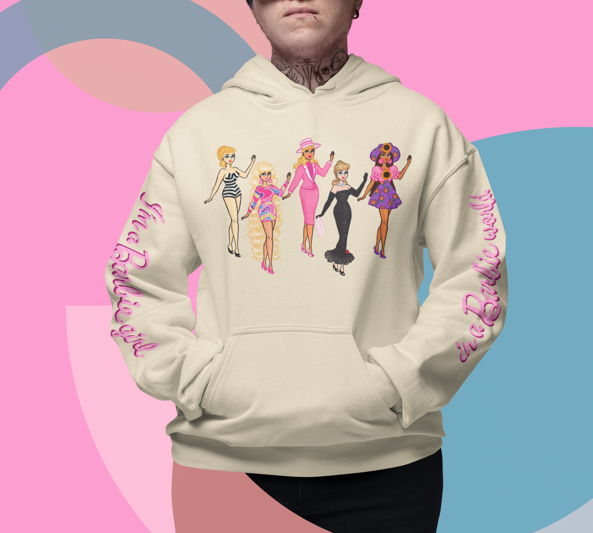True Barbie babes are gonna need this super comfy hooded sweatshirt! Featuring five Pulp fan art drawings of classic Barbies on the front and "I'm a Barbie girl" on one sleeve & "in a Barbie world!" on on the other, this hoodie is perfect for all doll fans and barbiecore lovers!