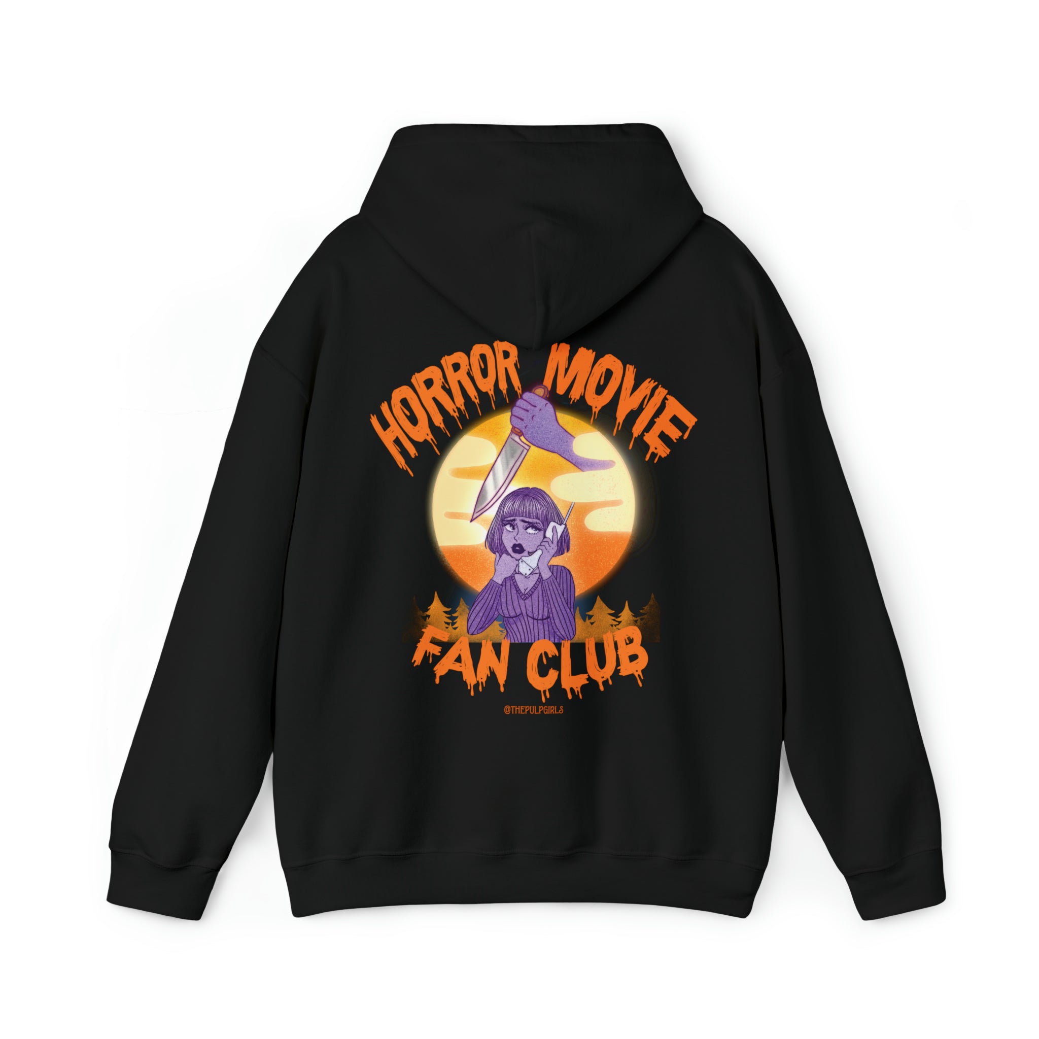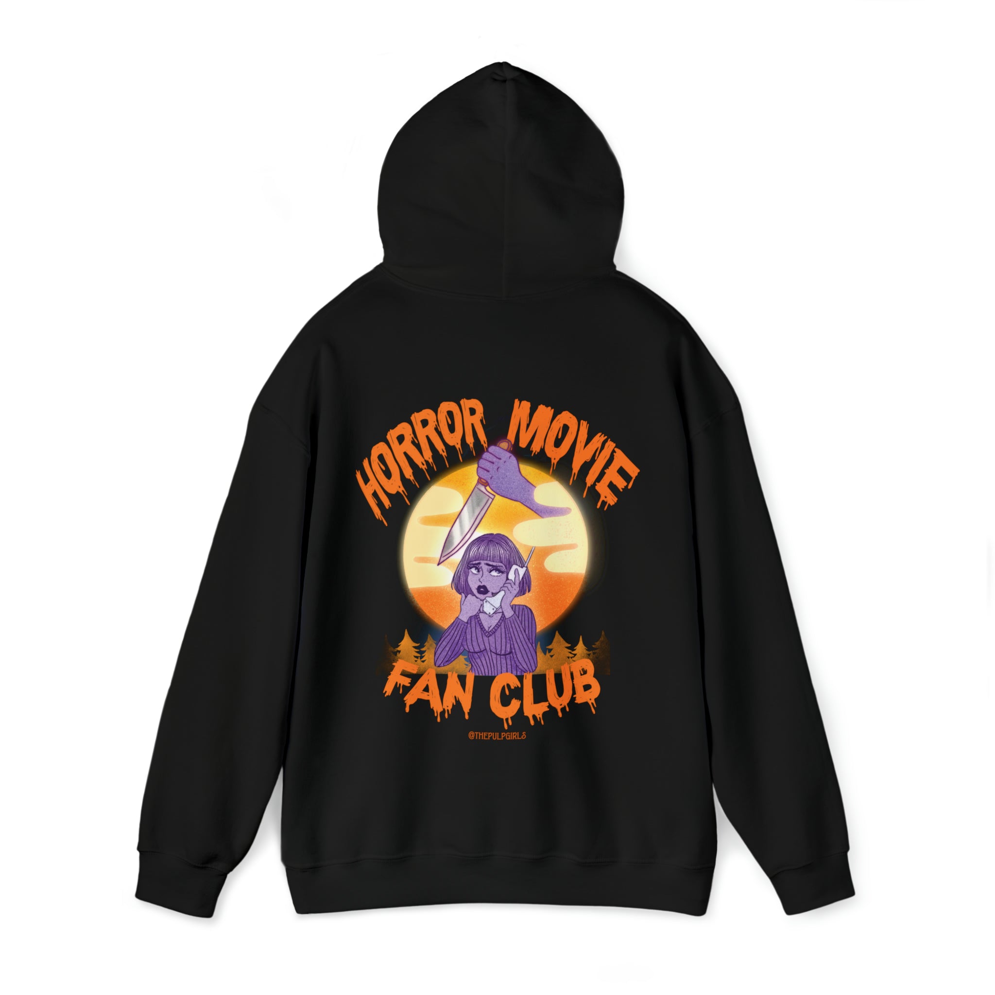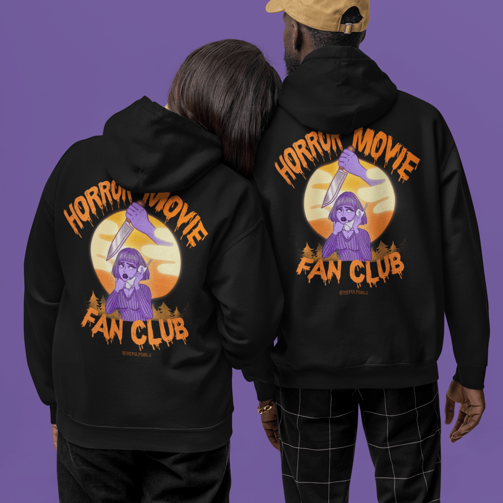 Show off your horror movie lover pride in this sweatshirt! Each sweatshirt features a knife wielding hand against a full moon with text on the front upper chest area, and a full-sized version of a classic horror movie scene along with text on the back!
