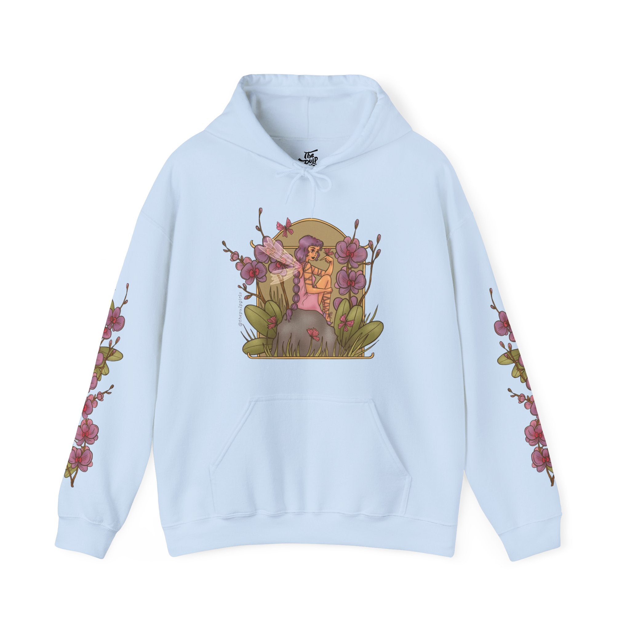 For all those air signs (and butterfly lovers, fairycore cuties, and cottagecore angels) out there, this is the hooded sweatshirt for you! Featuring a beautiful art nouveau-inspired air goddess in fairy form, complete with butterflies and purple irises. Perfect for any and all lovers of the fae, magic, witchcraft, femme aesthetics, and fairycore!