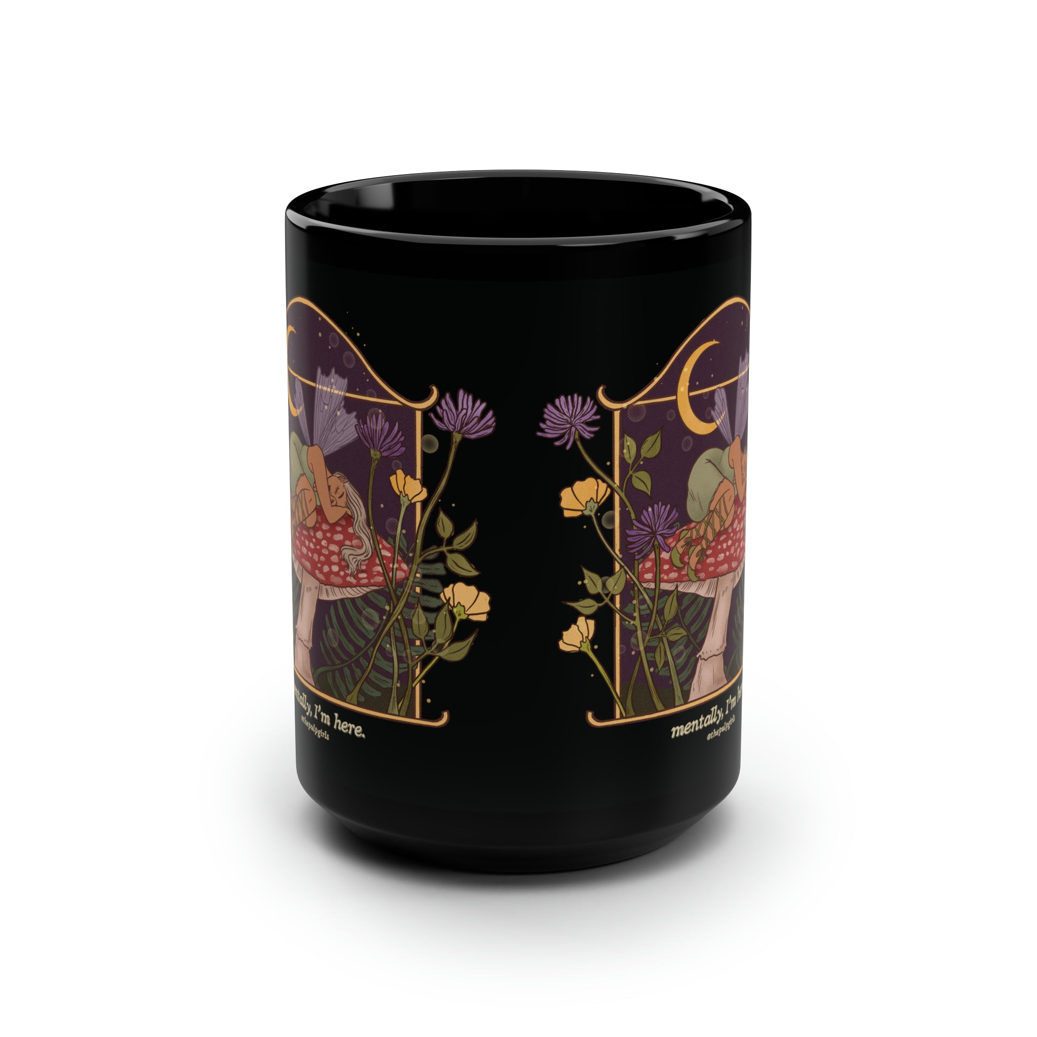 For all those earth signs (and mushroom lovers, fairycore cuties, and goblincore beauties) out there, this 15oz black mug is for you! Featuring a beautiful art nouveau-inspired earth goddess in fairy form, napping on a mushroom among wildflowers. Perfect for any and all lovers of the fae, magic, witchcraft, femme aesthetics, and fairycore!