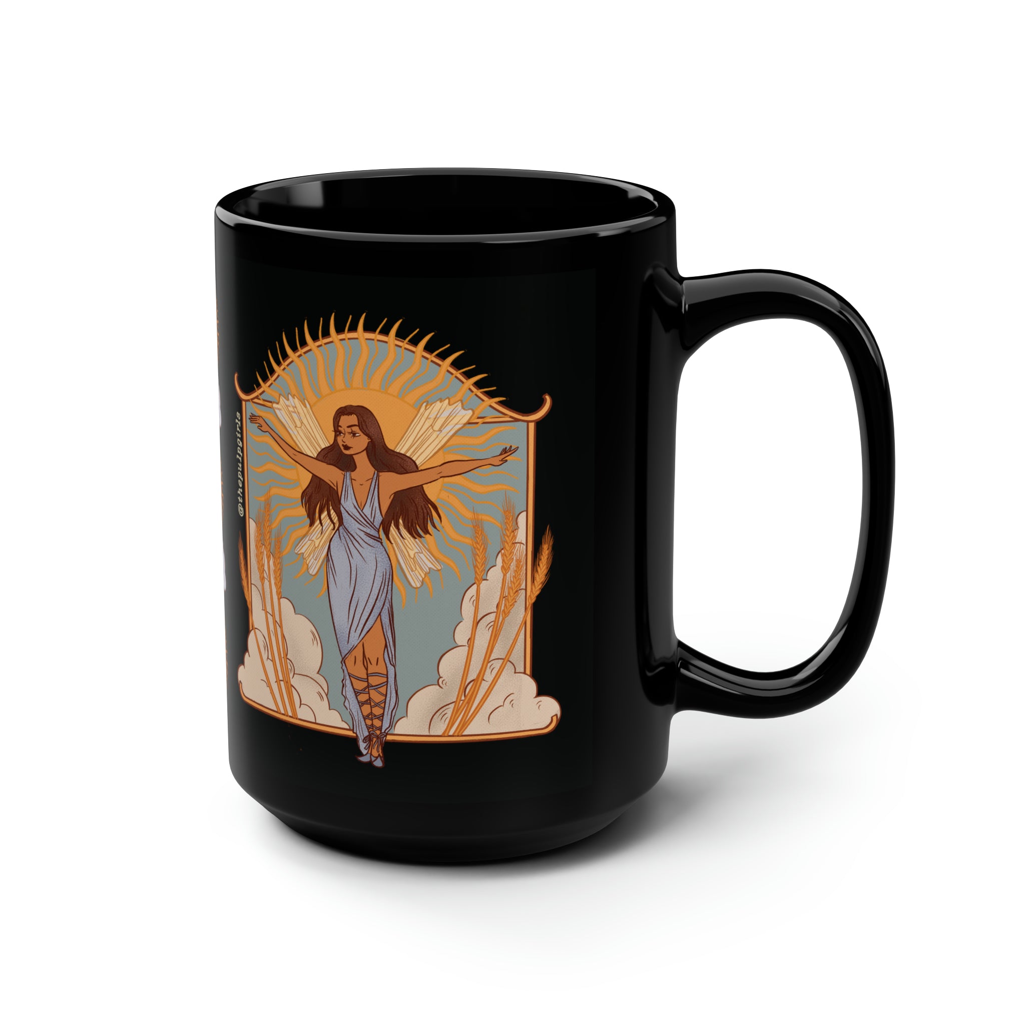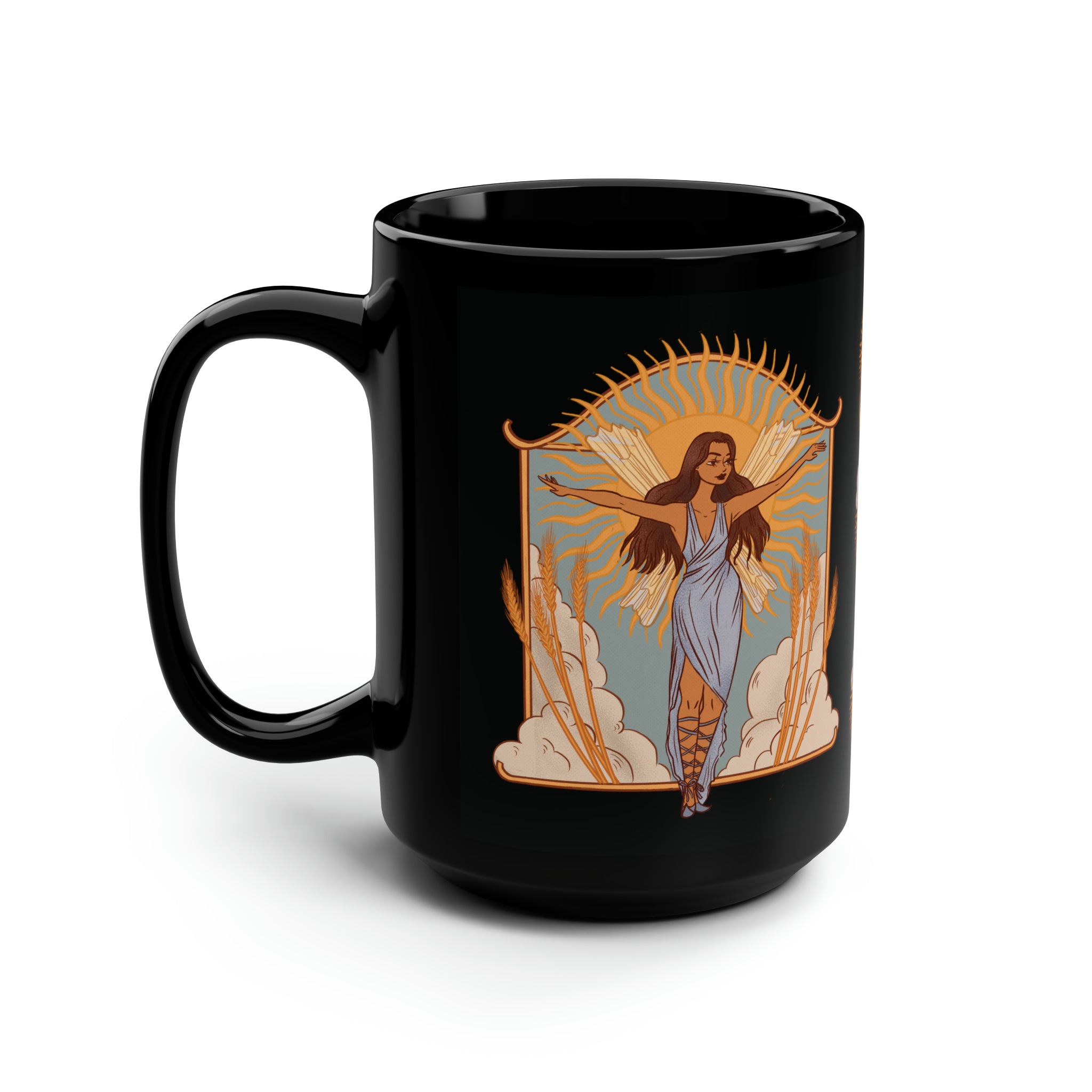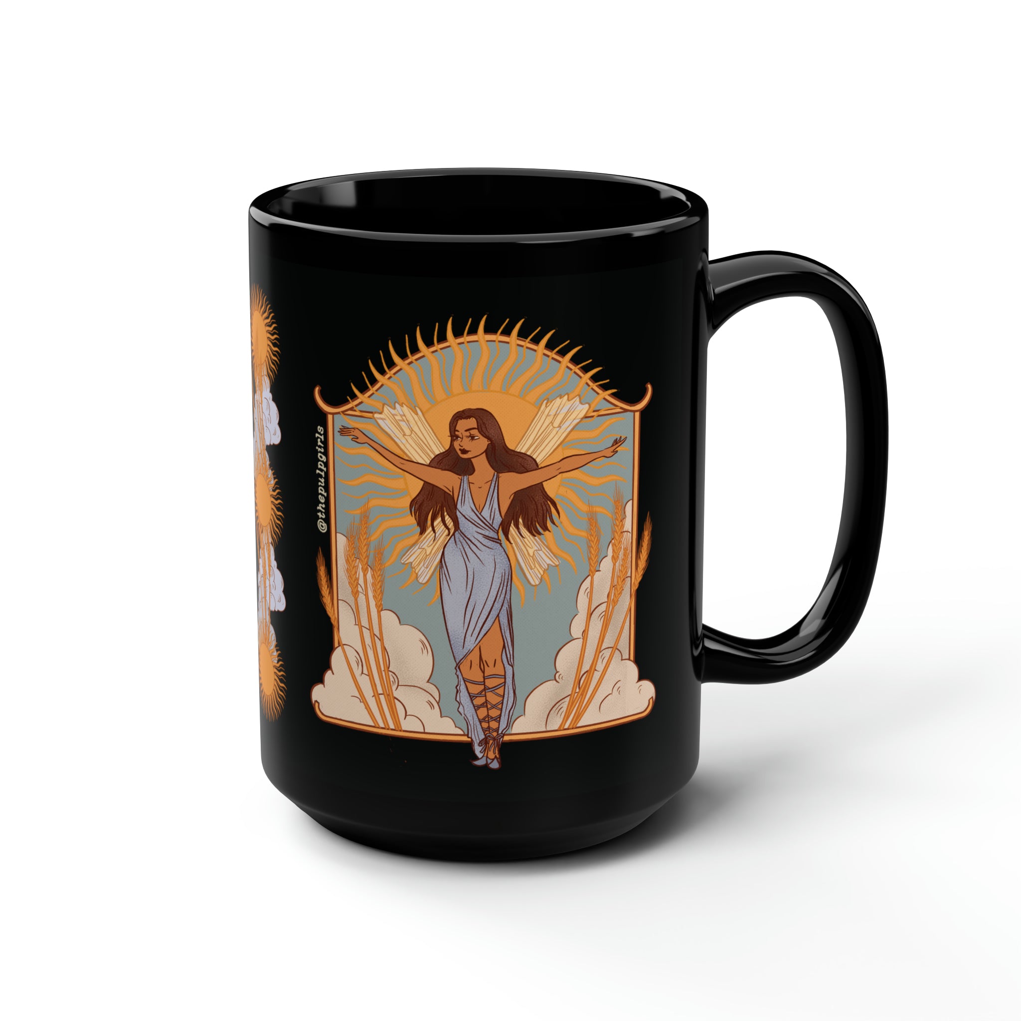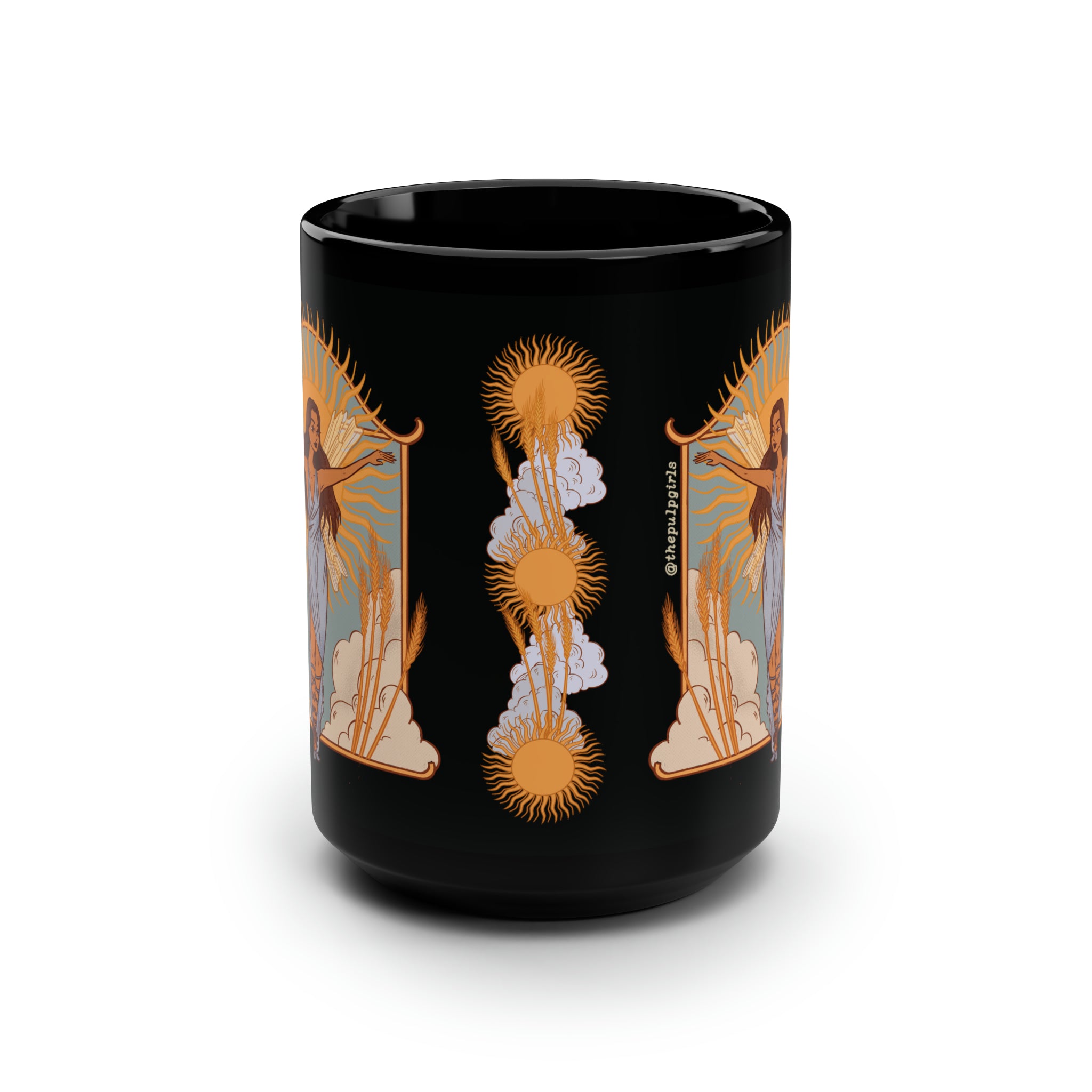 For all those fire signs (and sunny souls, radiant goddesses, and witchy folks) out there, this 15oz black mug is for you! Featuring a beautiful art nouveau-inspired fire goddess in fairy form, complete with abundant wheat and the bright, shining sun. Perfect for any and all lovers of the fae, magic, witchcraft, femme aesthetics, and fairycore!