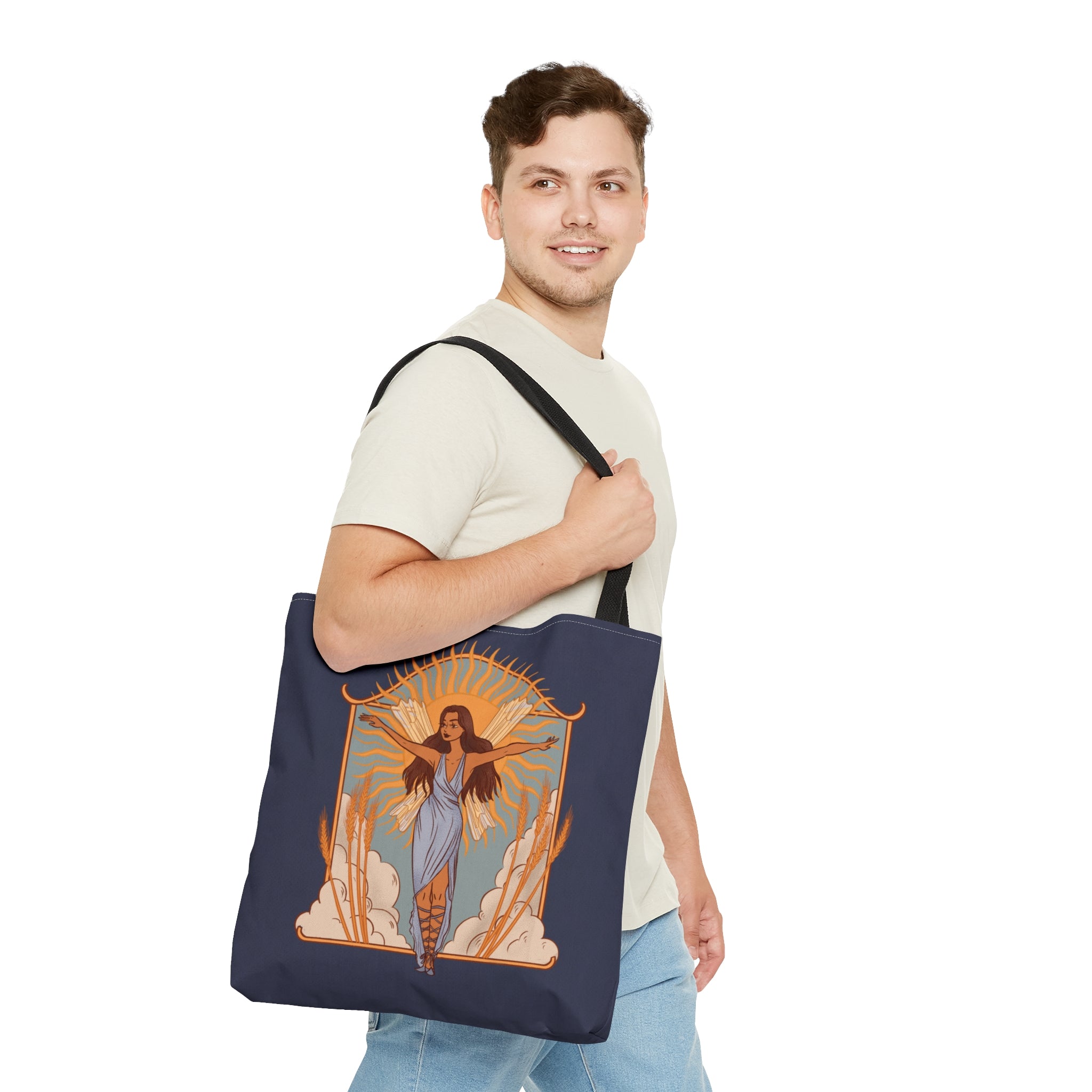 For all those fire signs (and sunny souls, radiant goddesses, and witchy folks) out there, this heavy duty tote is for you! Featuring a beautiful art nouveau-inspired fire goddess in fairy form, complete with abundant wheat and the bright, shining sun. Perfect for any and all lovers of the fae, magic, witchcraft, femme aesthetics, and fairycore!