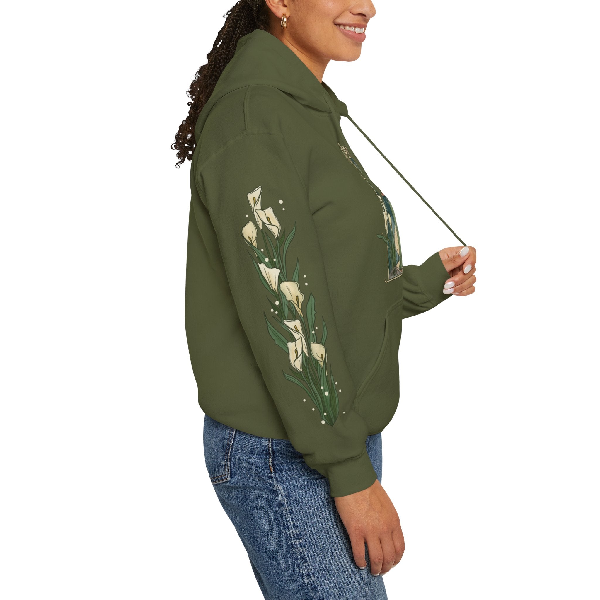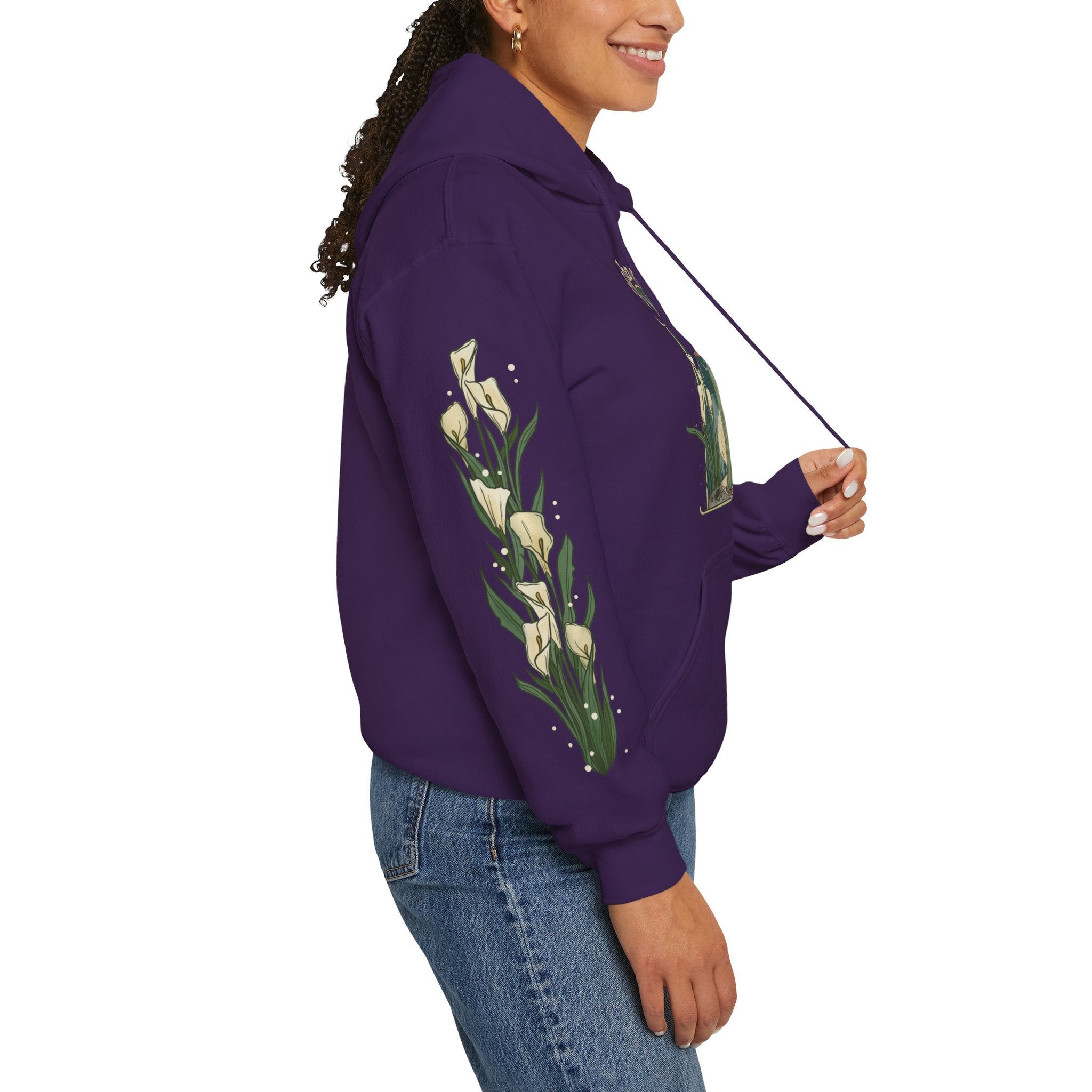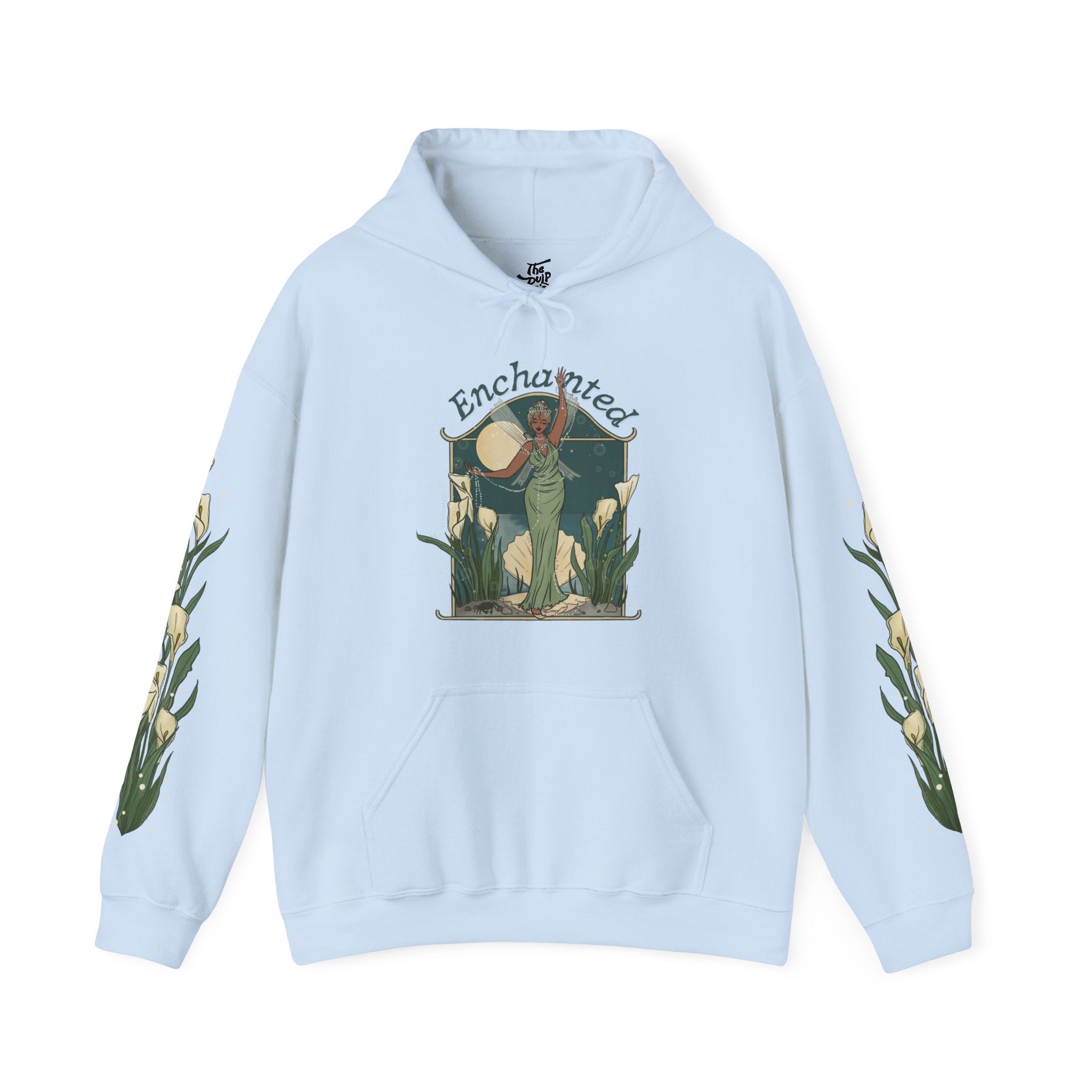 For all those water signs out there, this is the hooded sweatshirt for you! Featuring a beautiful art nouveau-inspired water goddess in fairy form, complete with water lilies, the full moon, and the Venus clam shell. Perfect for any and all lovers of the fae, magic, witchcraft, femme aesthetics, and fairycore!