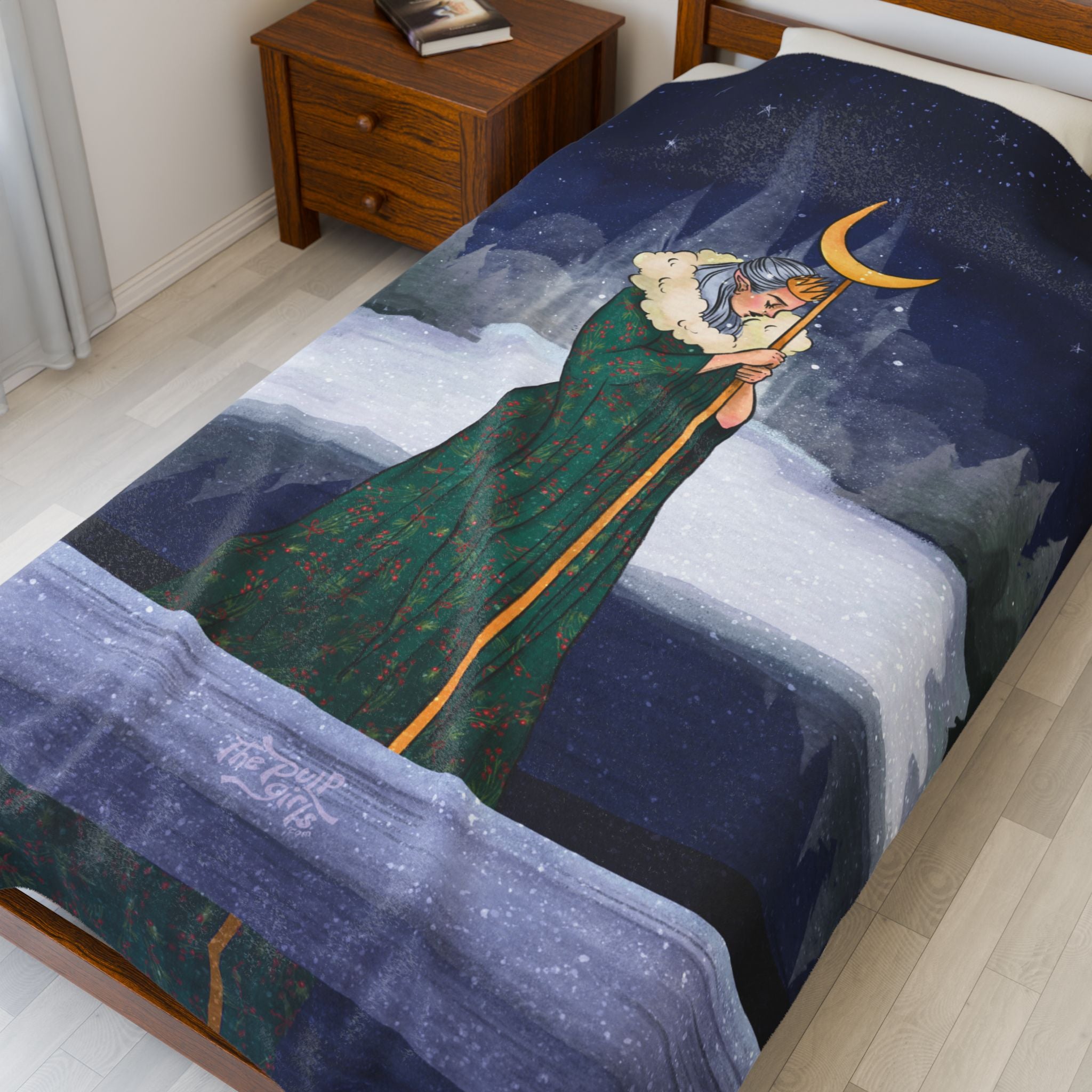 Cultivate patience and presence with our super soft blankets! A velveteen plush blanket that feels like a quiet night wrapped around you. Soft, slightly weighted fabric carries a stunning illustration of a winter elf sorceress, with her crescent moon staff in a winter setting. Use it to settle in after a long day, tuck into for mindful reading, or drape over shoulders during late-night journaling. Lightweight enough to carry between rooms, yet cozy enough to pull close on cool evenings, it blends nature-inspired whimsy with a modern, self-care mindset.