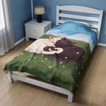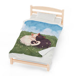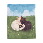 A cozy & warm cottagecore blanket featuring two sweet, loving cats curled up together in a green spring meadow, Pulp style! Perfect for cat lovers and those who enjoy a peaceful, serene atmosphere. Ideal for gifting during the holidays or to add a touch of comfort to any room. Choose from 50" x 60" or 60" x 80" sizing.