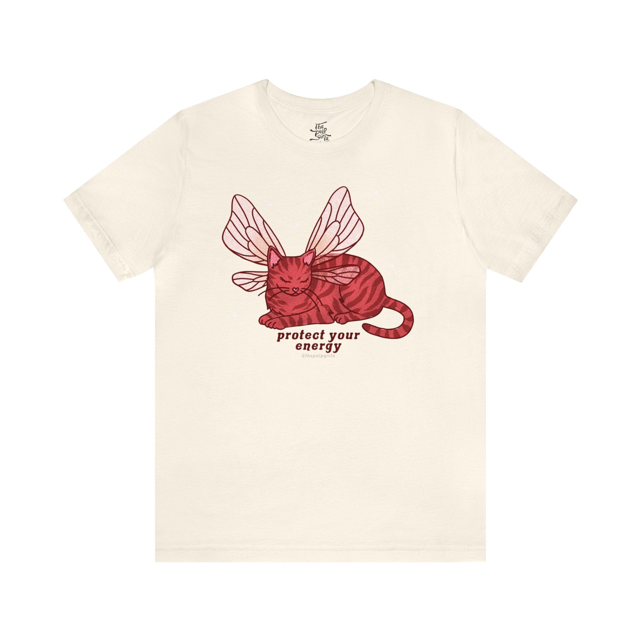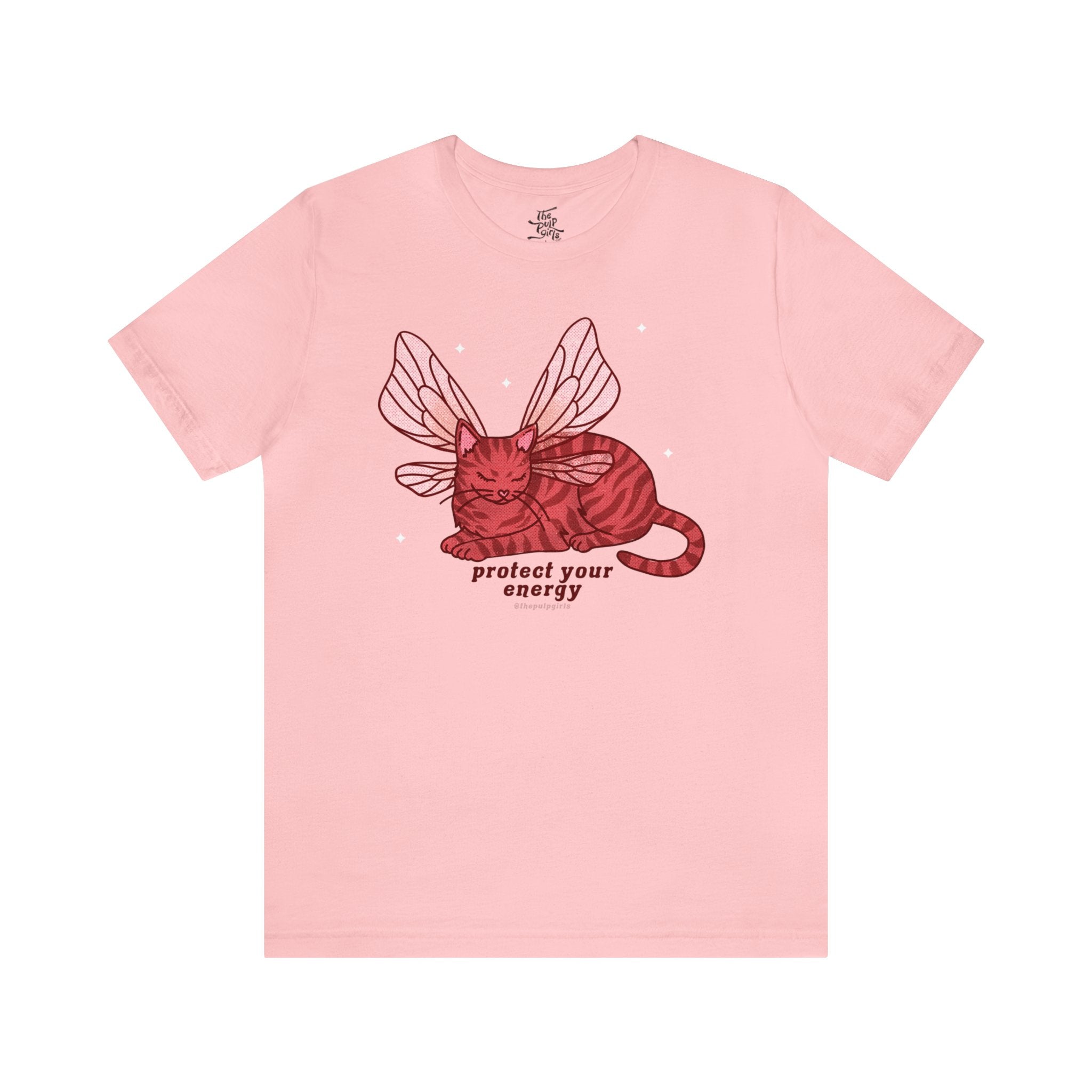 Invite some magic into your day with the fairy cat t-shirt! A blessed fairy kitty graces the front of this tee, totally serene and just protecting her beautiful energy. Perfect for cat lovers and cottagecore fans alike!