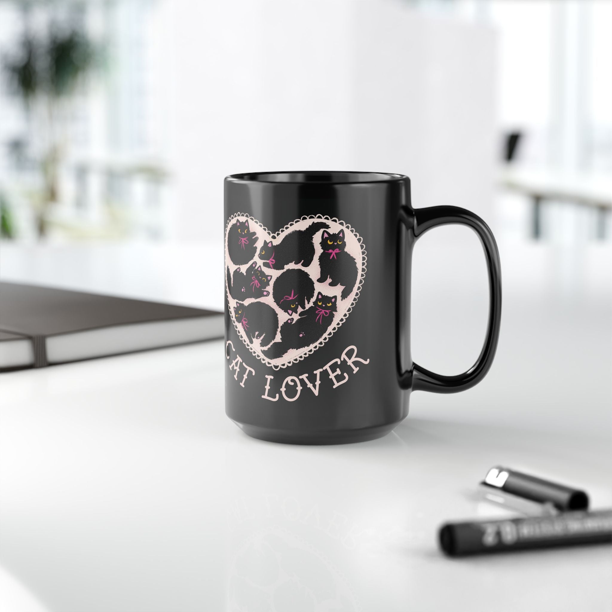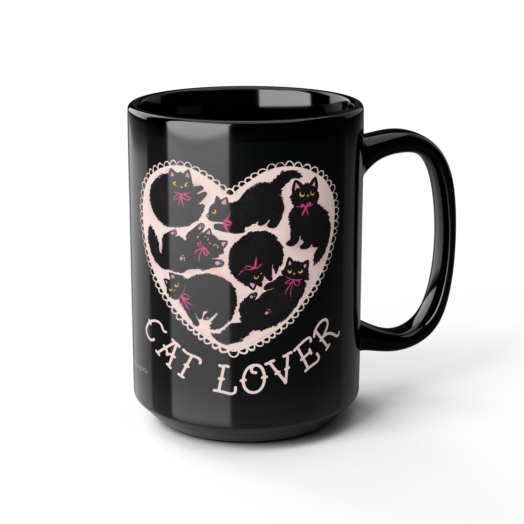 Broadcast your undying affection for your void - I mean, cat! Sturdy, cute, and eye-catching, this mug speaks to anyone who carries a black cat in their heart at all times. Featuring a Pulp illustration of sweet black cats curled inside a heart, accompanied by the simple declaration "CAT LOVER," perfect for cat lovers. They also make amazing gifts for any occasion.