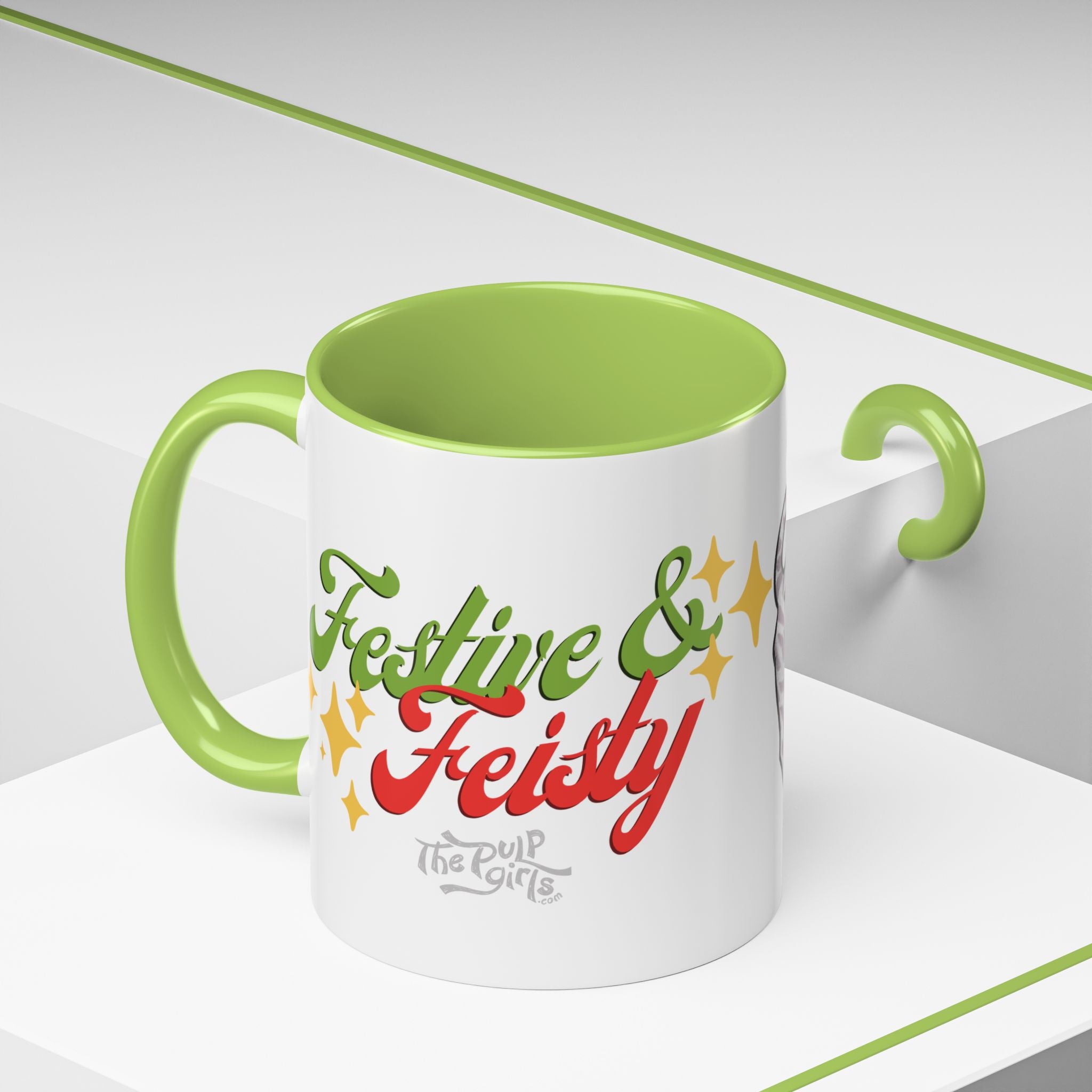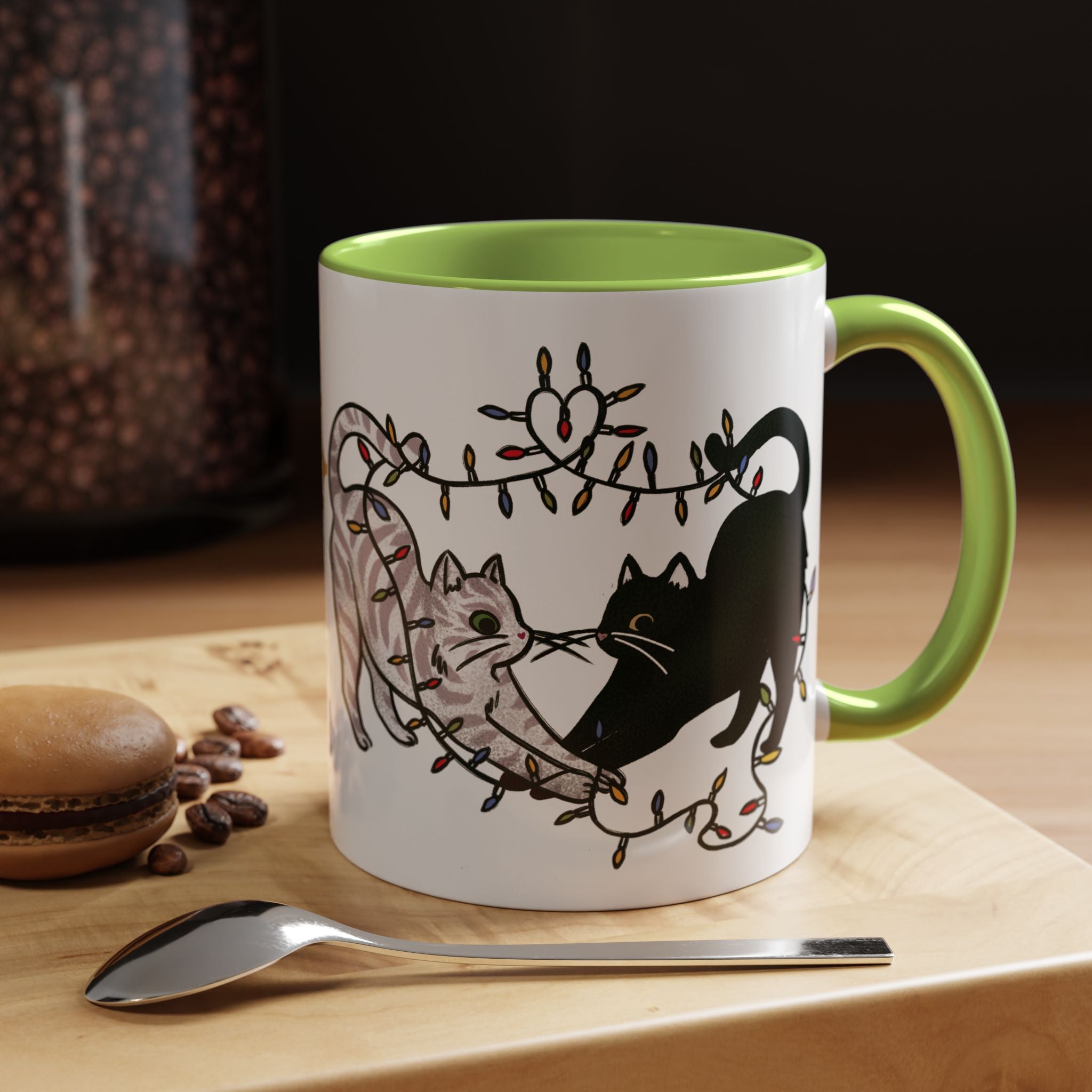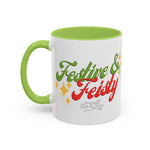 This mischievous cat-themed mug is perfect for cat lovers who enjoy a festive & fiesty atmosphere. Features two playful kitties "helping" with Christmas lights on one side and "Festive & Fiesty" in retro script on the opposite side. With a colorful handle & interior and glossy finish, this mug is sure to become an instant favorite during the holiday season.