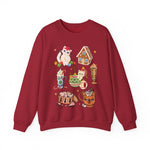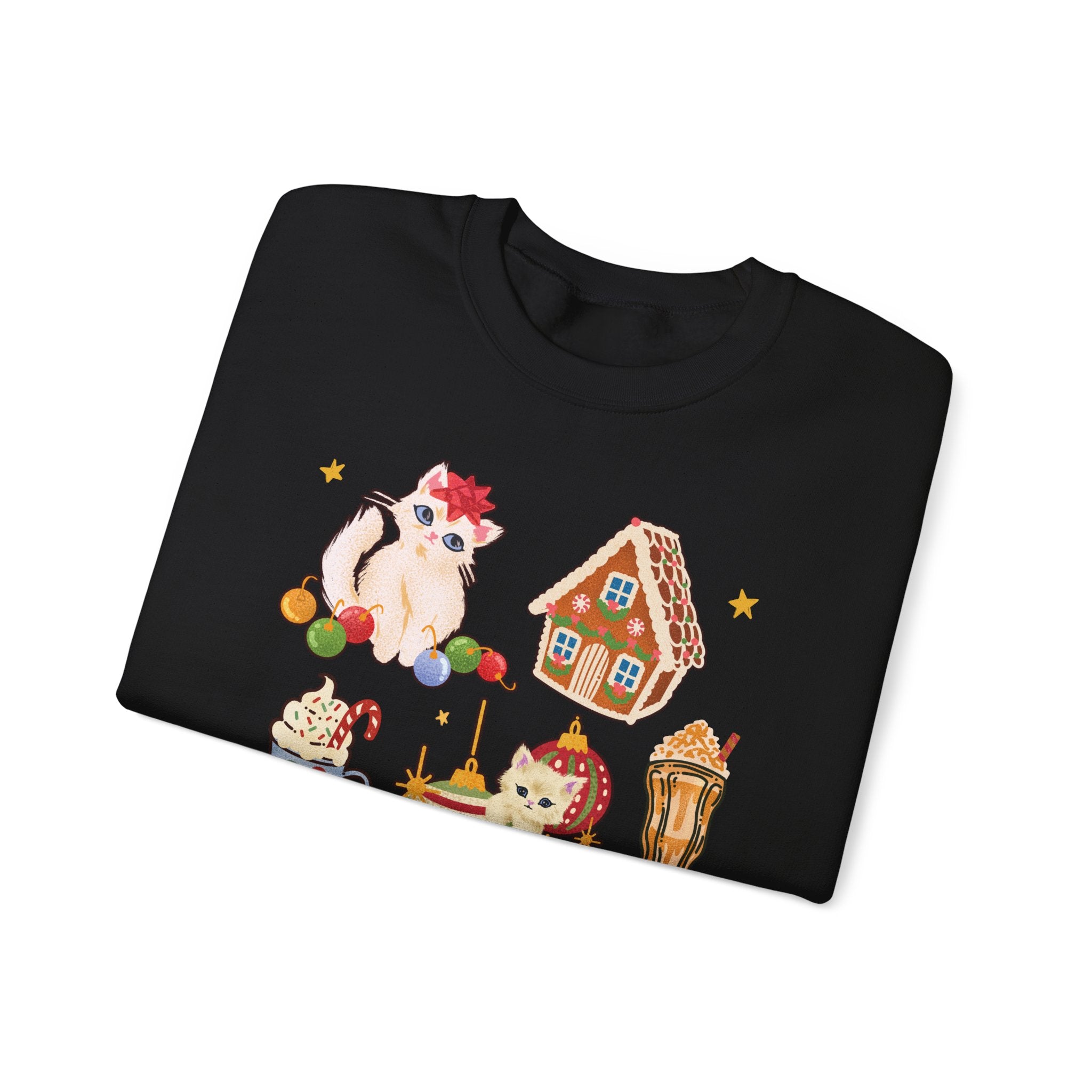 Treat yourself to a cozy dose of holiday charm with this ultra soft holiday sweatshirt. White retro kittens, a gingerbread house, peppermint bark, and yummy holiday drinks are basically nostalgia printed onto fabric. Wear it to your pre-holiday get togethers, low-key family gatherings, or while wrapping gifts by the Christmas tree!