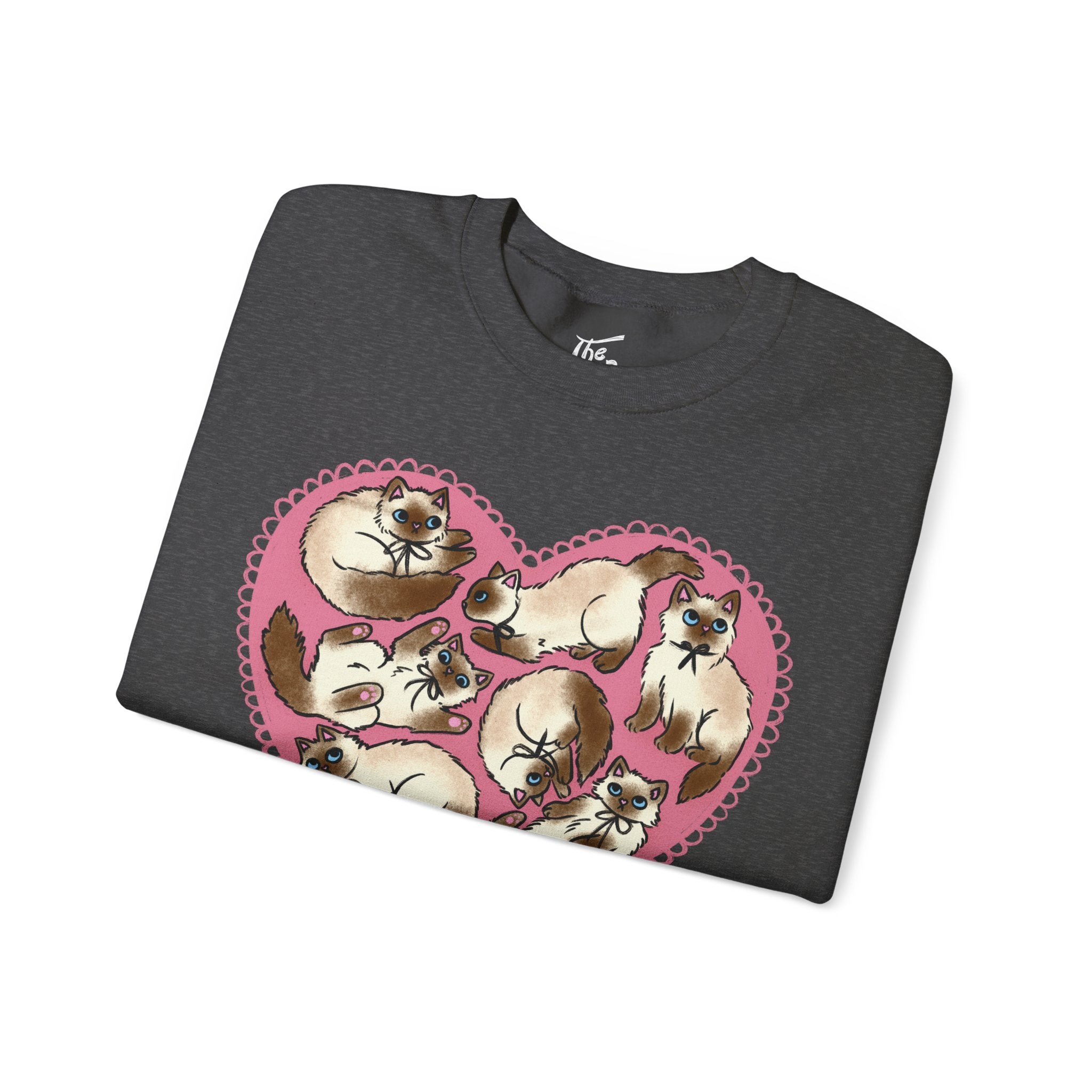Broadcast your undying affection for your cat! Soft, cozy, and playful, this crewneck sweatshirt speaks to anyone who carries a darling Siamese (or two-toned) cat in their heart at all times. Featuring a Pulp illustration of sweet Siamese cats curled inside a heart, accompanied by the simple declaration "CAT LOVER," this shirt is basically like a quiet hug from your pet!