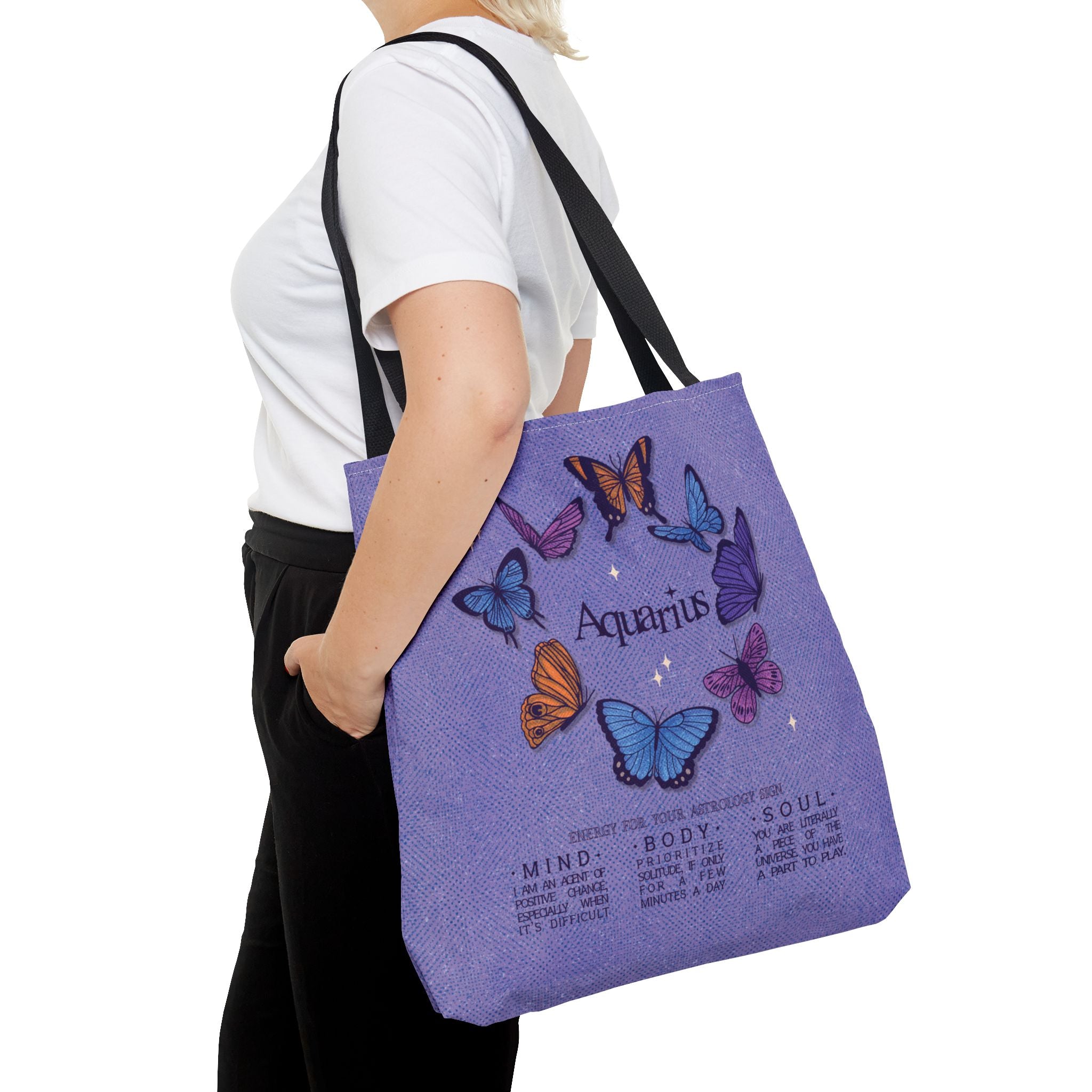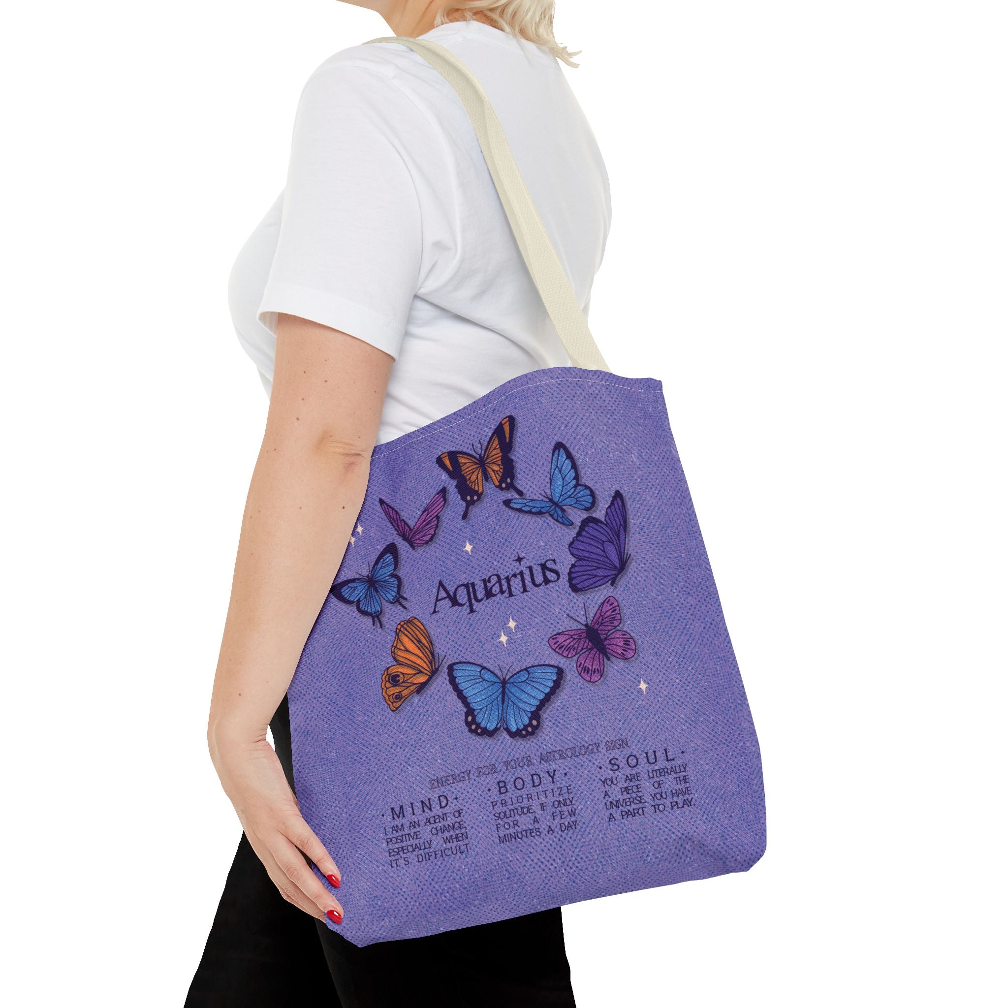 Aquarius cuties! Carry some reminders for your own life with this charming tote bag featuring cute butterflies and inspiring words of wisdom for the Aquarian mind, body, and soul. Ideal for carrying essentials, this tote bag is a must-have for Pisces individuals looking to showcase their zodiac pride. Great for gifting during birthdays, astrology-themed events, or for everyday use.