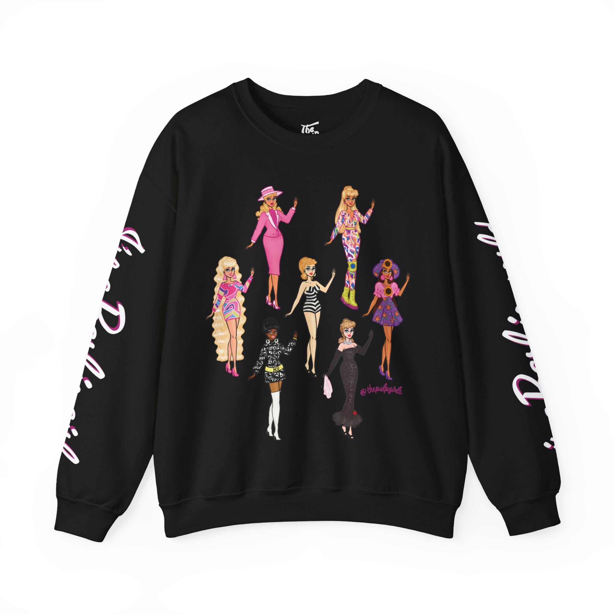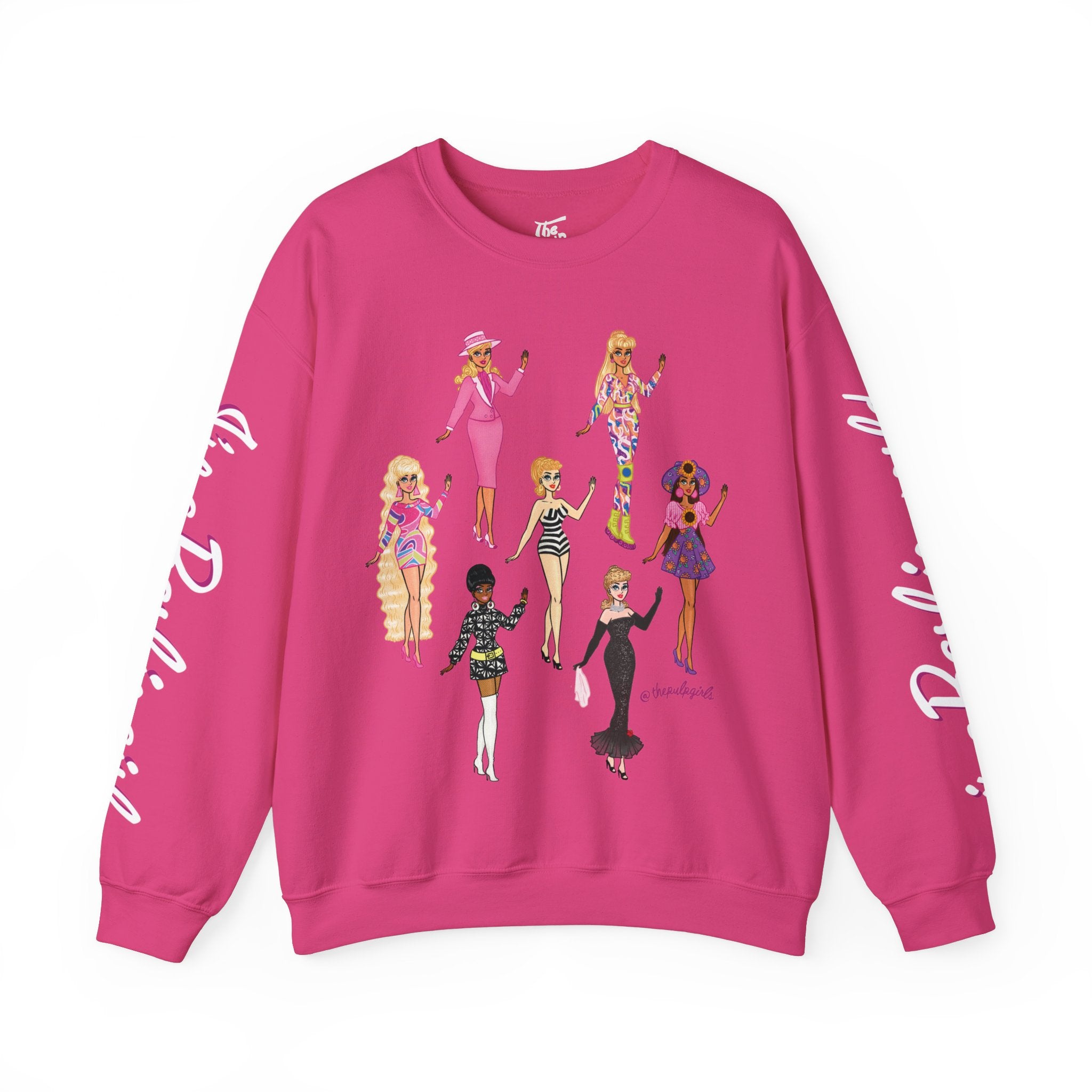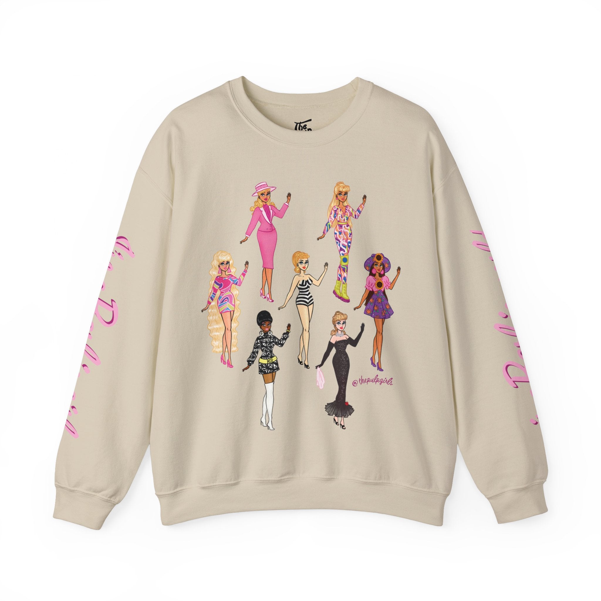 True Barbie babes are gonna need this super comfy crewneck sweatshirt! Featuring seven Pulp fan art drawings of classic Barbies on the front and "I'm a Barbie girl" on one sleeve & "in a Barbie world!" on on the other, this crewneck is perfect for all doll fans and barbiecore lovers!