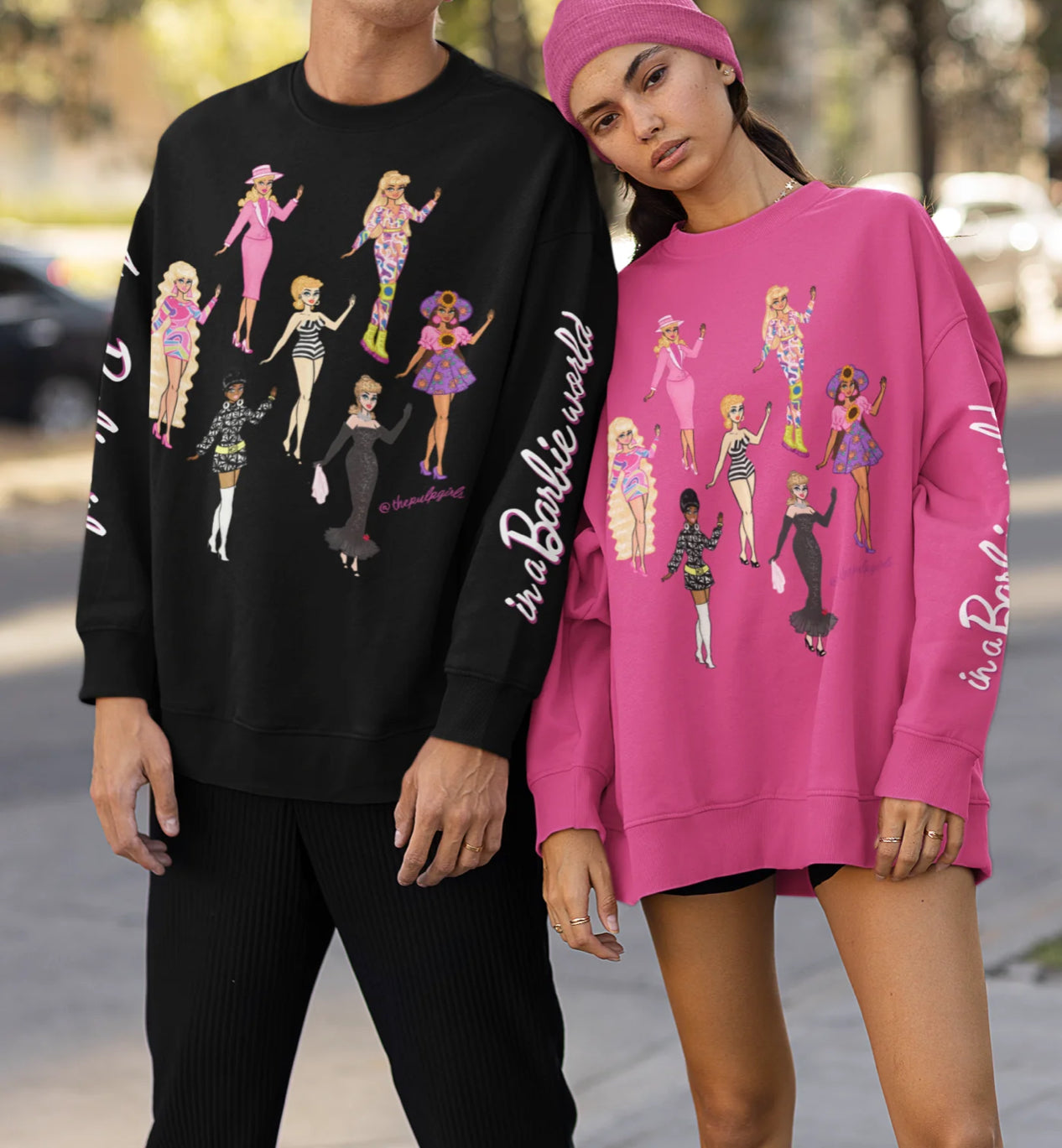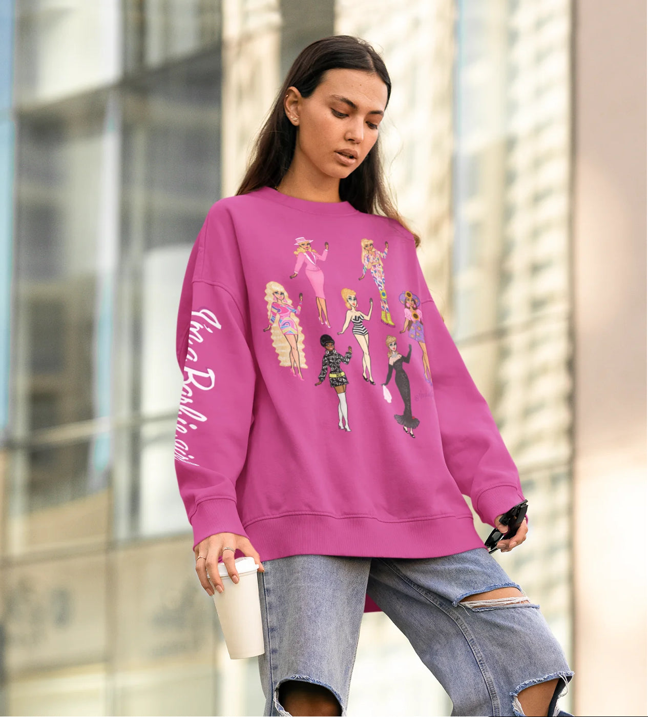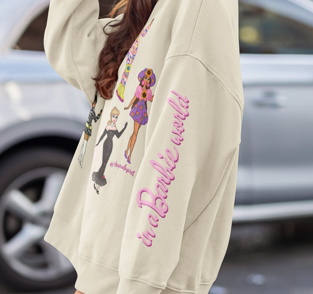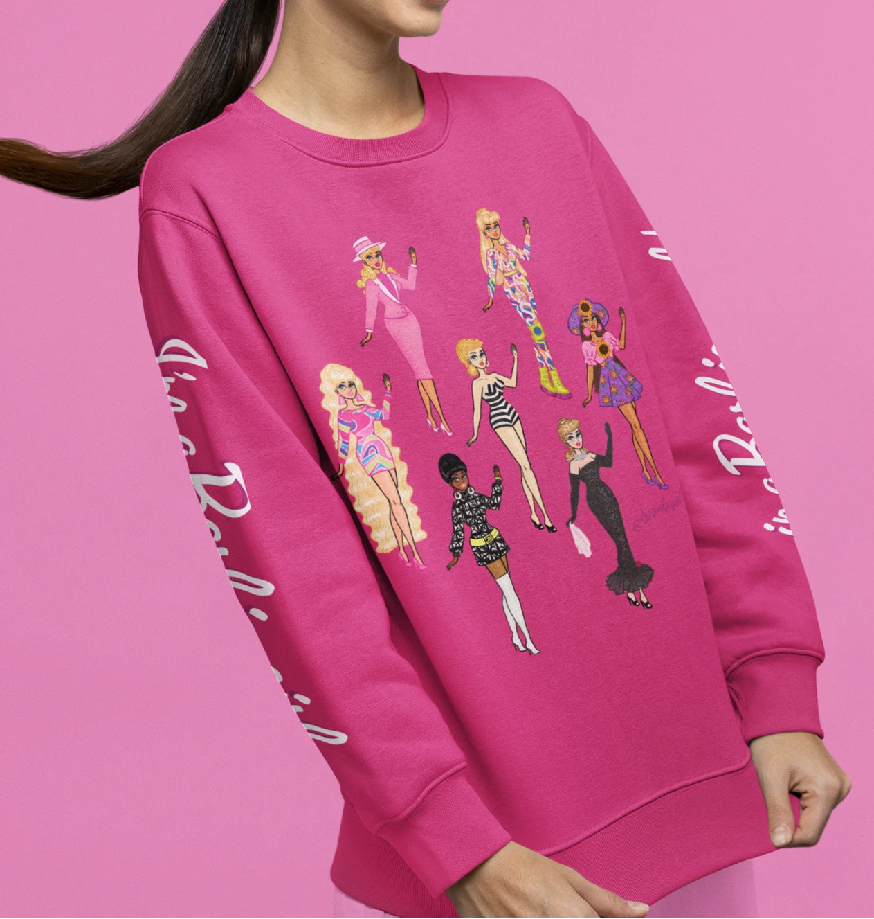 True Barbie babes are gonna need this super comfy crewneck sweatshirt! Featuring seven Pulp fan art drawings of classic Barbies on the front and "I'm a Barbie girl" on one sleeve & "in a Barbie world!" on on the other, this crewneck is perfect for all doll fans and barbiecore lovers!