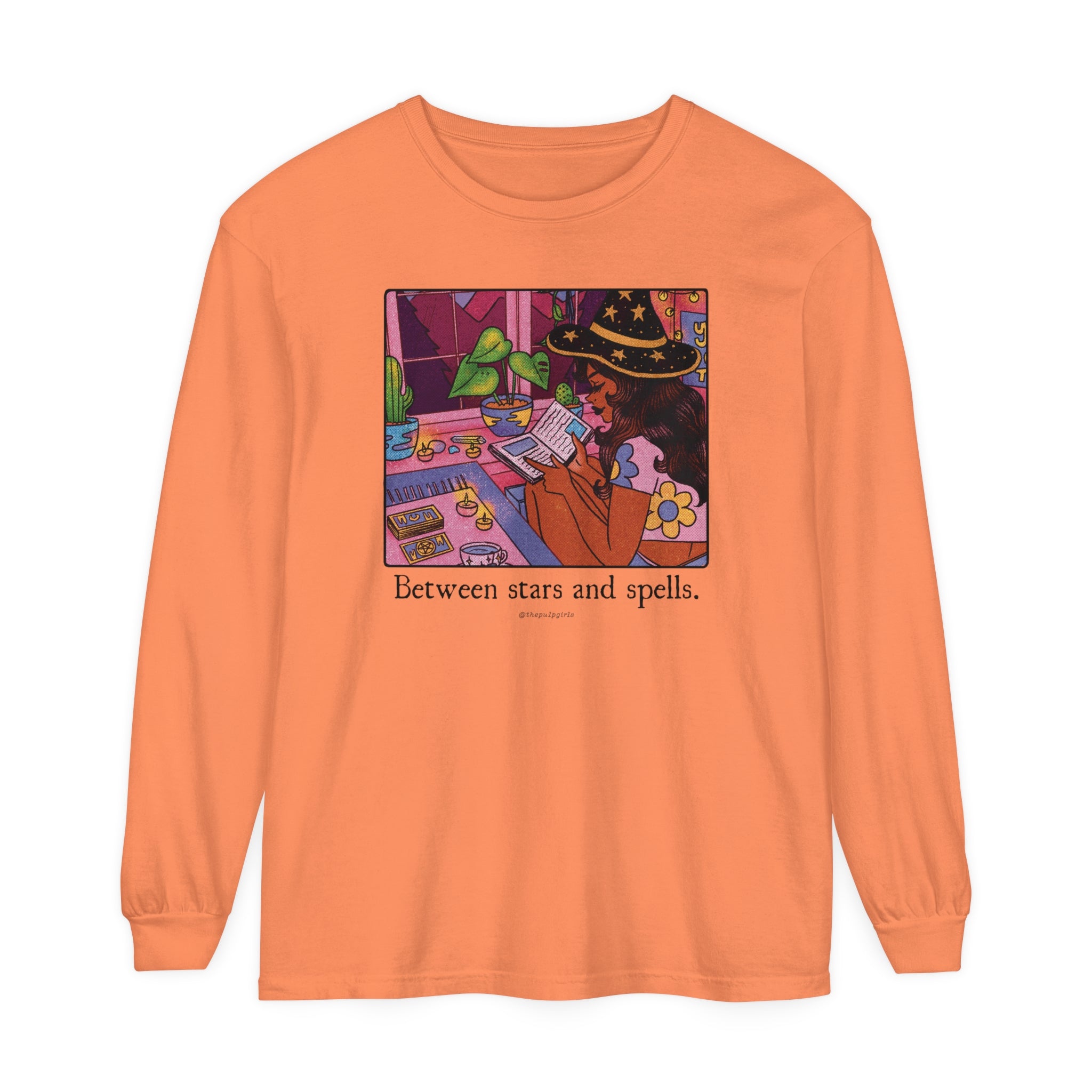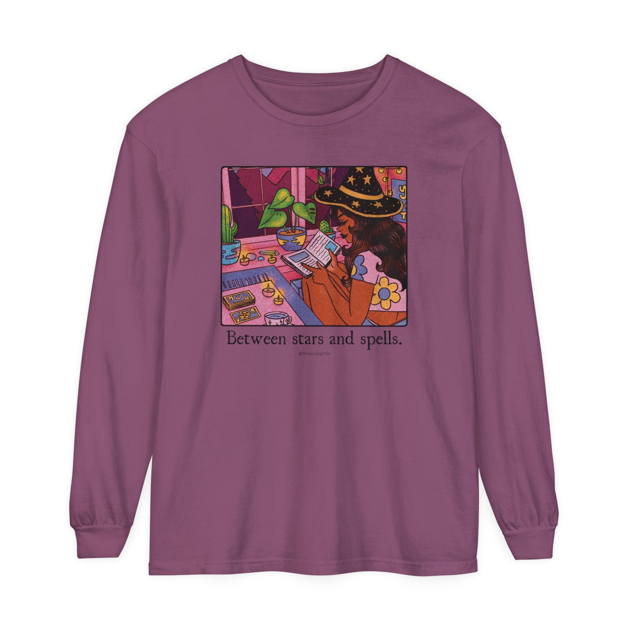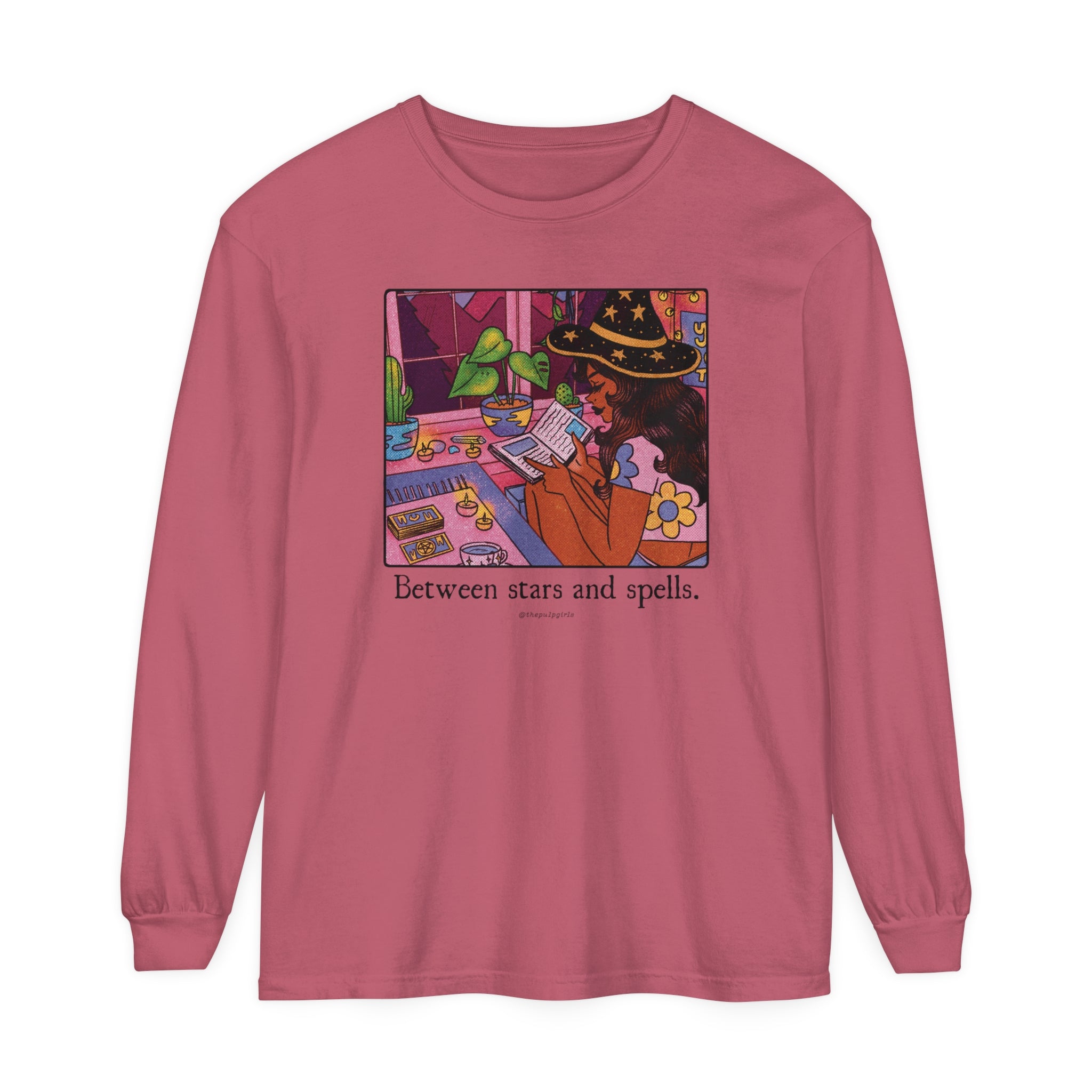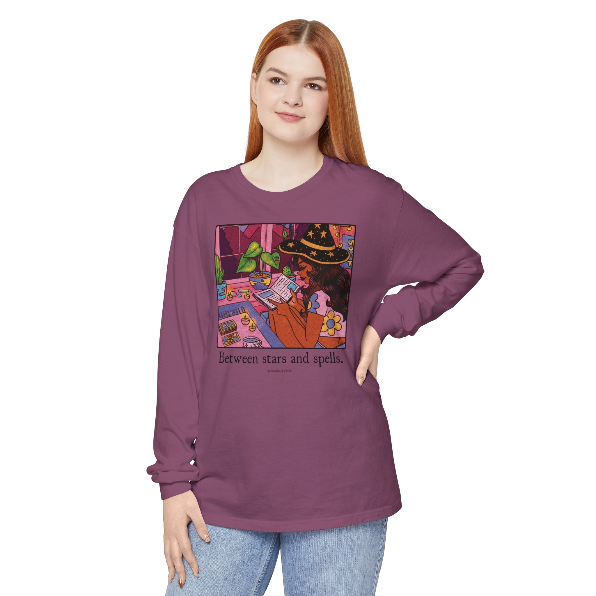 Long-sleeved tee featuring a witch besties reading in a cozy cottage. Perfect for those who love witchy aesthetics and want to embrace their inner magic. Ideal for Halloween, witchcraft enthusiasts, and anyone looking to add a touch of the supernatural to their wardrobe.