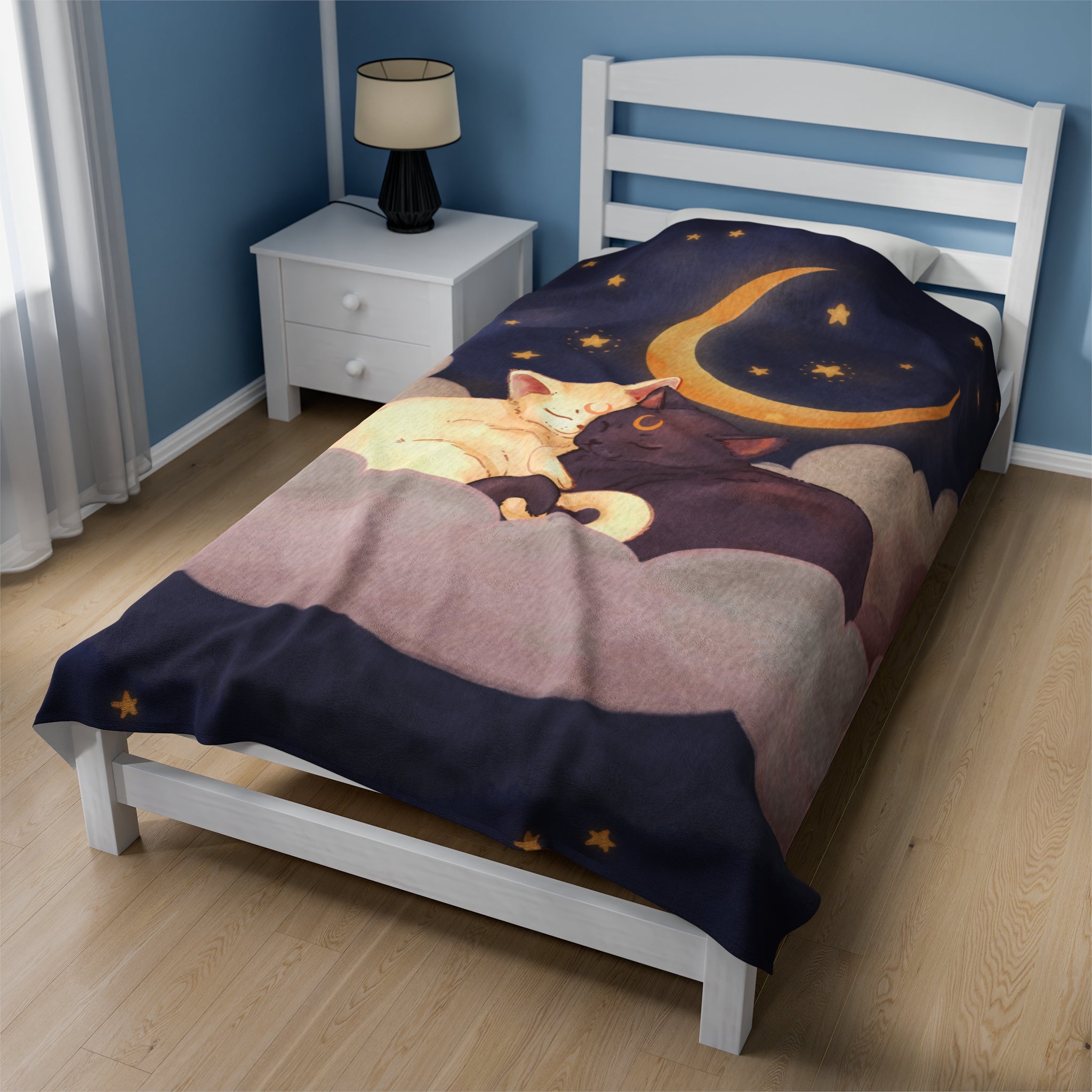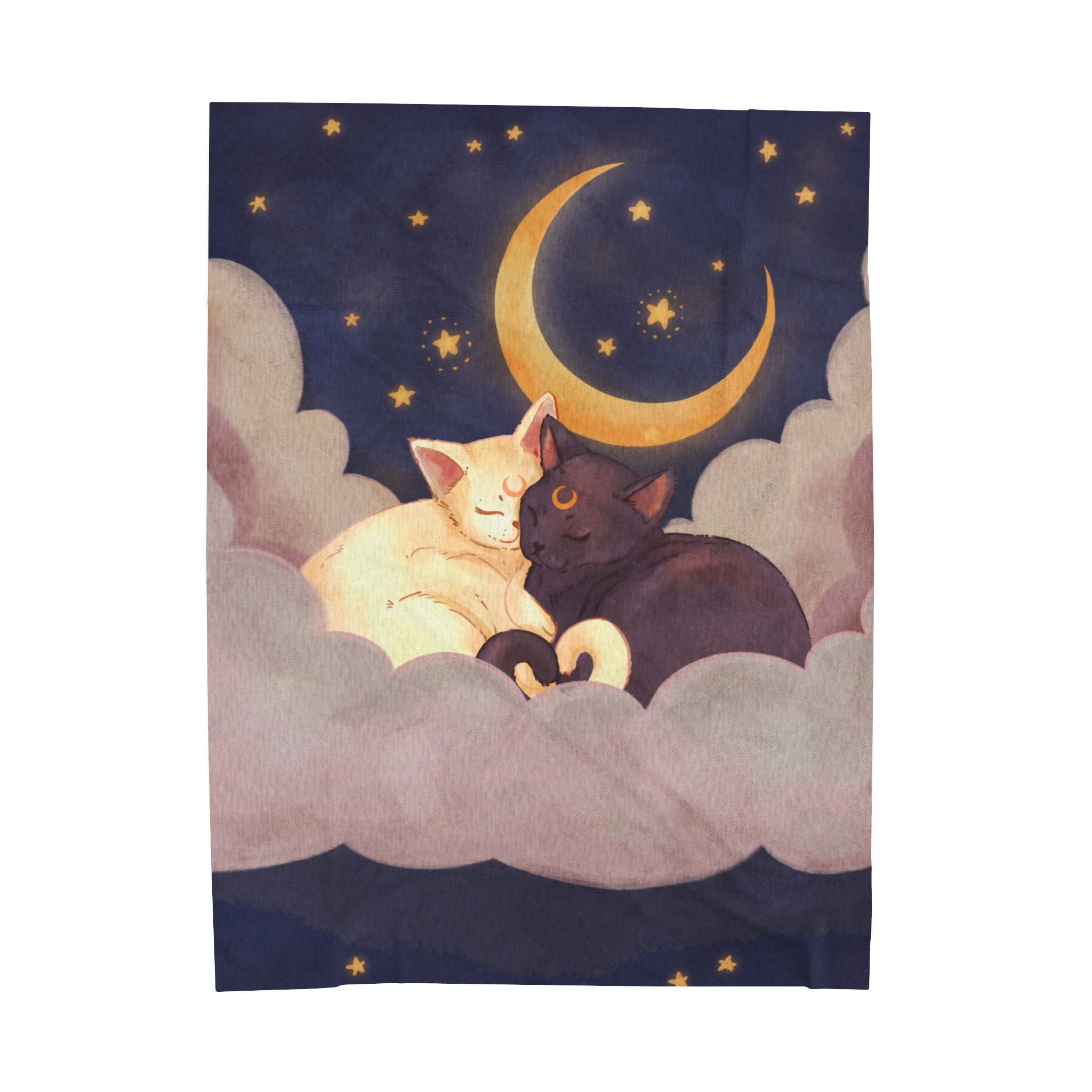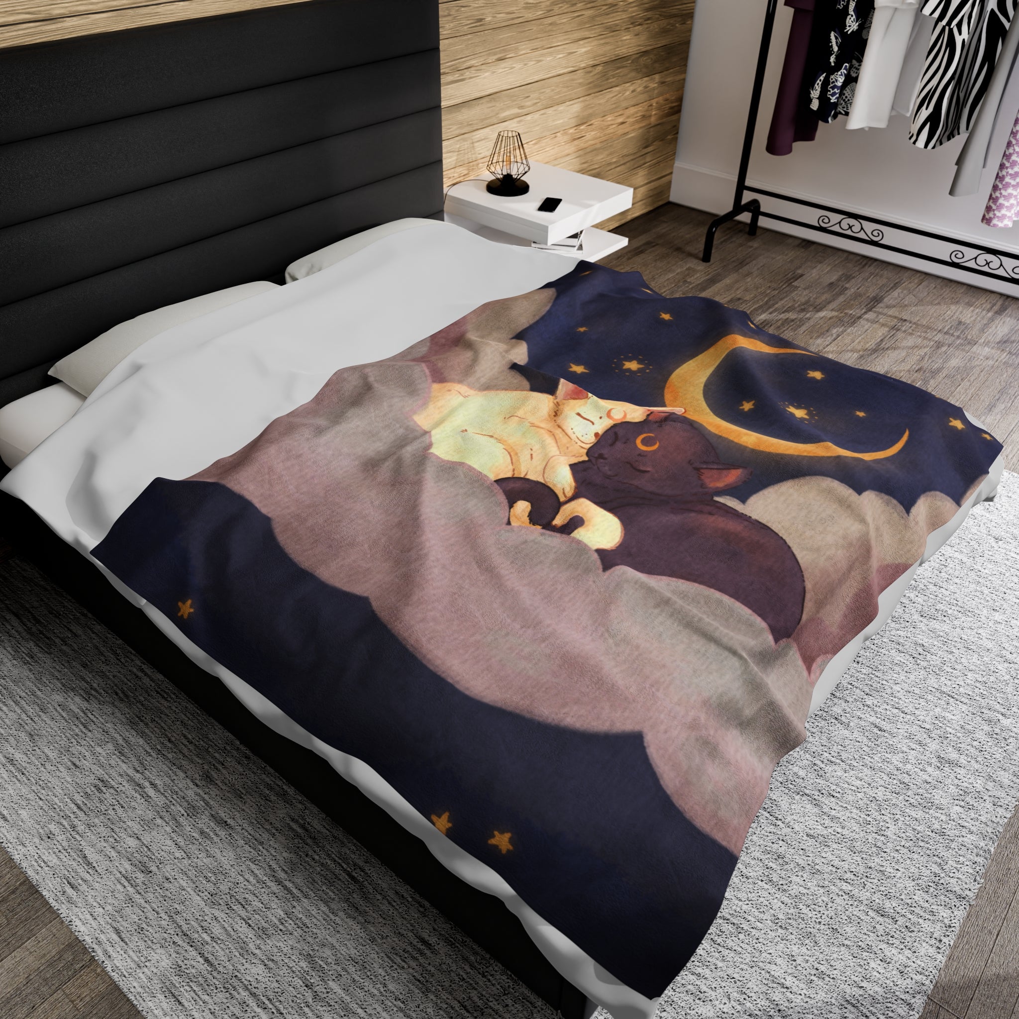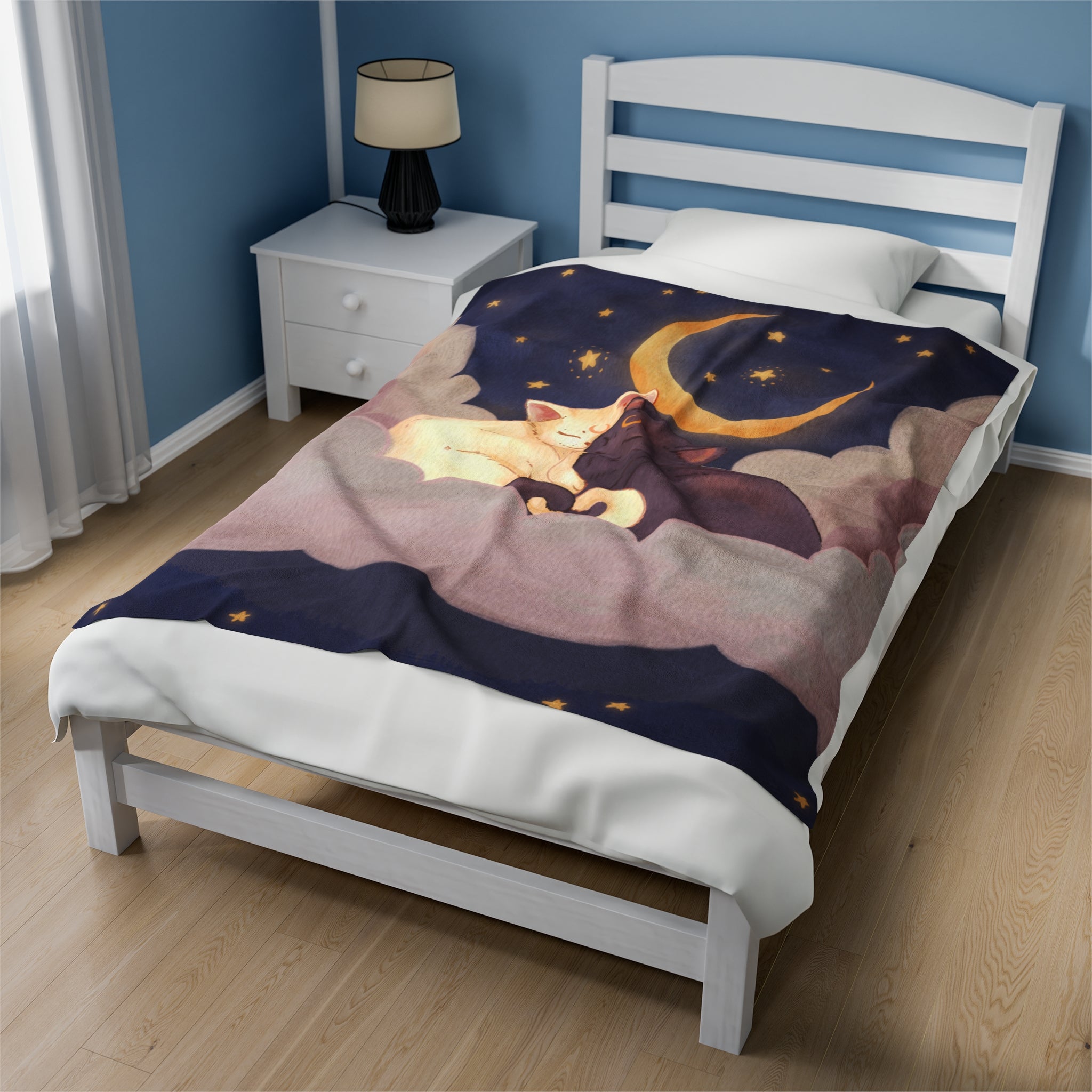 A cozy & warm cosmic blanket featuring two sweet, loving cats curled up together in a starry night sky, Pulp style! Perfect for cat lovers and those who enjoy a peaceful, serene atmosphere. Ideal for gifting during the holidays or to add a touch of comfort to any room. Choose from 50" x 60" or 60" x 80" sizing.