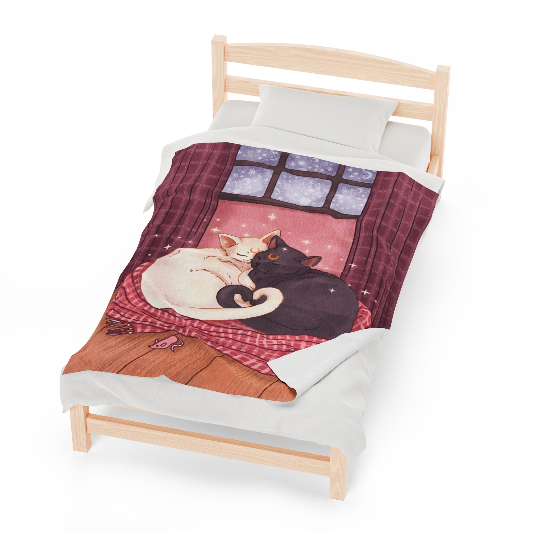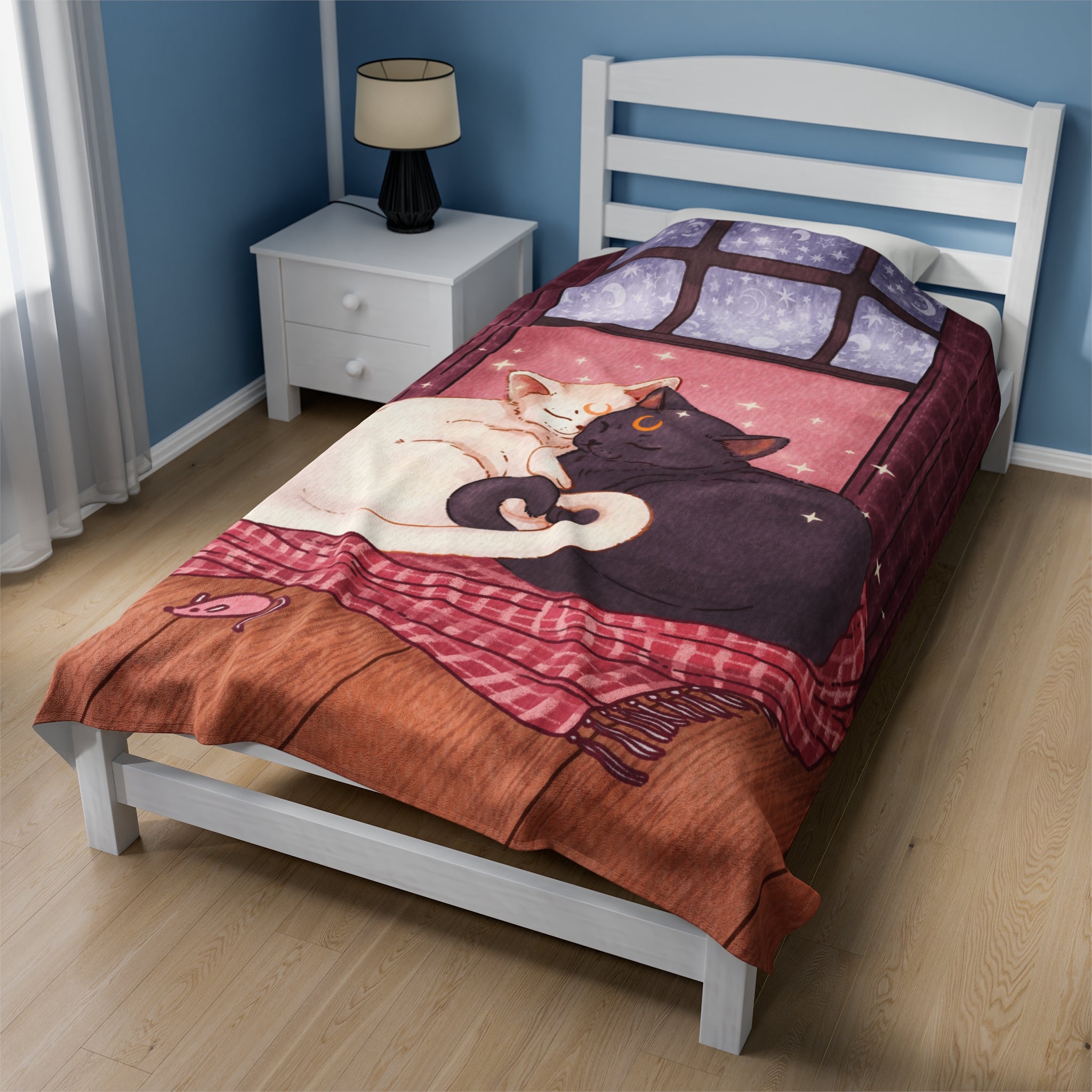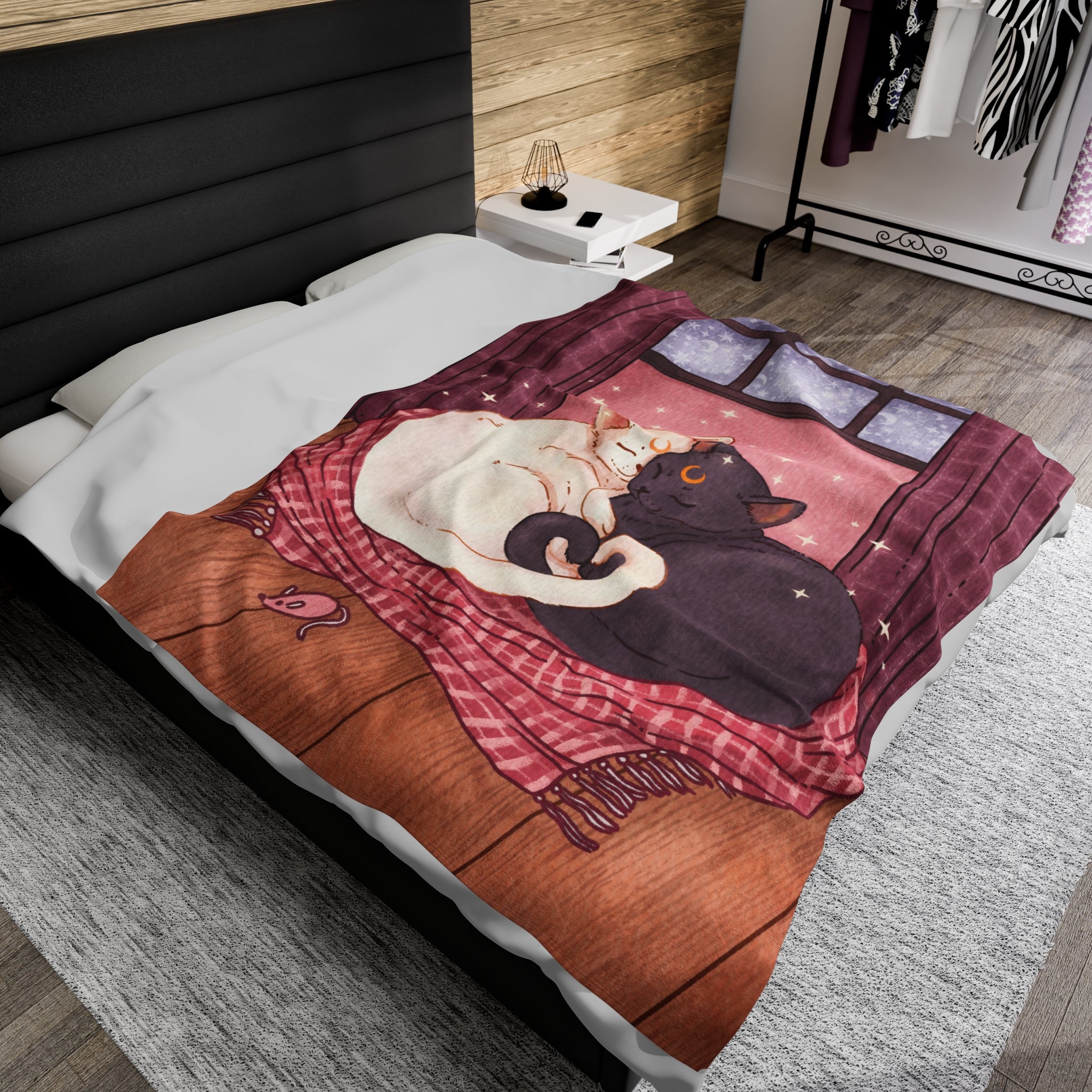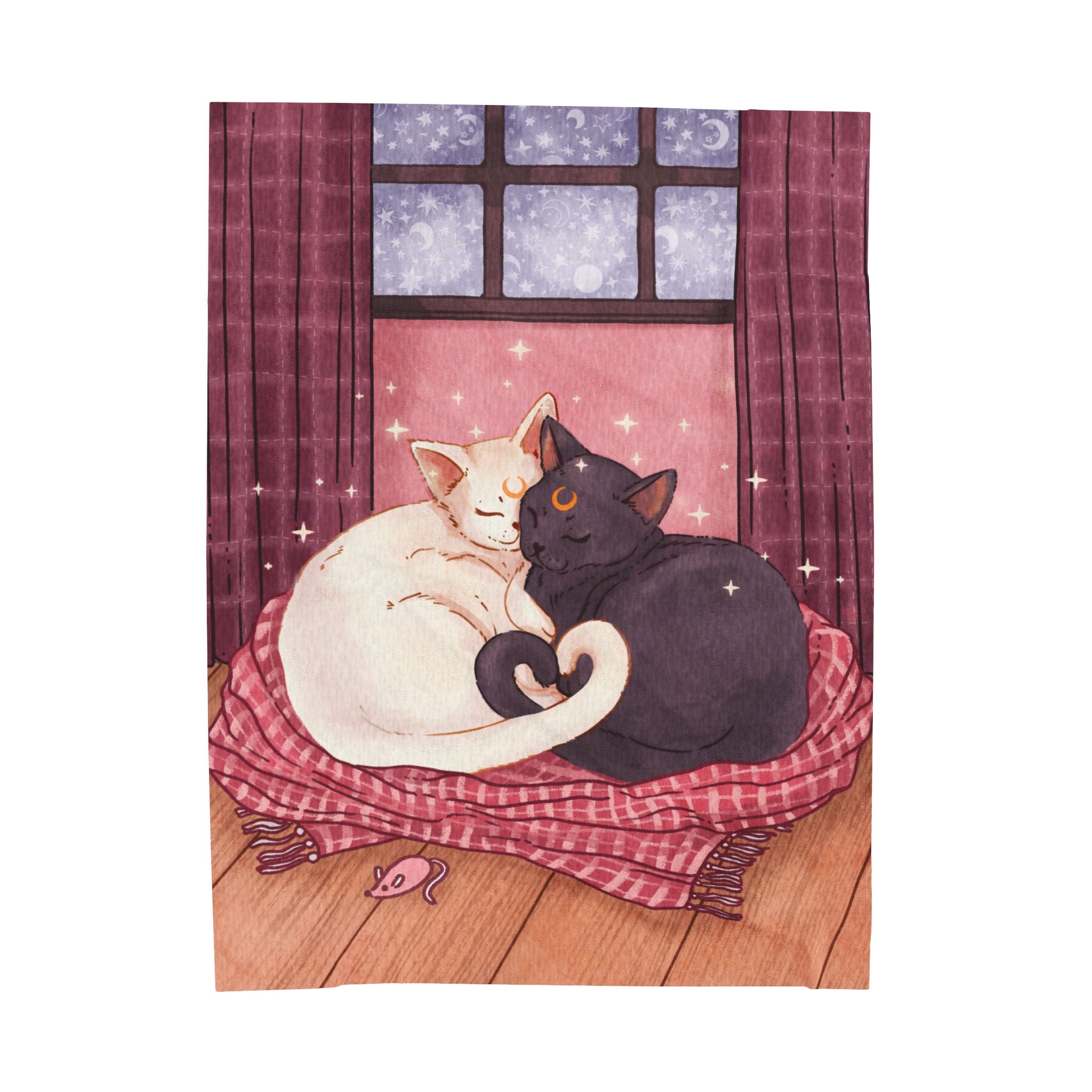 A cozy & warm homebody blanket featuring two sweet, loving cats curled up together in a cozy hygge scene, Pulp style! Perfect for cat lovers and those who enjoy a peaceful, serene atmosphere. Ideal for gifting during the holidays or to add a touch of comfort to any room. Choose from 50" x 60" or 60" x 80" sizing.