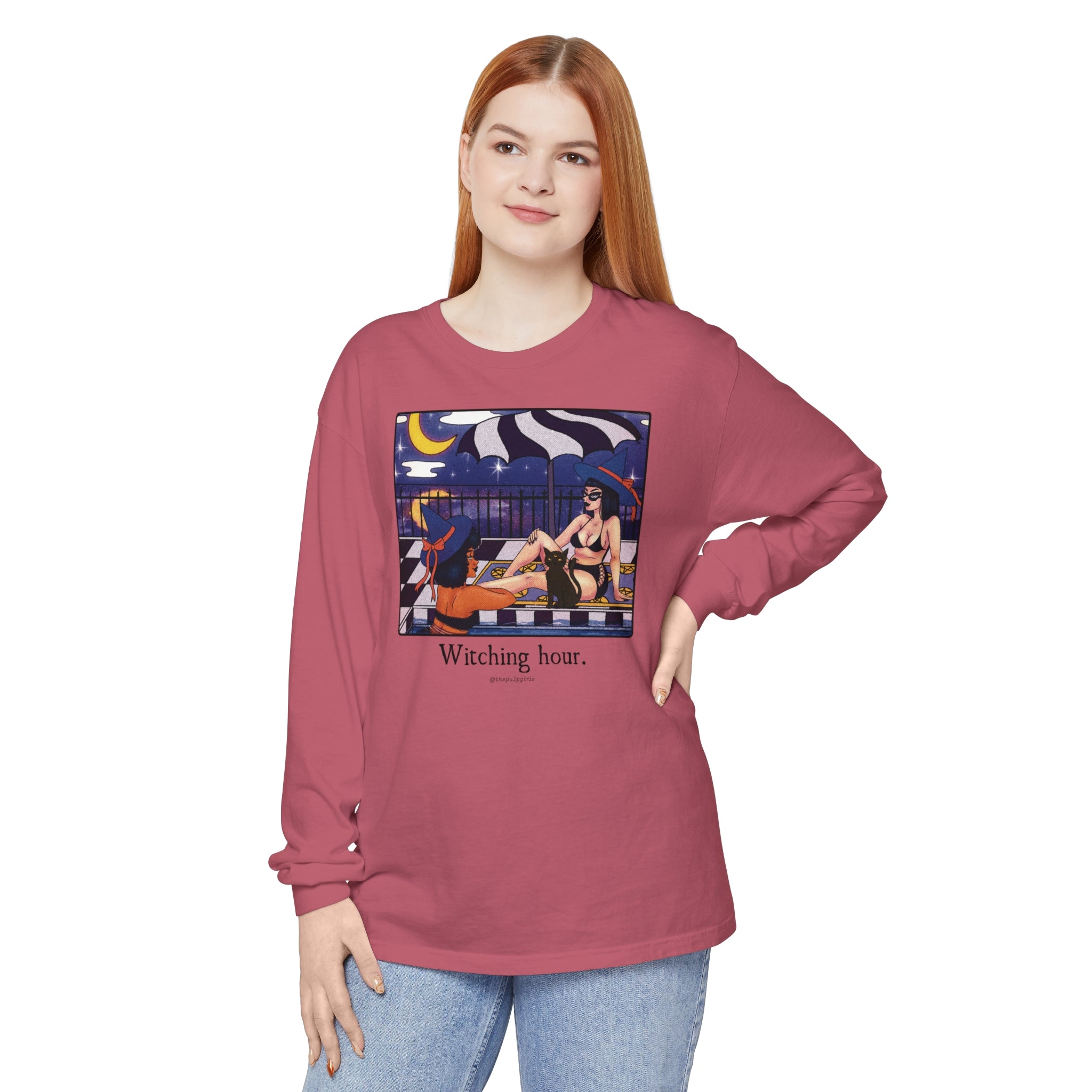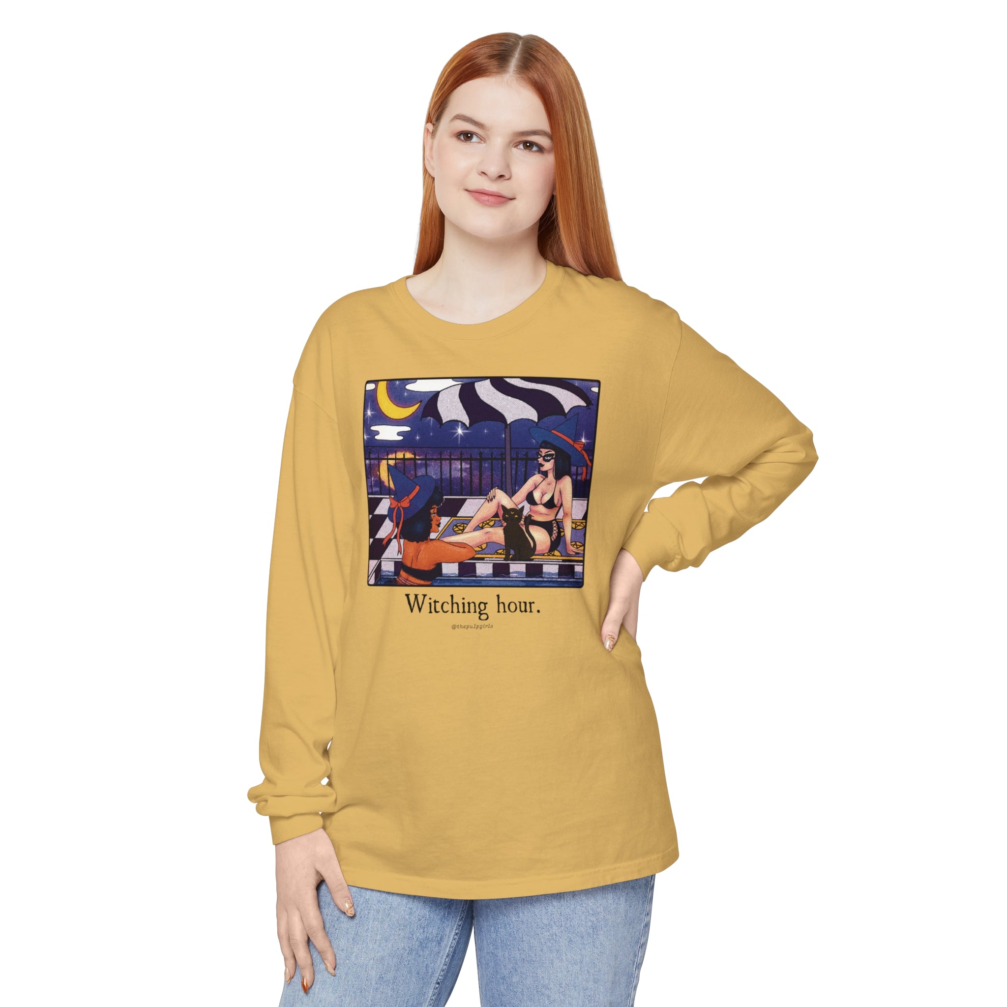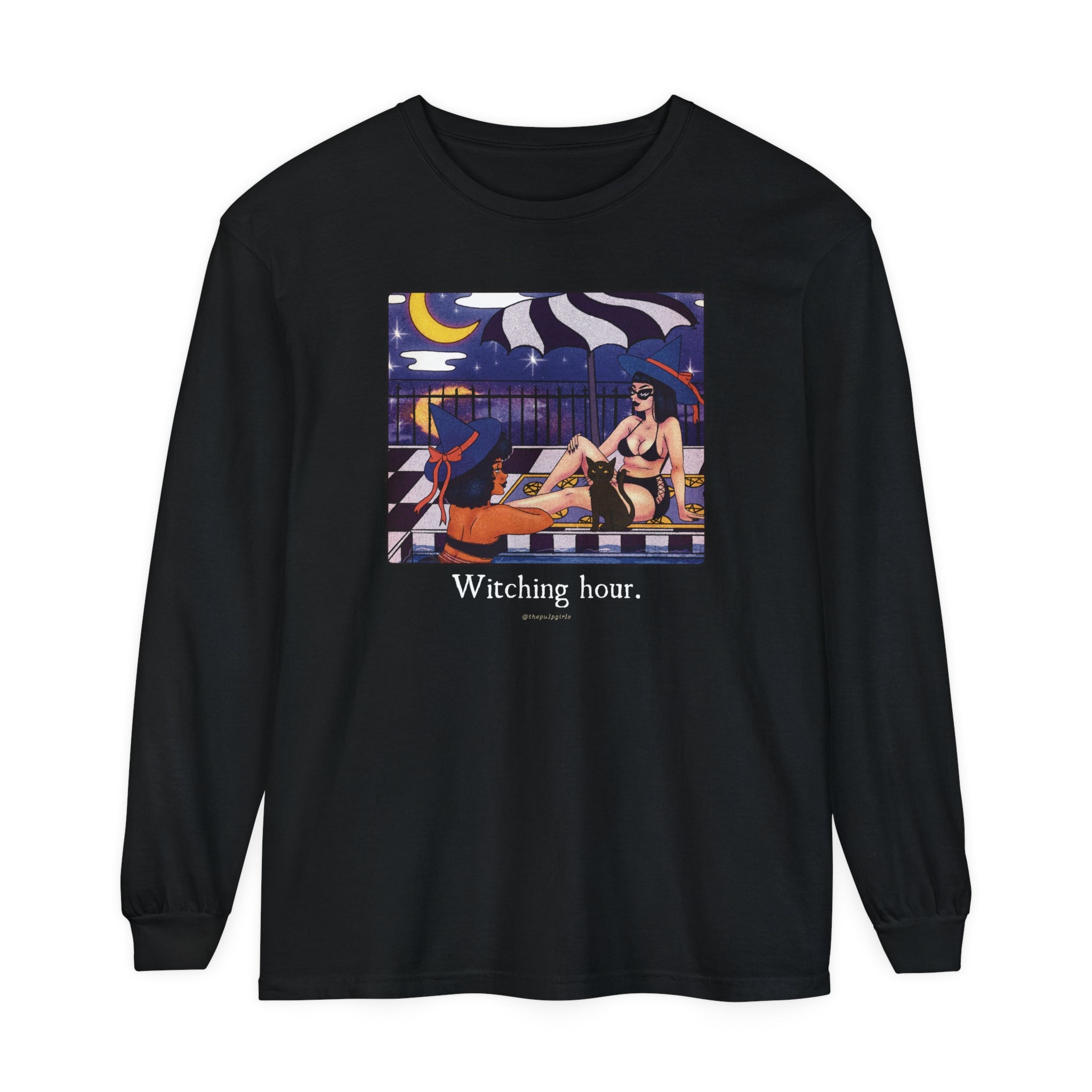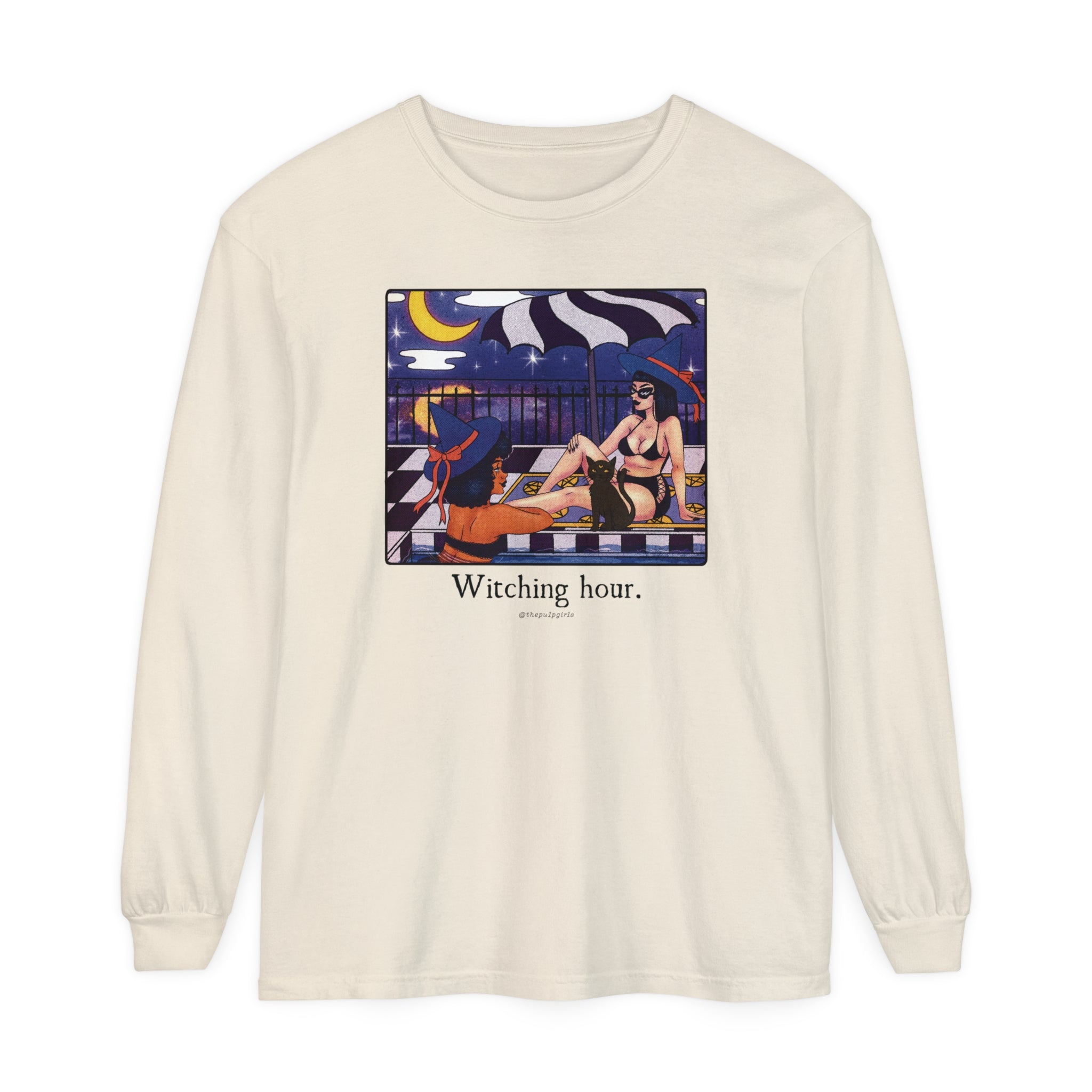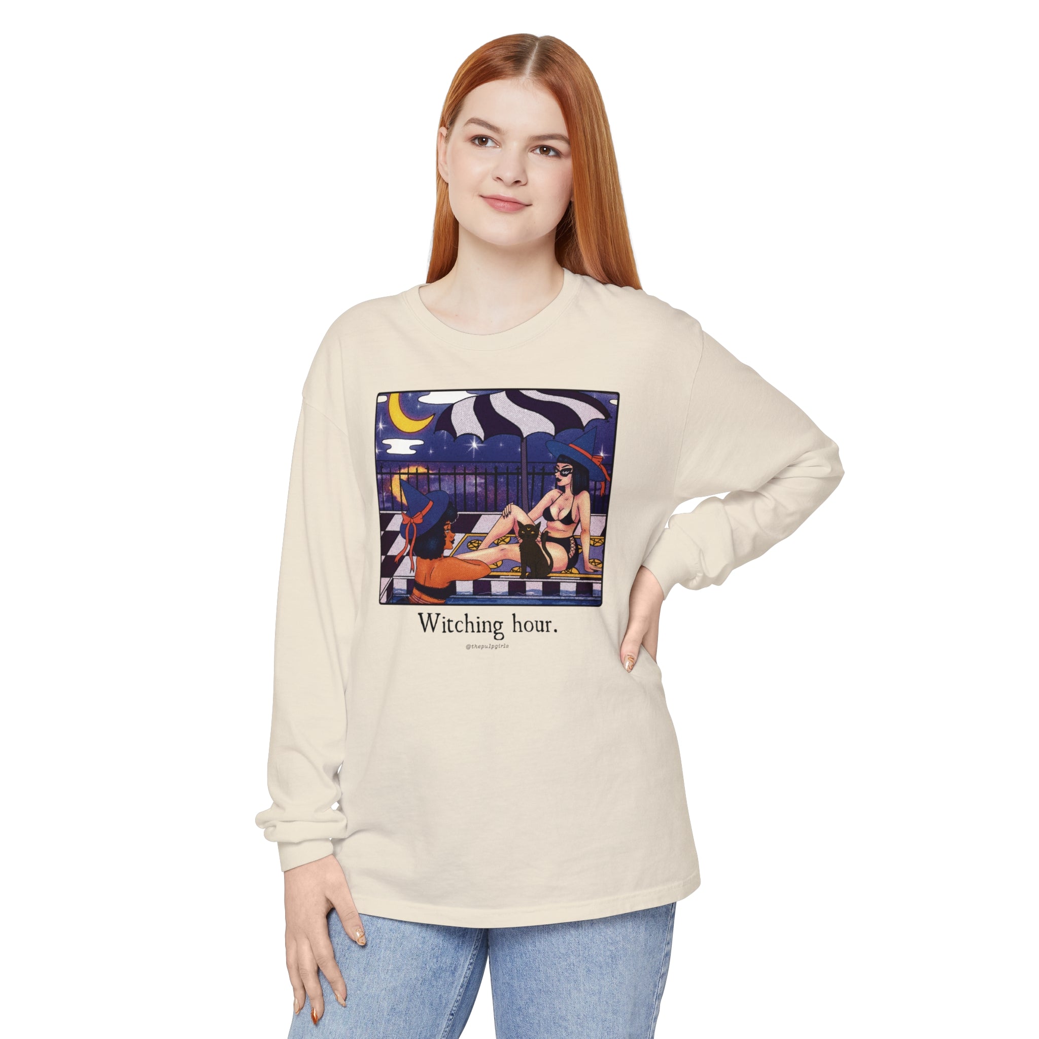 Long-sleeved tee featuring two witch besties chilling under the moon. Perfect for those who love witchy aesthetics and want to embrace their inner magic. Ideal for Halloween, witchcraft enthusiasts, and anyone looking to add a touch of the supernatural to their wardrobe.