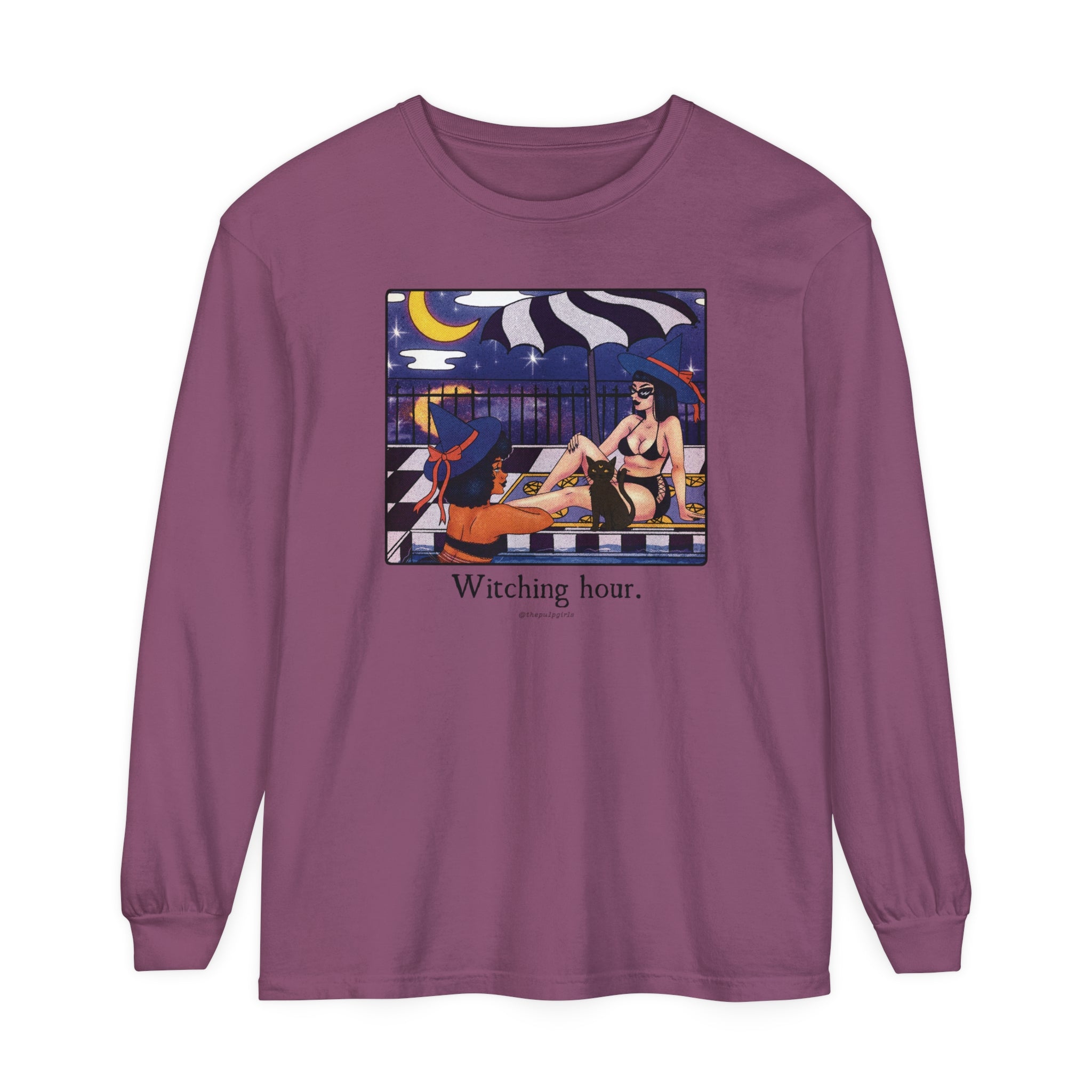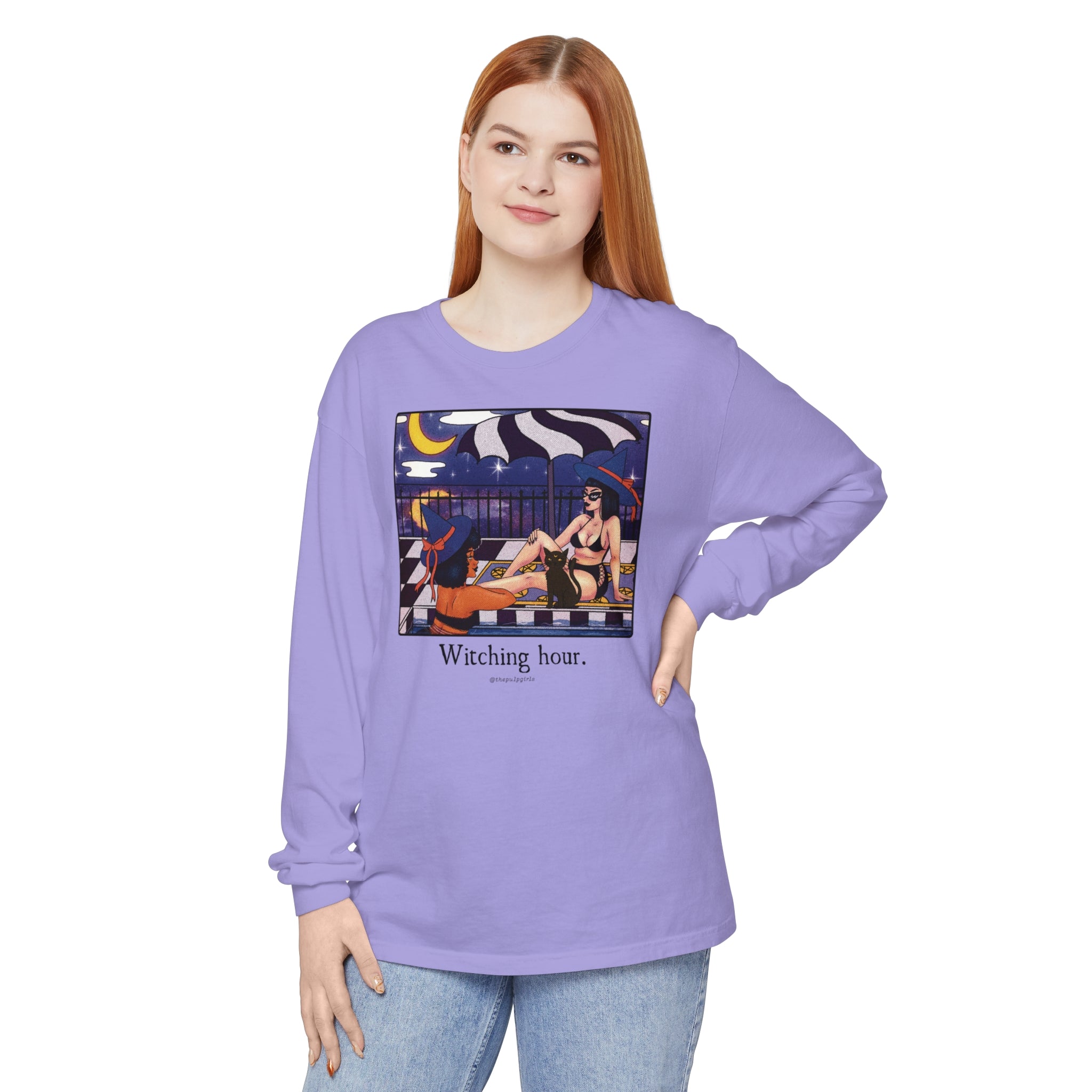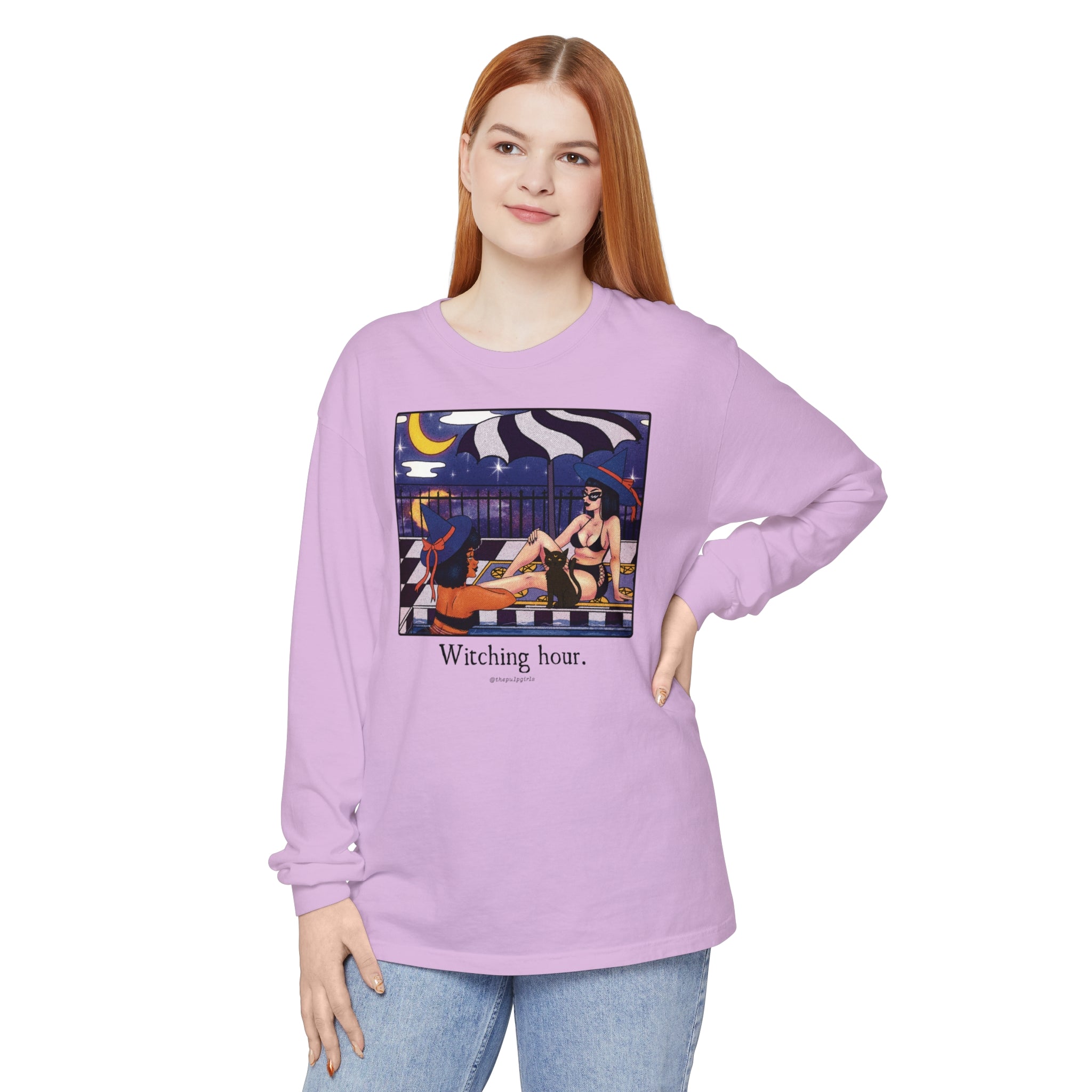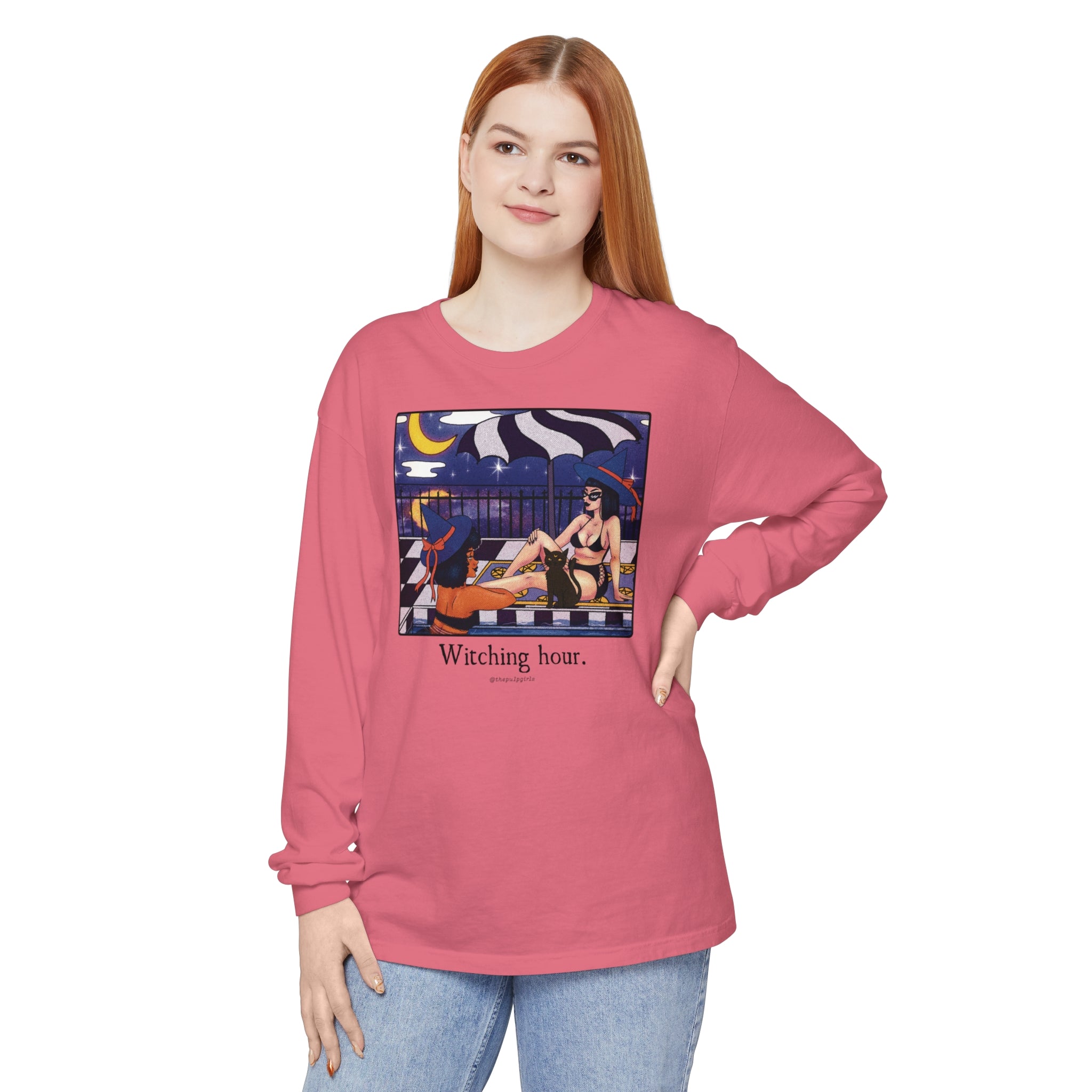 Long-sleeved tee featuring two witch besties chilling under the moon. Perfect for those who love witchy aesthetics and want to embrace their inner magic. Ideal for Halloween, witchcraft enthusiasts, and anyone looking to add a touch of the supernatural to their wardrobe.