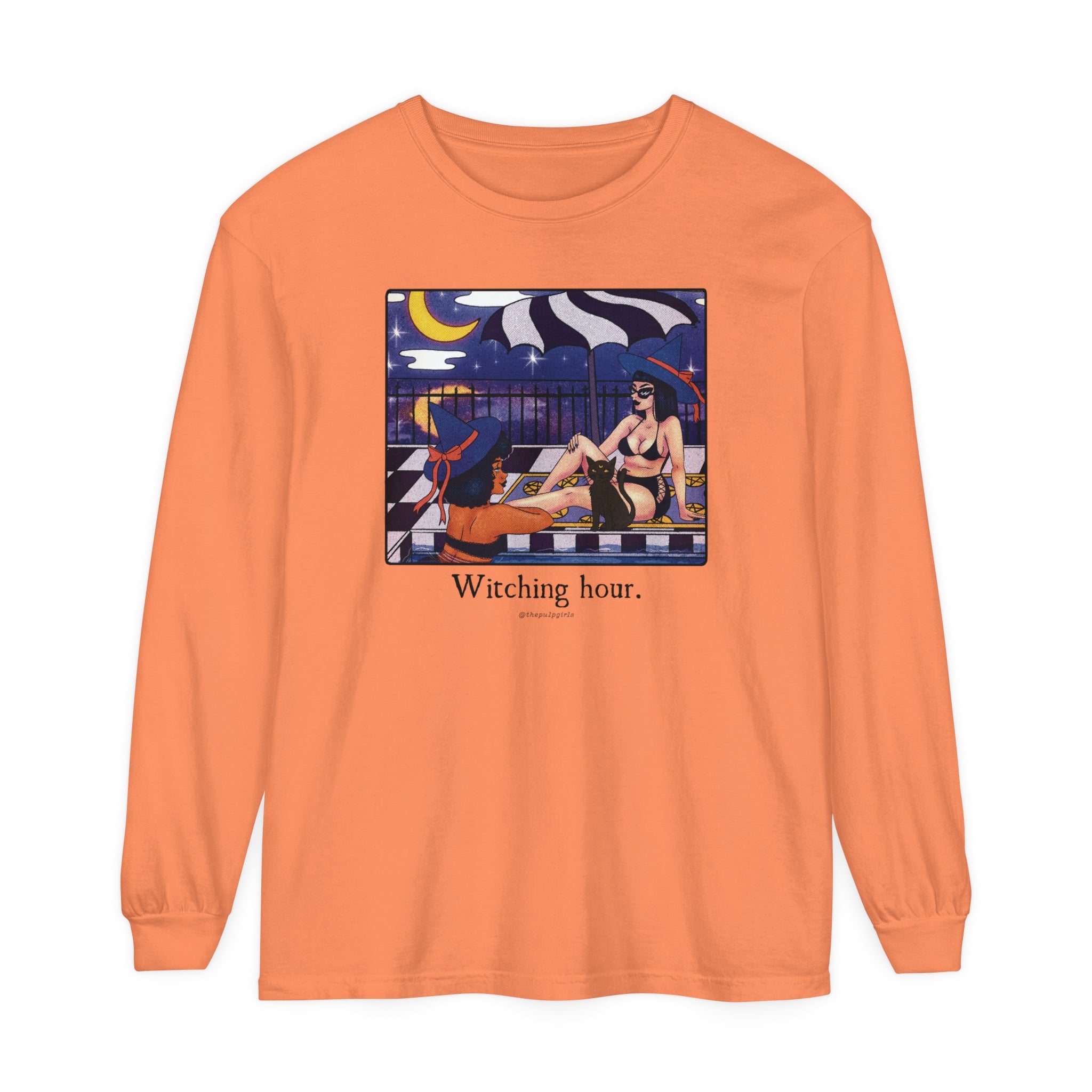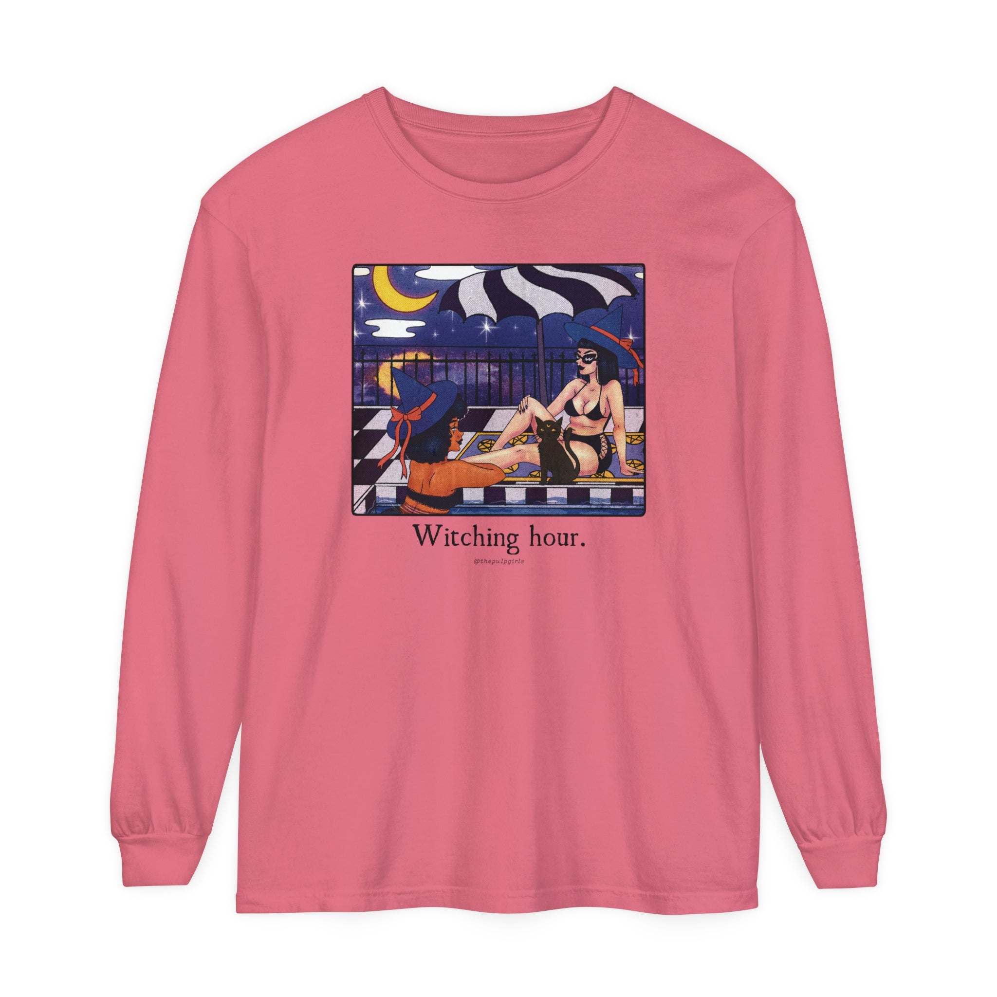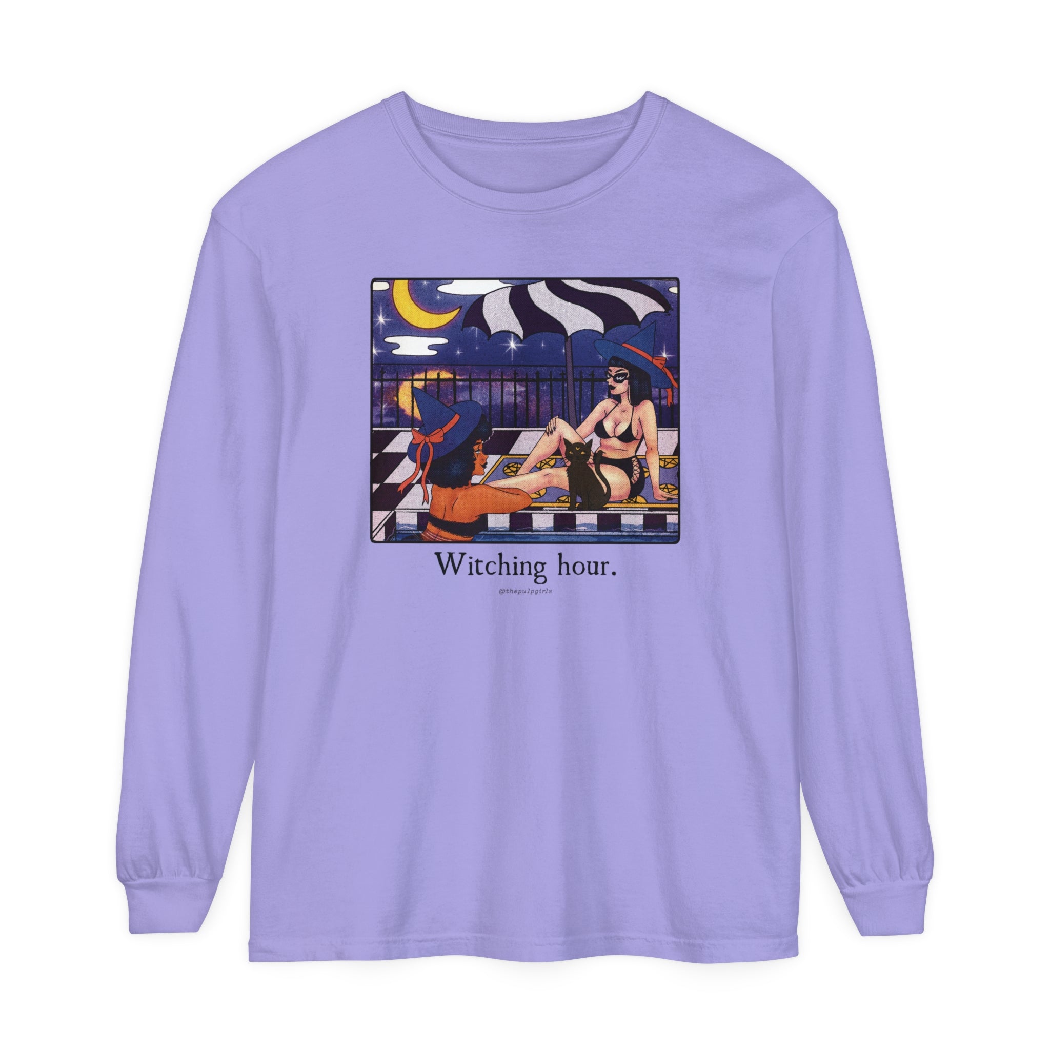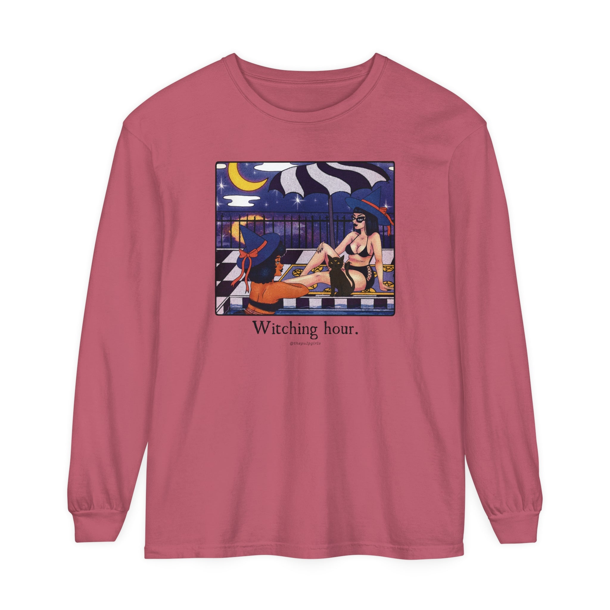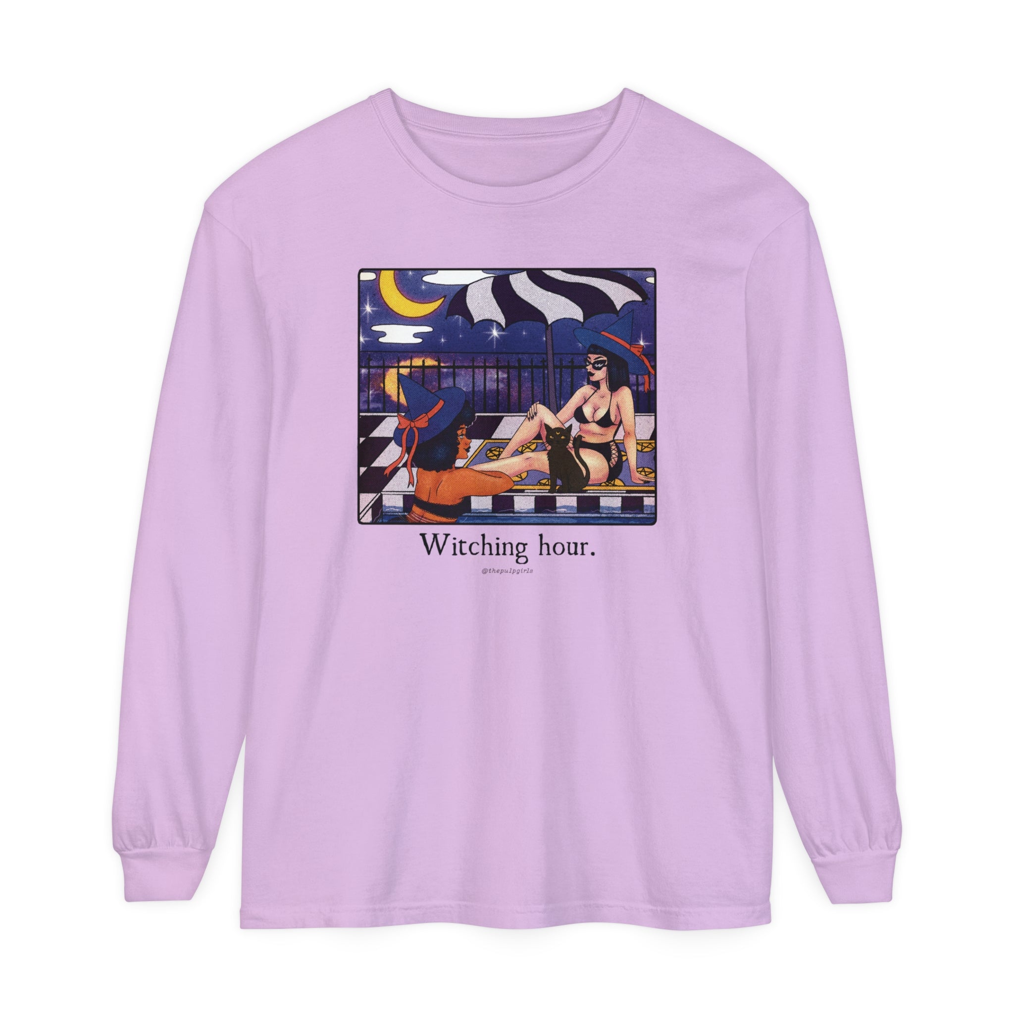 Long-sleeved tee featuring two witch besties chilling under the moon. Perfect for those who love witchy aesthetics and want to embrace their inner magic. Ideal for Halloween, witchcraft enthusiasts, and anyone looking to add a touch of the supernatural to their wardrobe.