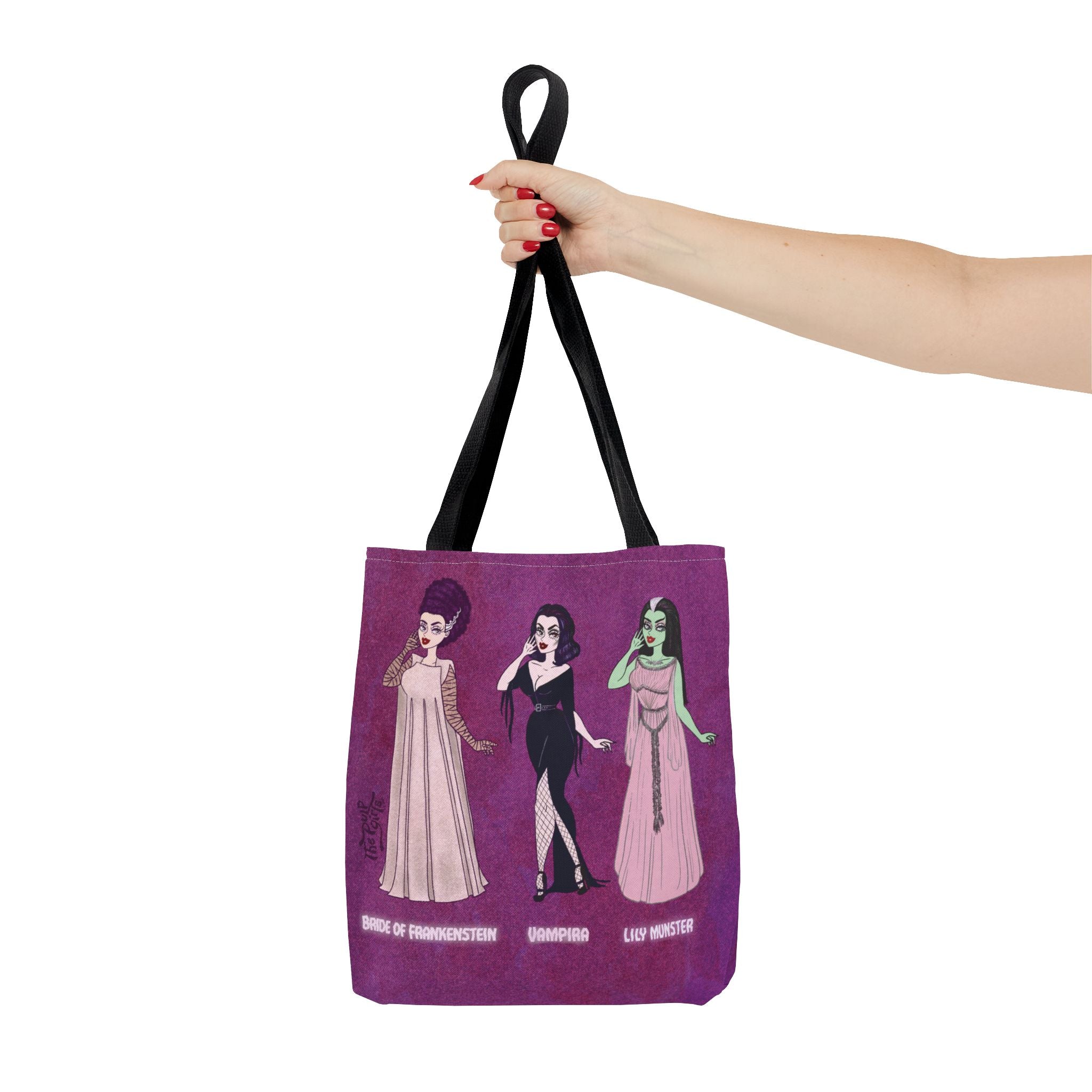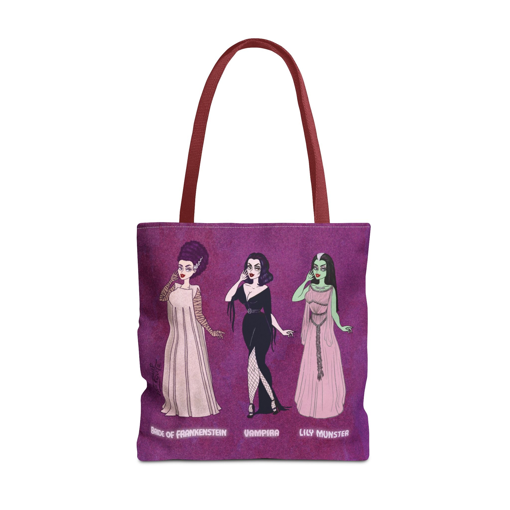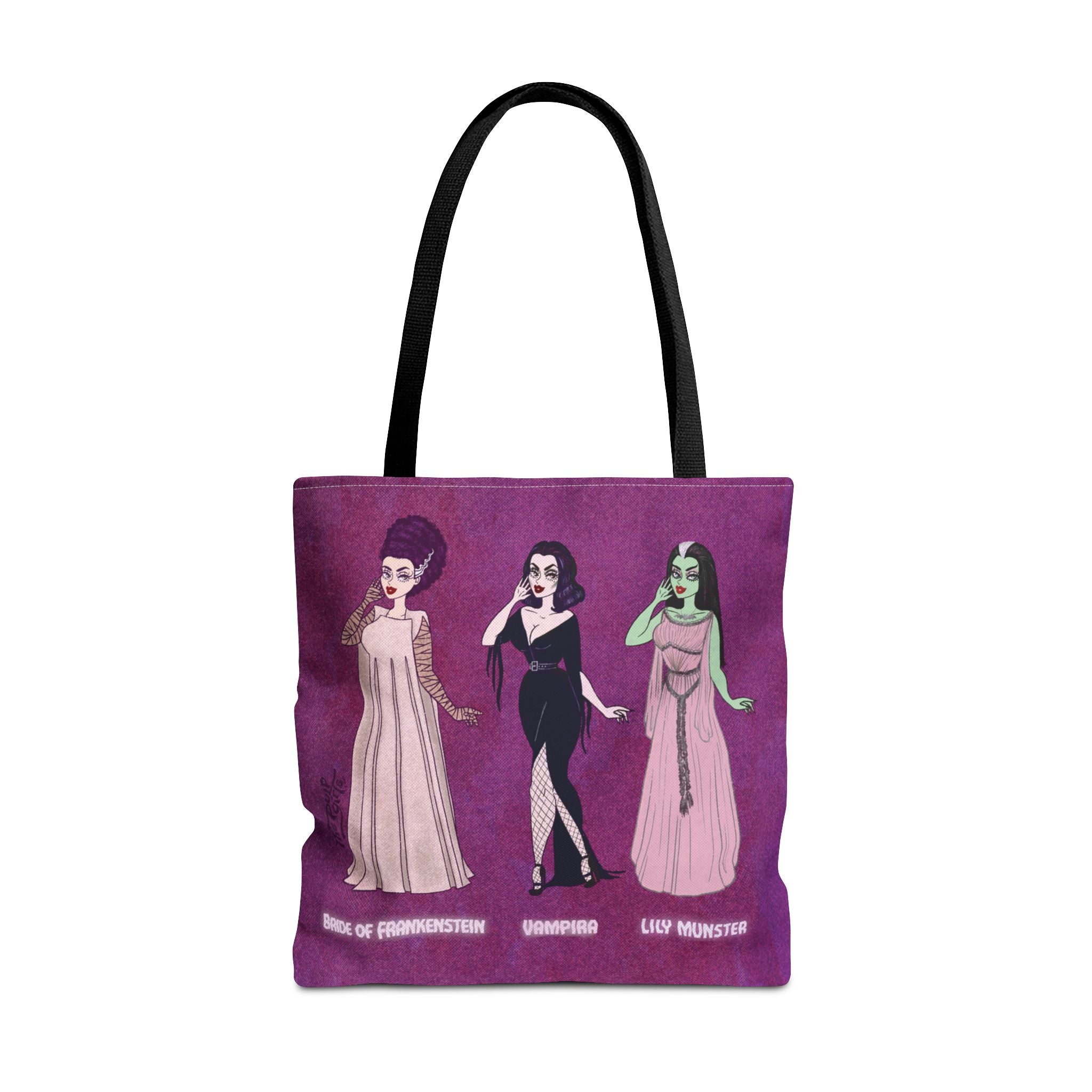 🧡Spooky Queens are forever!🧡 Show off your love for these horror movie icons on this heavy-duty, roomy tote. Featuring Pulp drawings of your favorite monster babes and witch queens alike, along with a black or red handles.