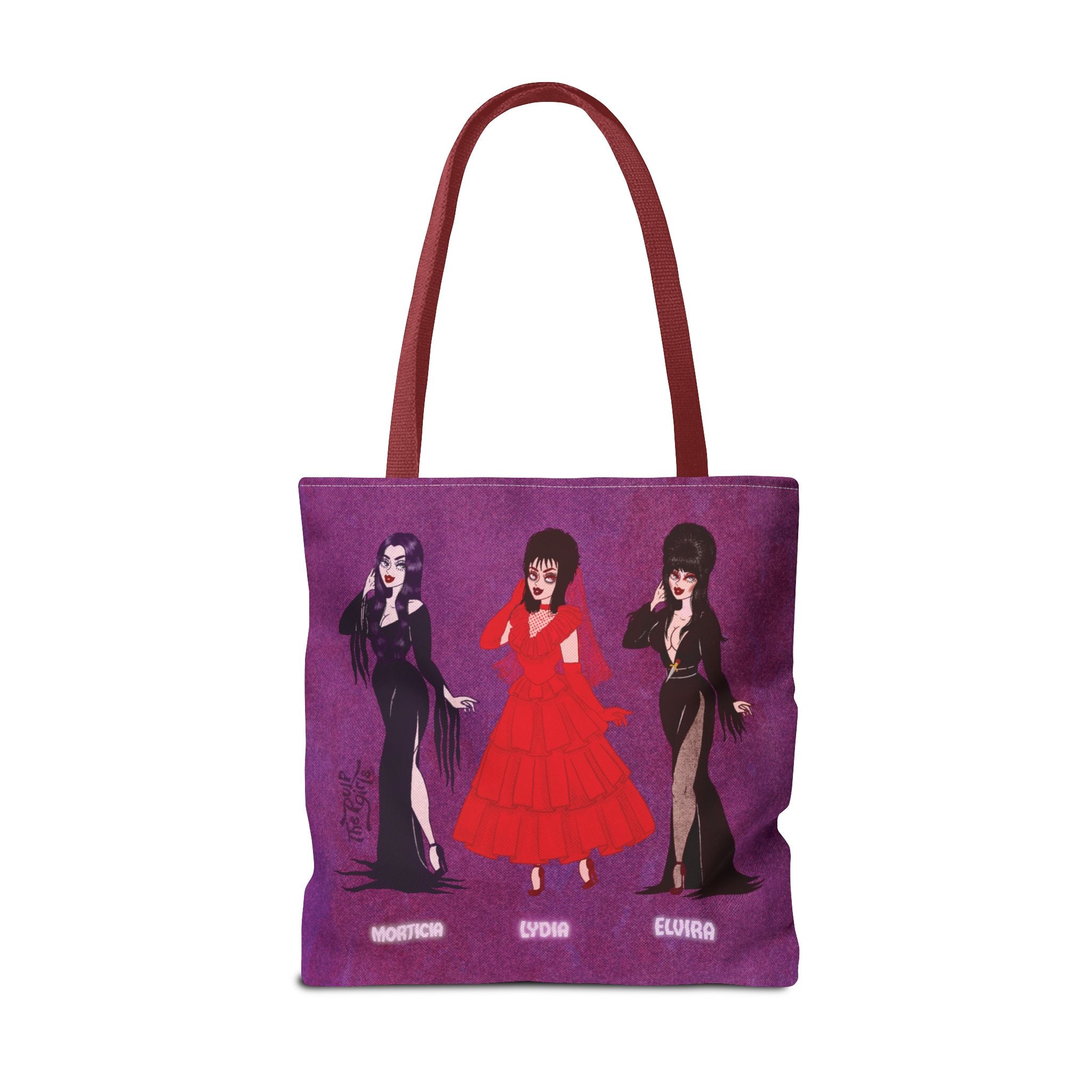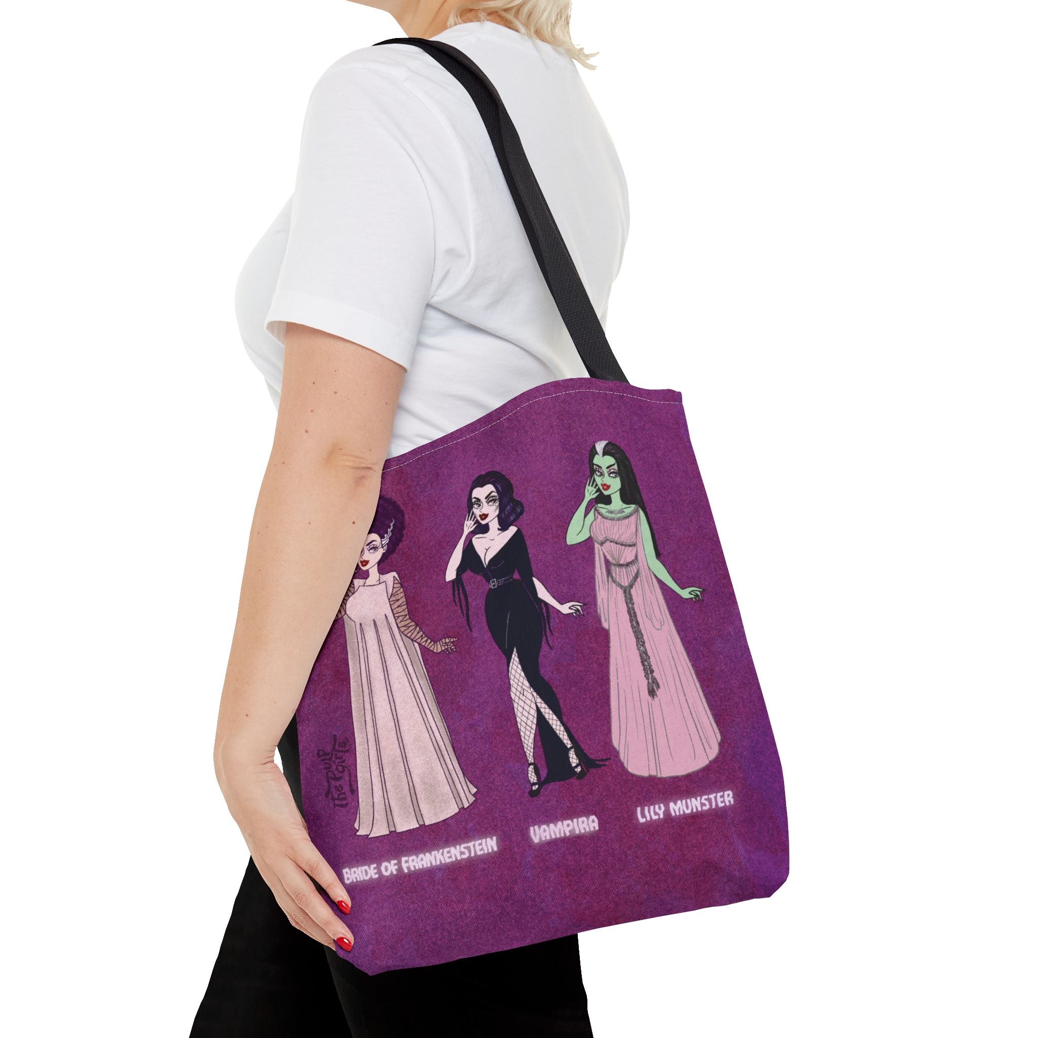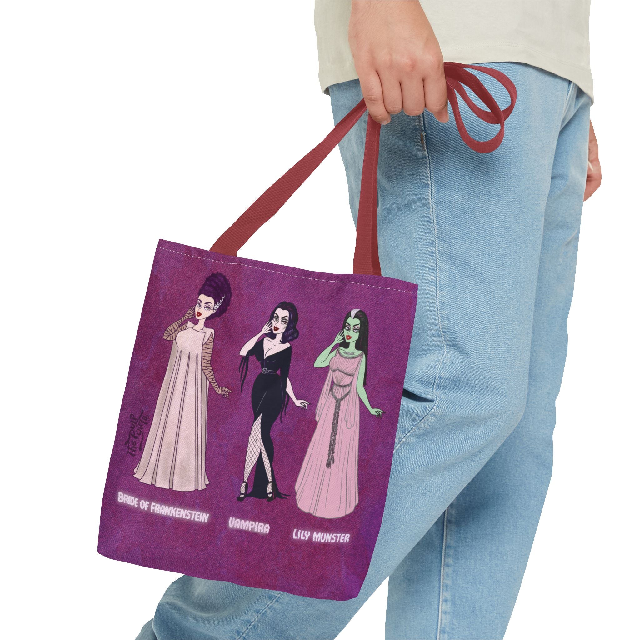 🧡Spooky Queens are forever!🧡 Show off your love for these horror movie icons on this heavy-duty, roomy tote. Featuring Pulp drawings of your favorite monster babes and witch queens alike, along with a black or red handles.
