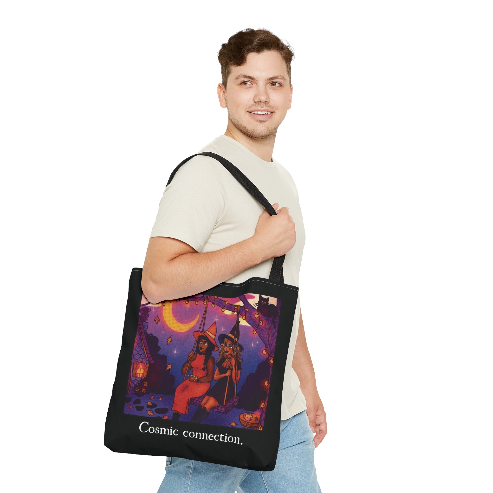 Tote featuring two witches under the moon. Perfect for those who love witchy aesthetics and want to embrace their inner magic. Ideal for Halloween, witchcraft enthusiasts, and anyone looking to add a touch of the supernatural to their wardrobe.