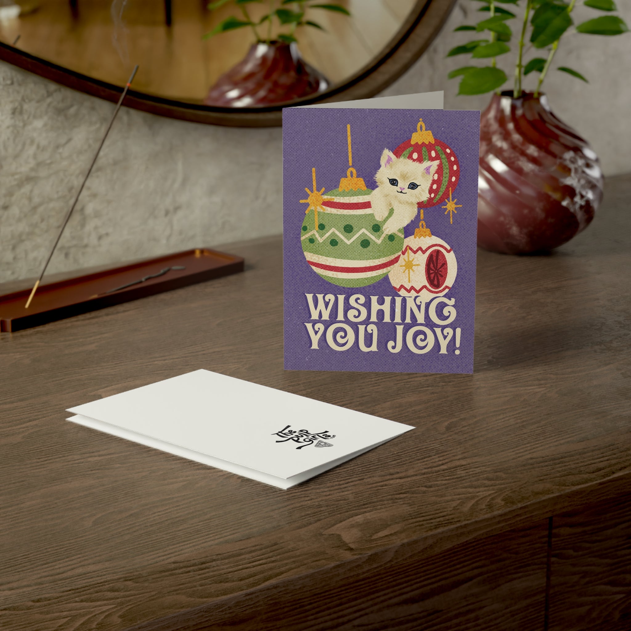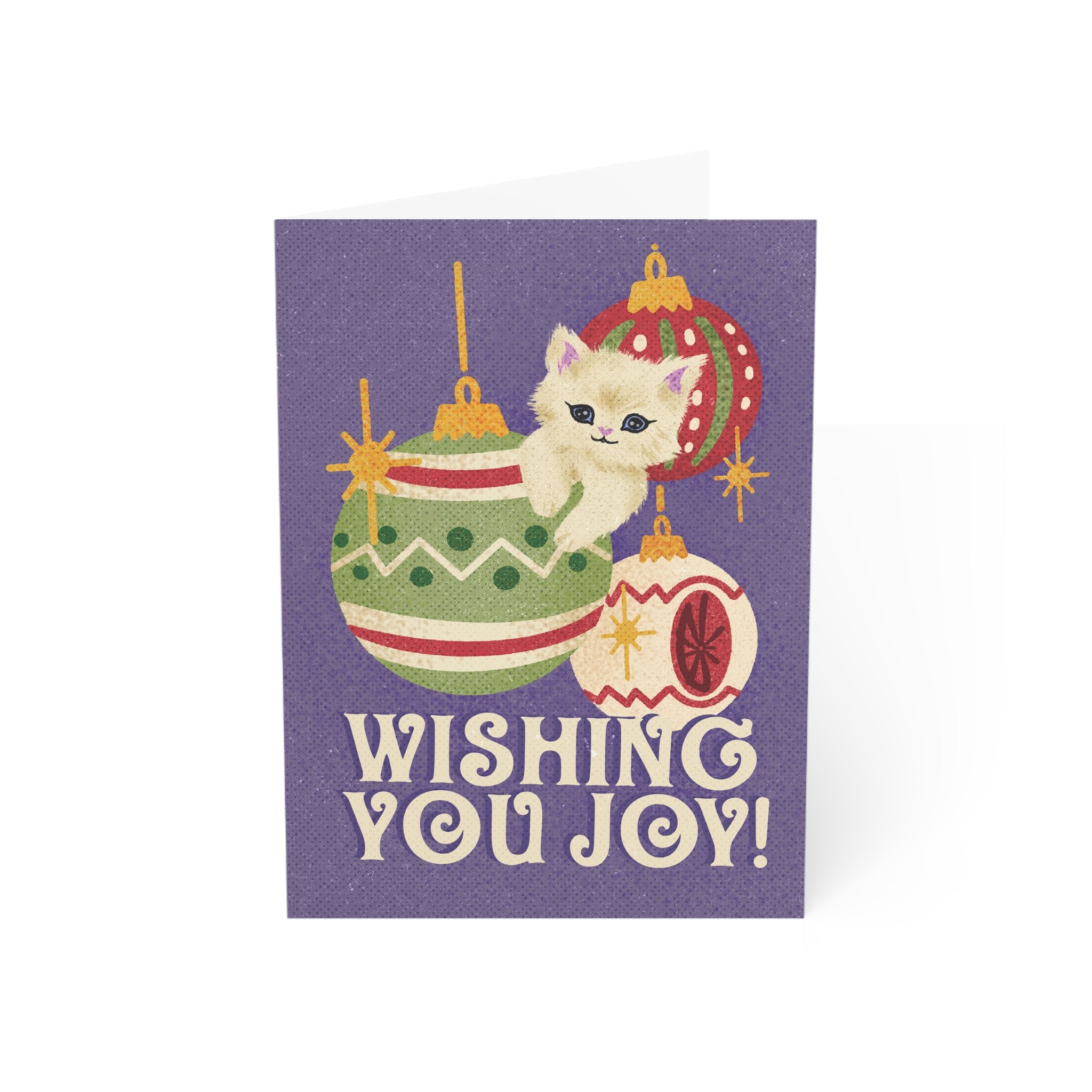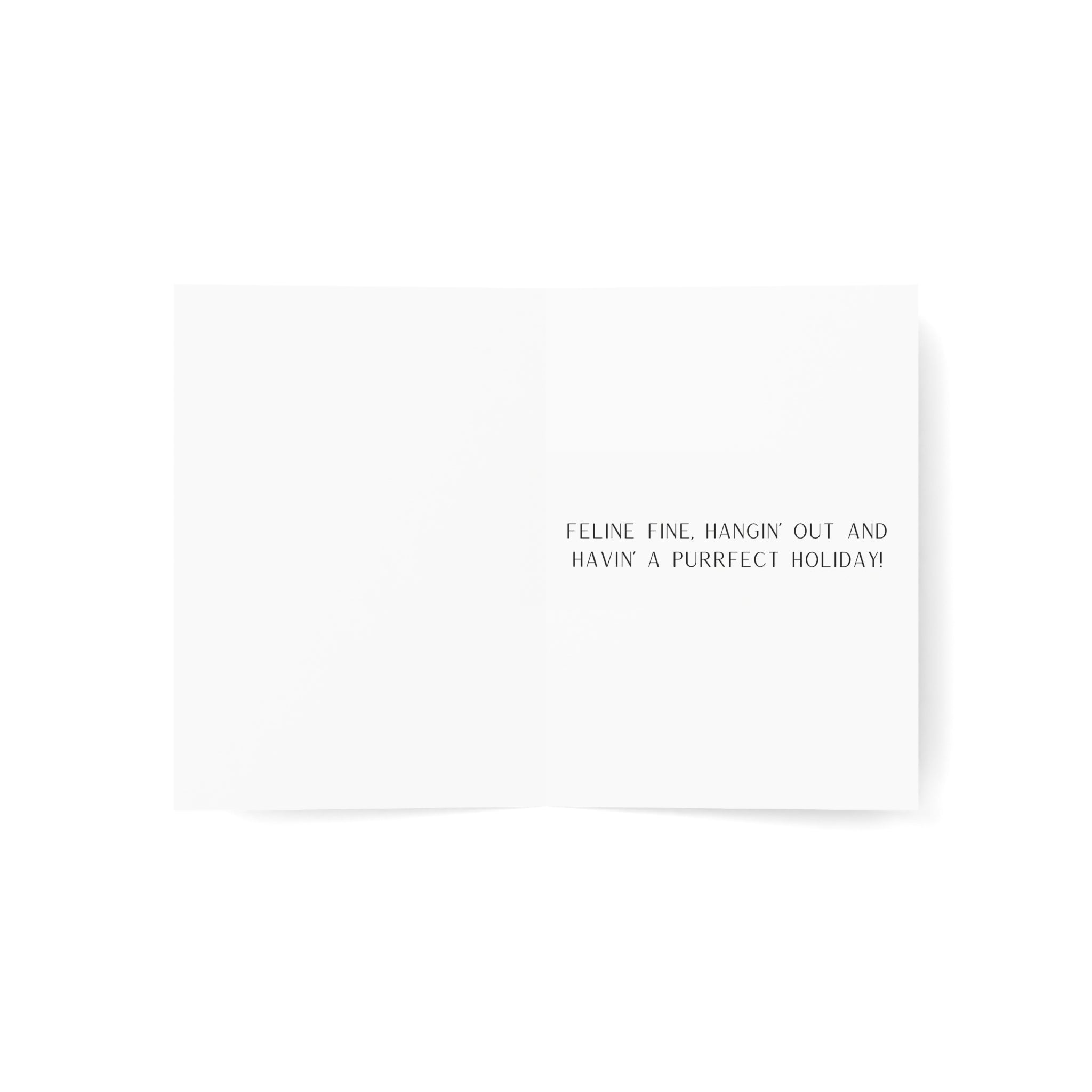 Spread some holiday cheer with this cute cat holiday card! The front features a retro-inspired white kitten among Christmas ornaments, while the inside reads "Feline fine, hangin' out and having a purrfect holiday!" Perfect for sending warm wishes to friends and family during the holiday season. Ideal for cat lovers and those who appreciate vintage-inspired designs.