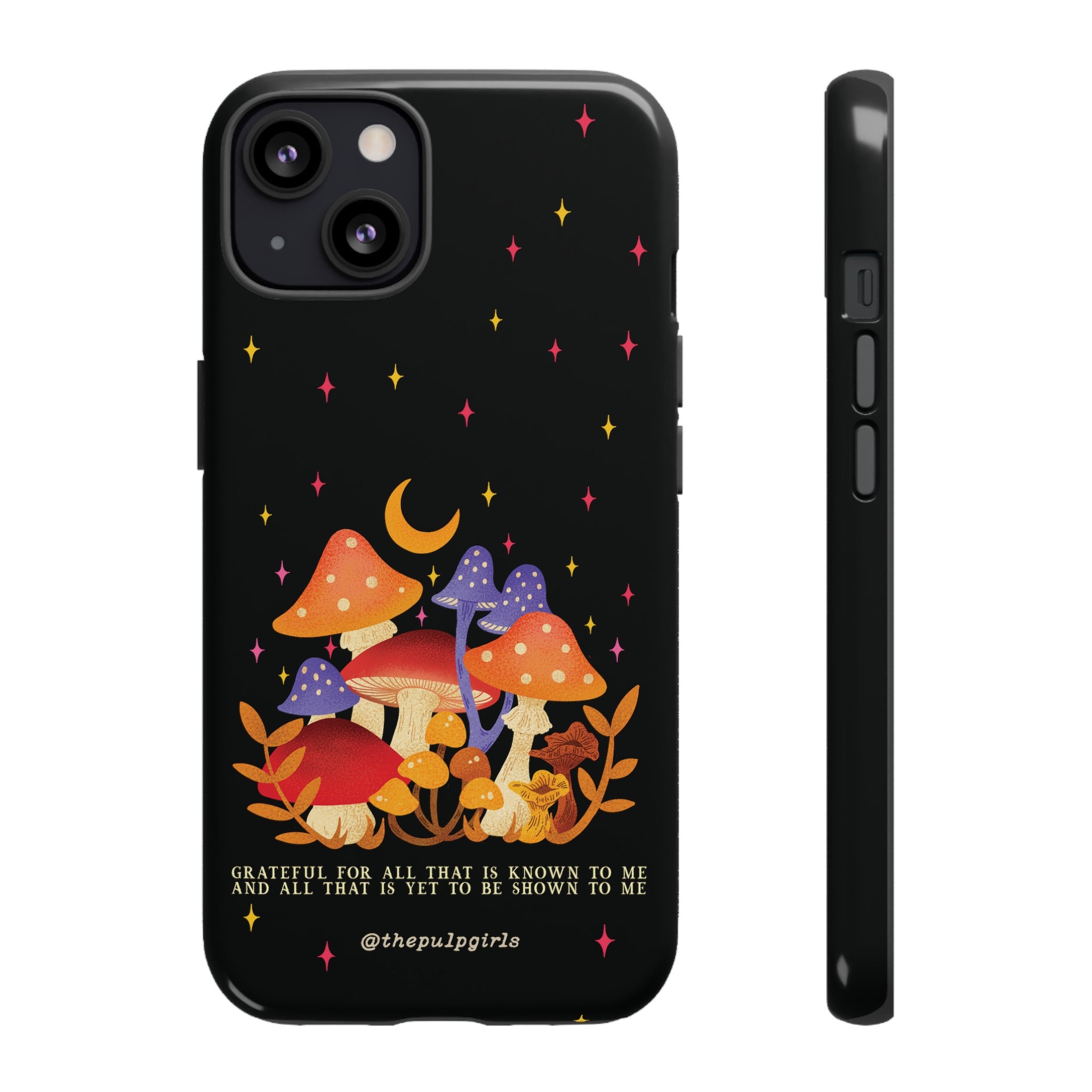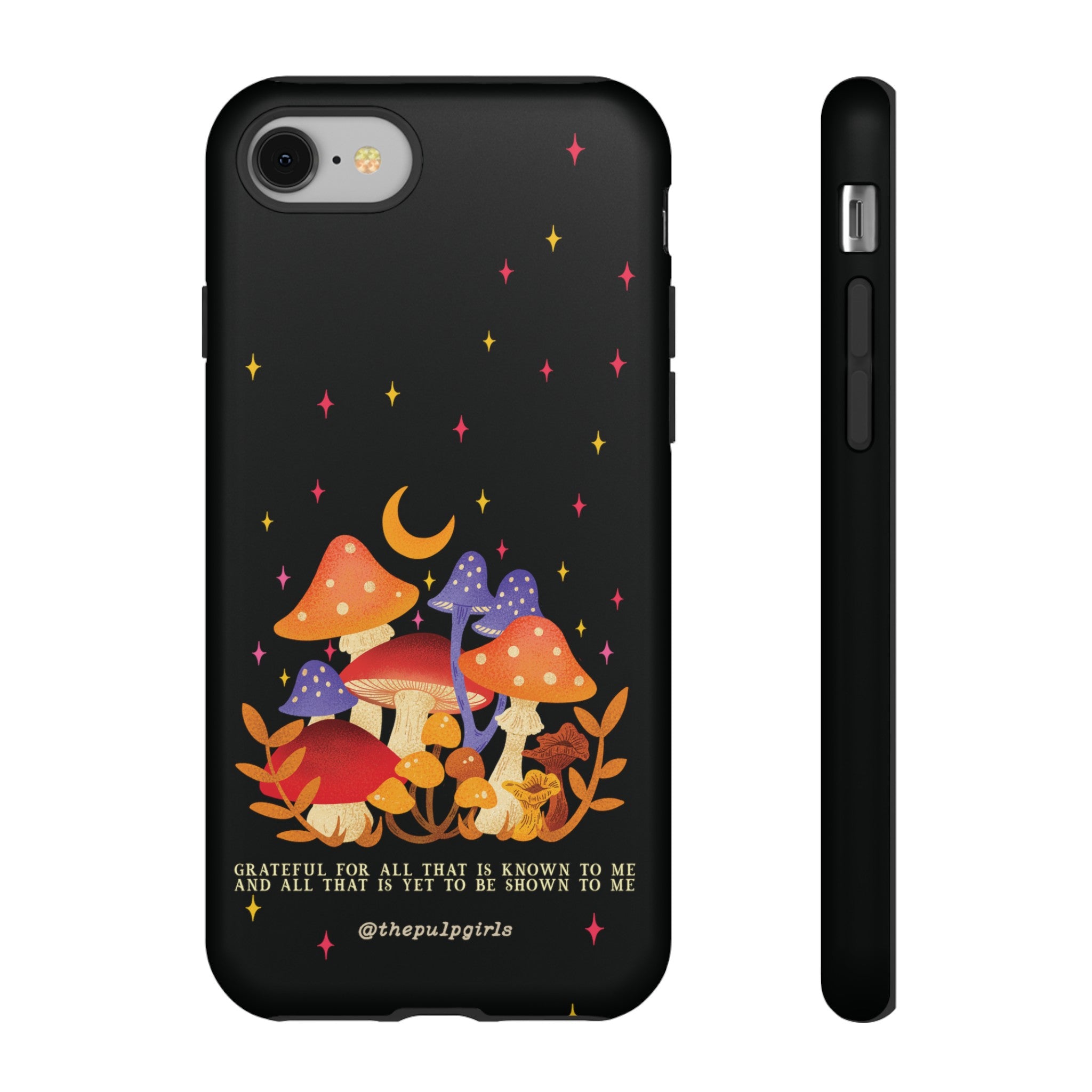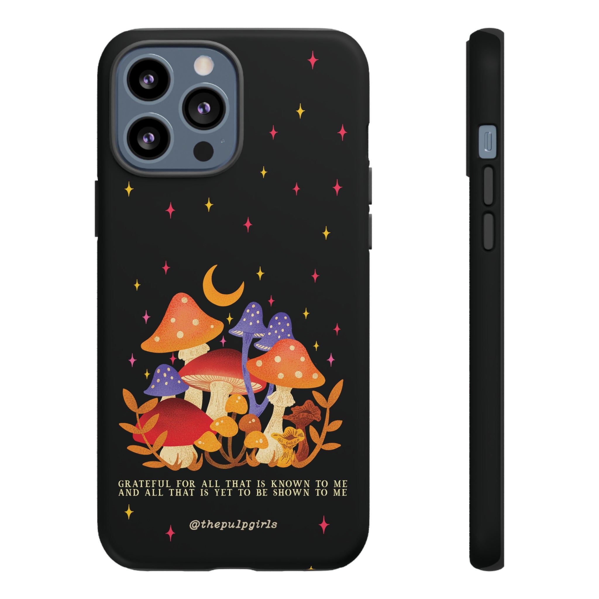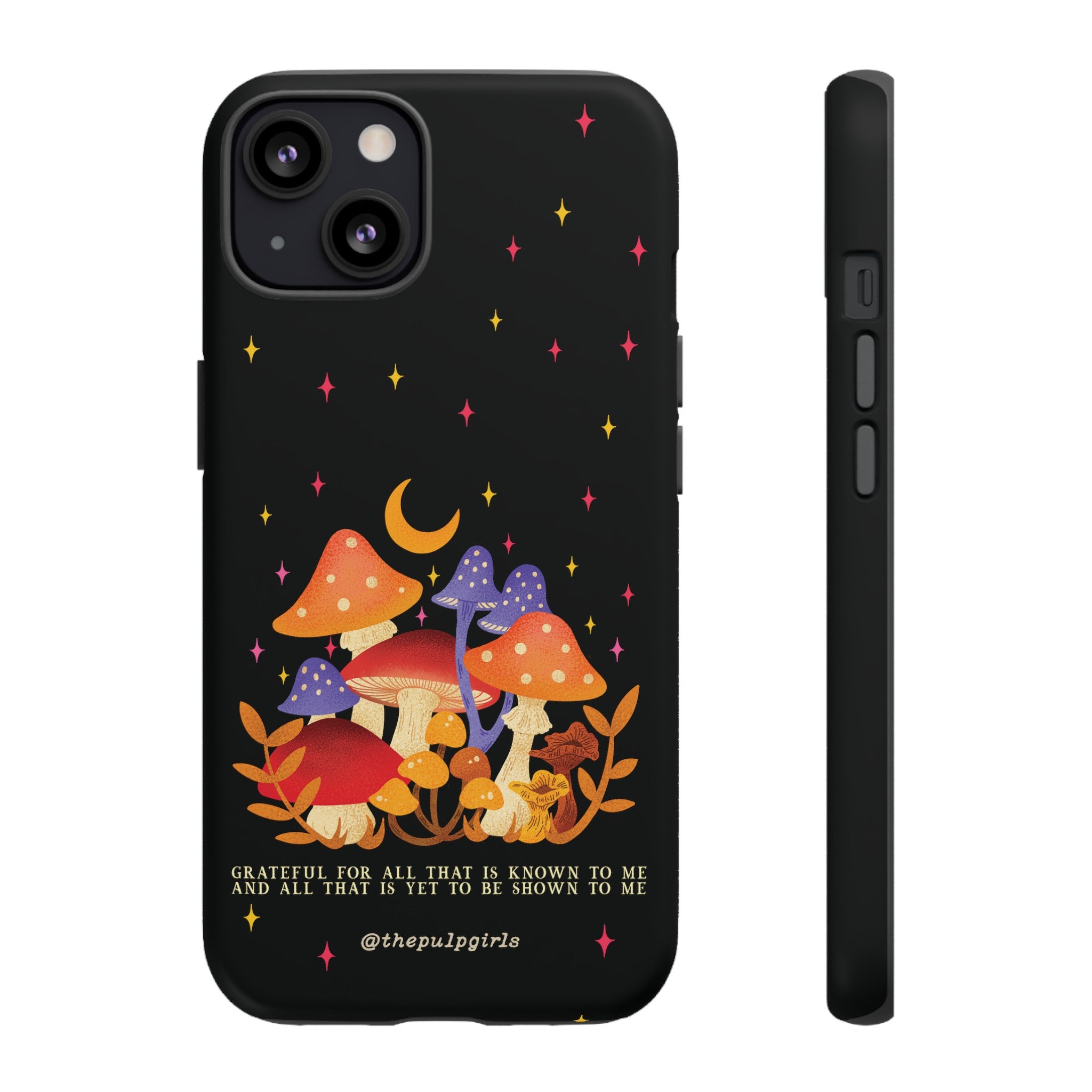 Do you love all things cute, cottagecore, and mushroom-related? This is the tough phone case for you! It's all about gratitude.