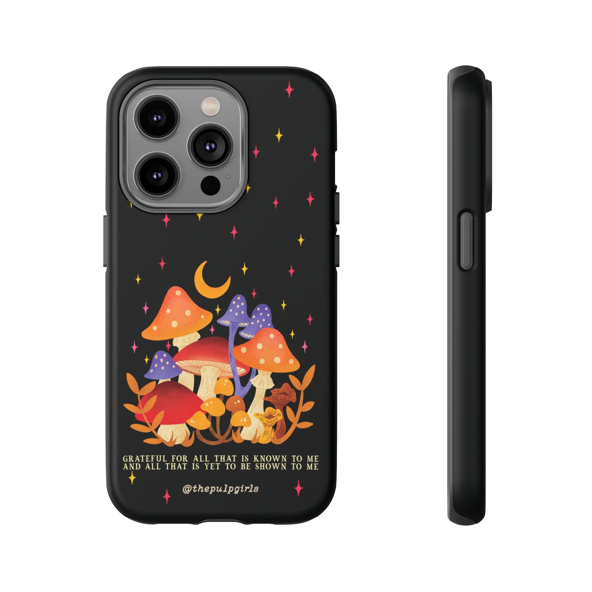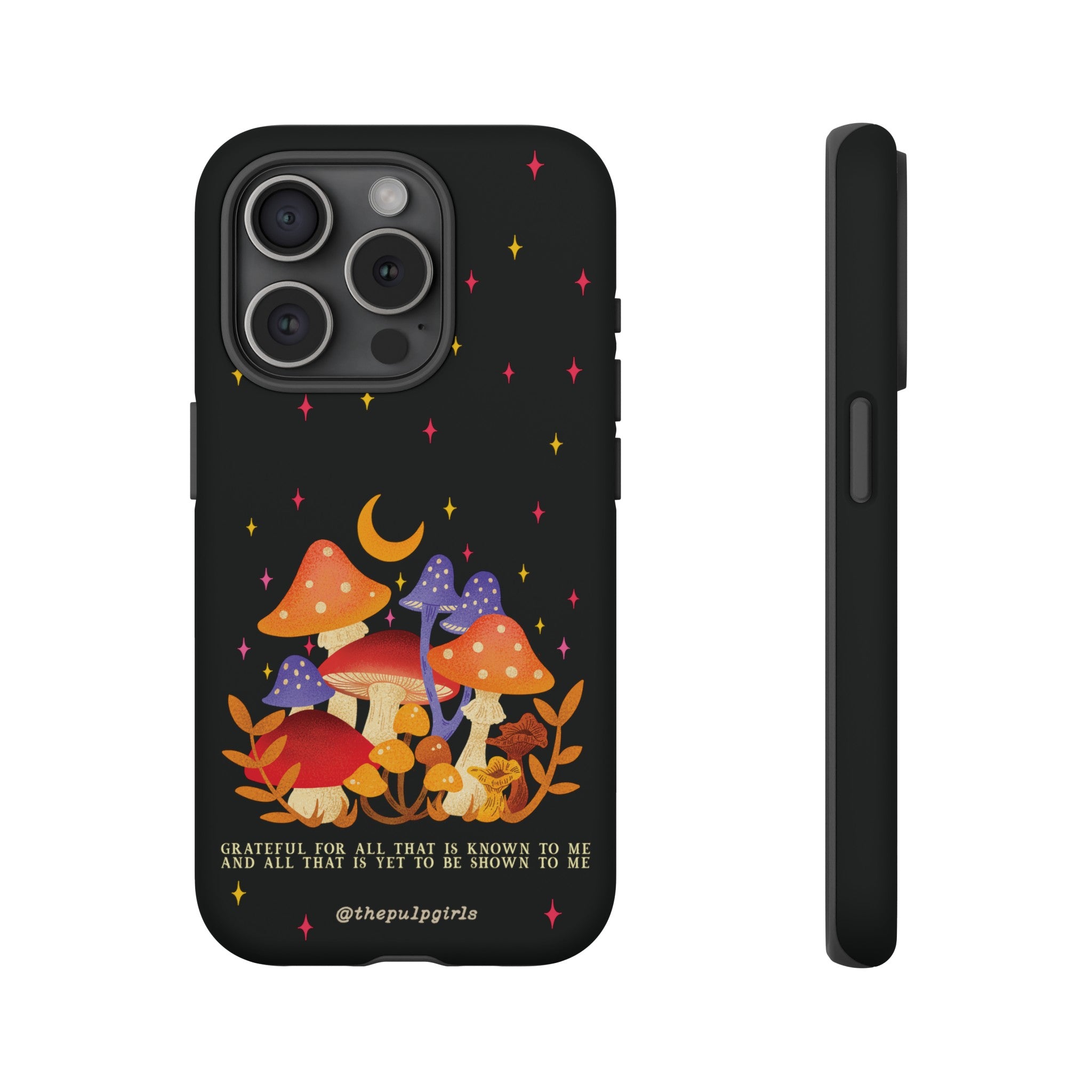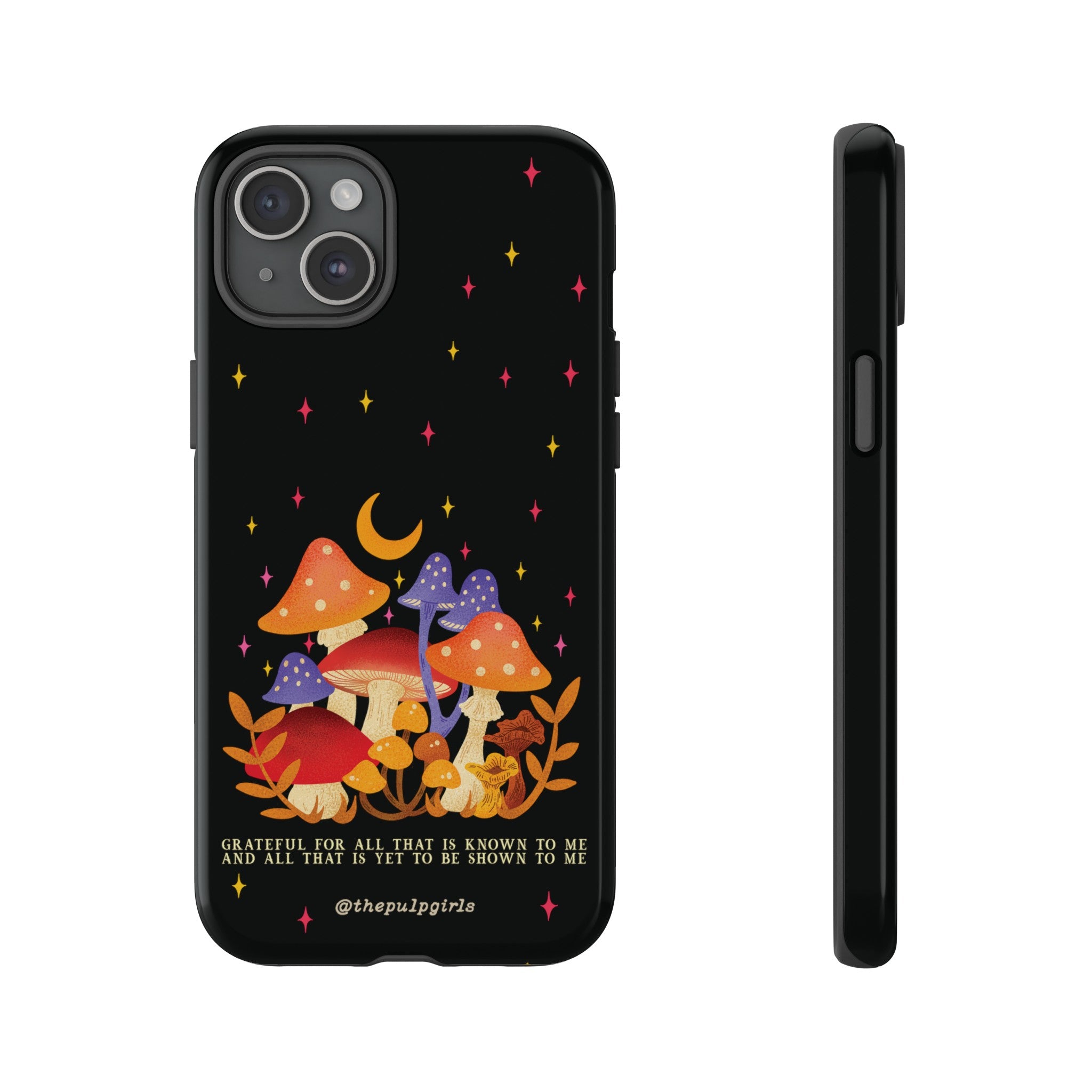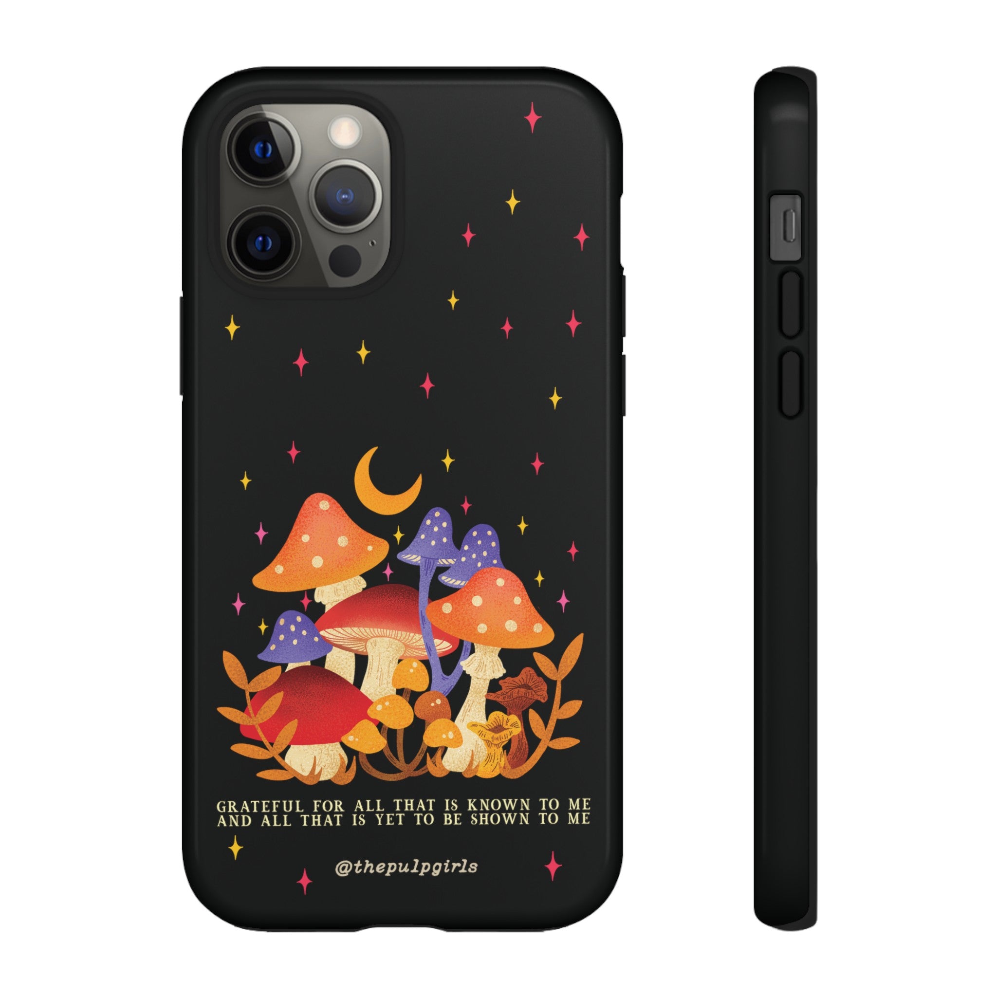 Do you love all things cute, cottagecore, and mushroom-related? This is the tough phone case for you! It's all about gratitude.