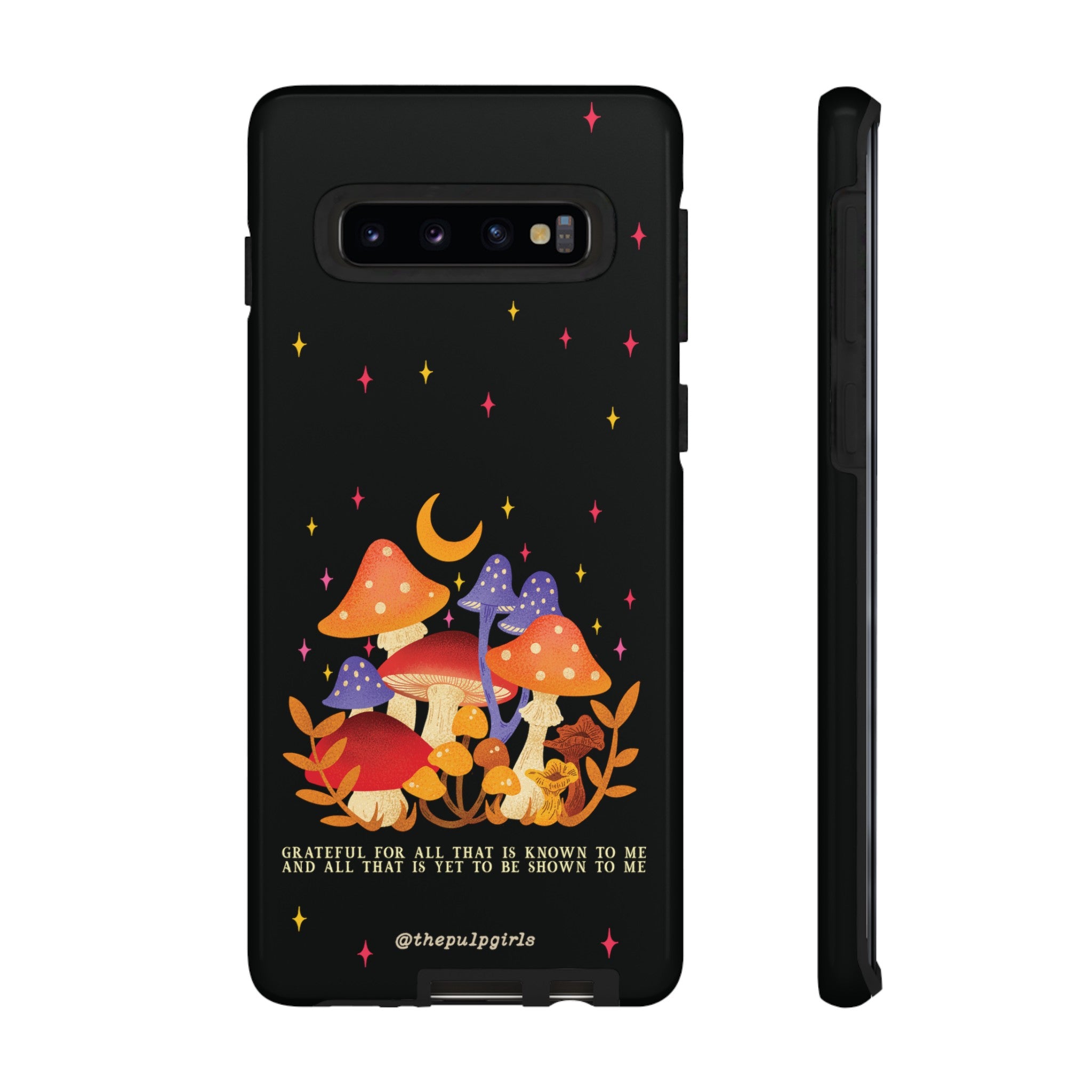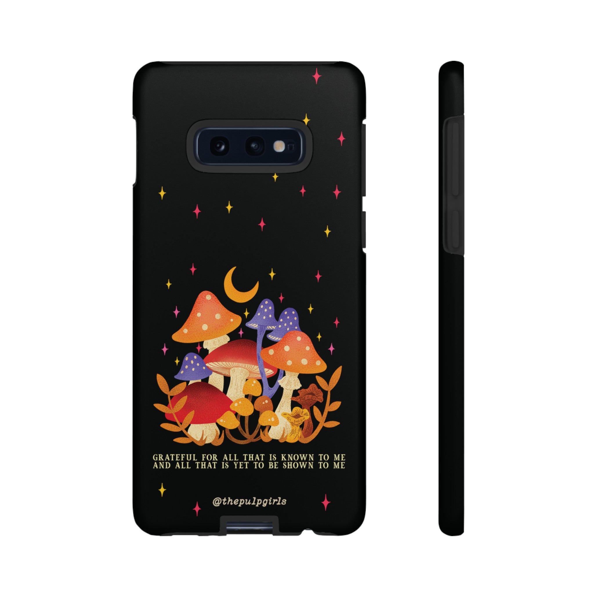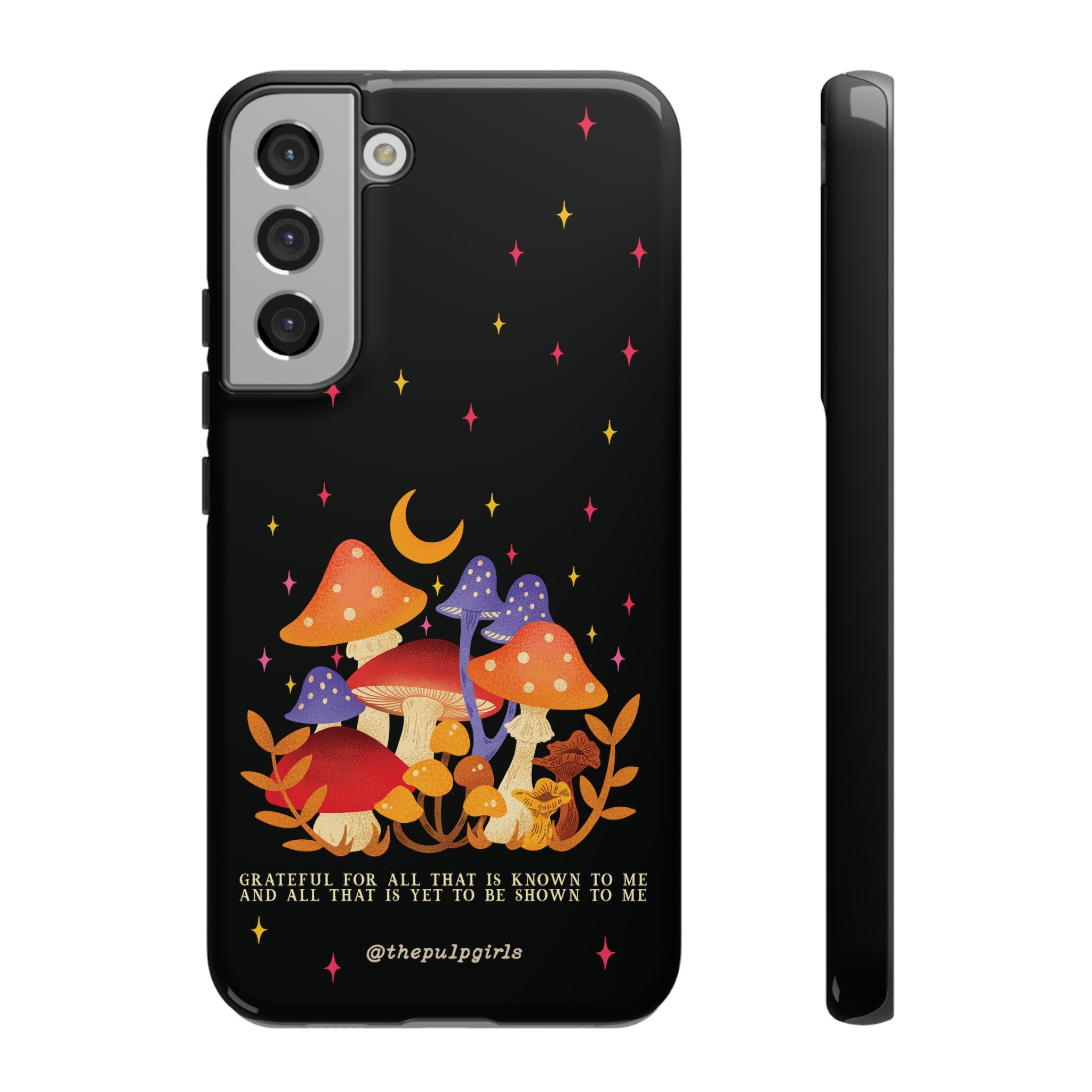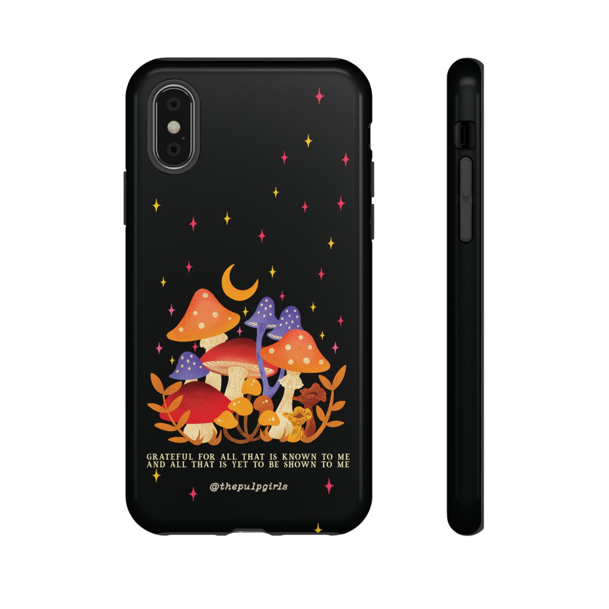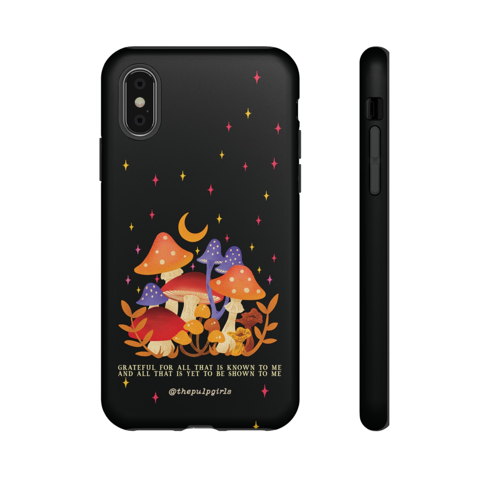 Do you love all things cute, cottagecore, and mushroom-related? This is the tough phone case for you! It's all about gratitude.