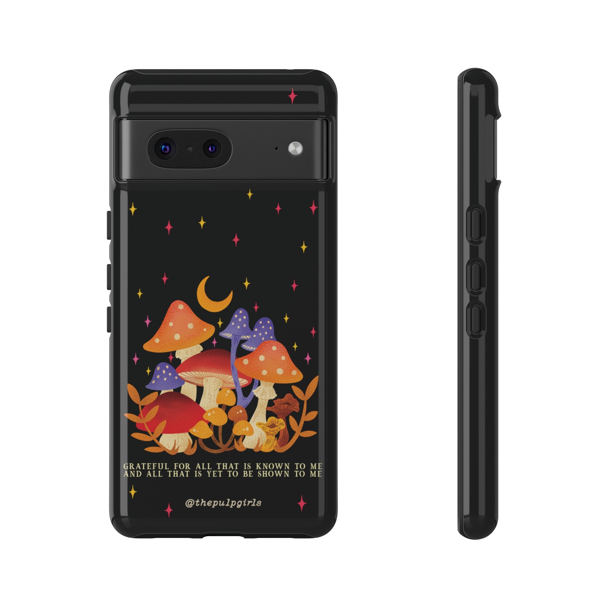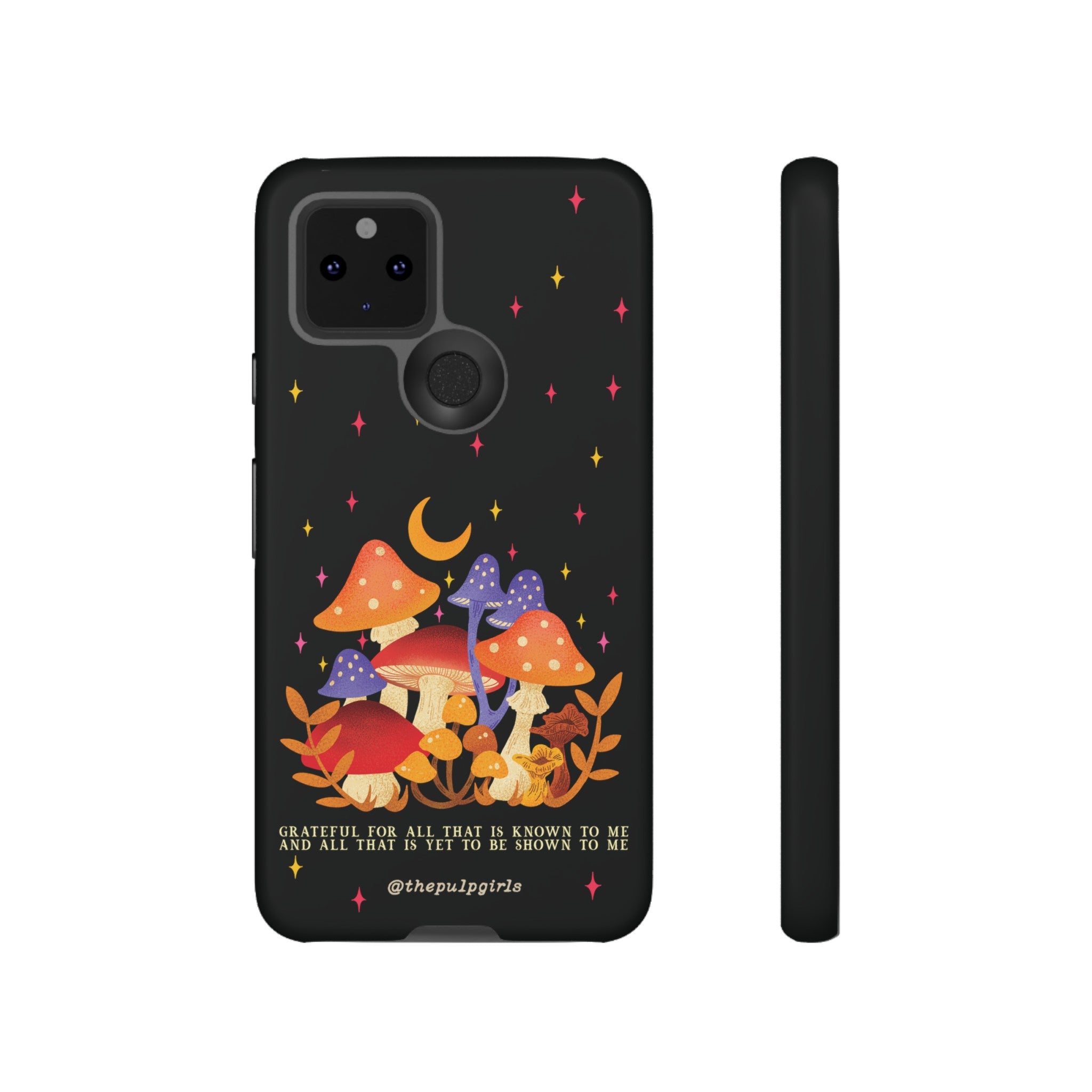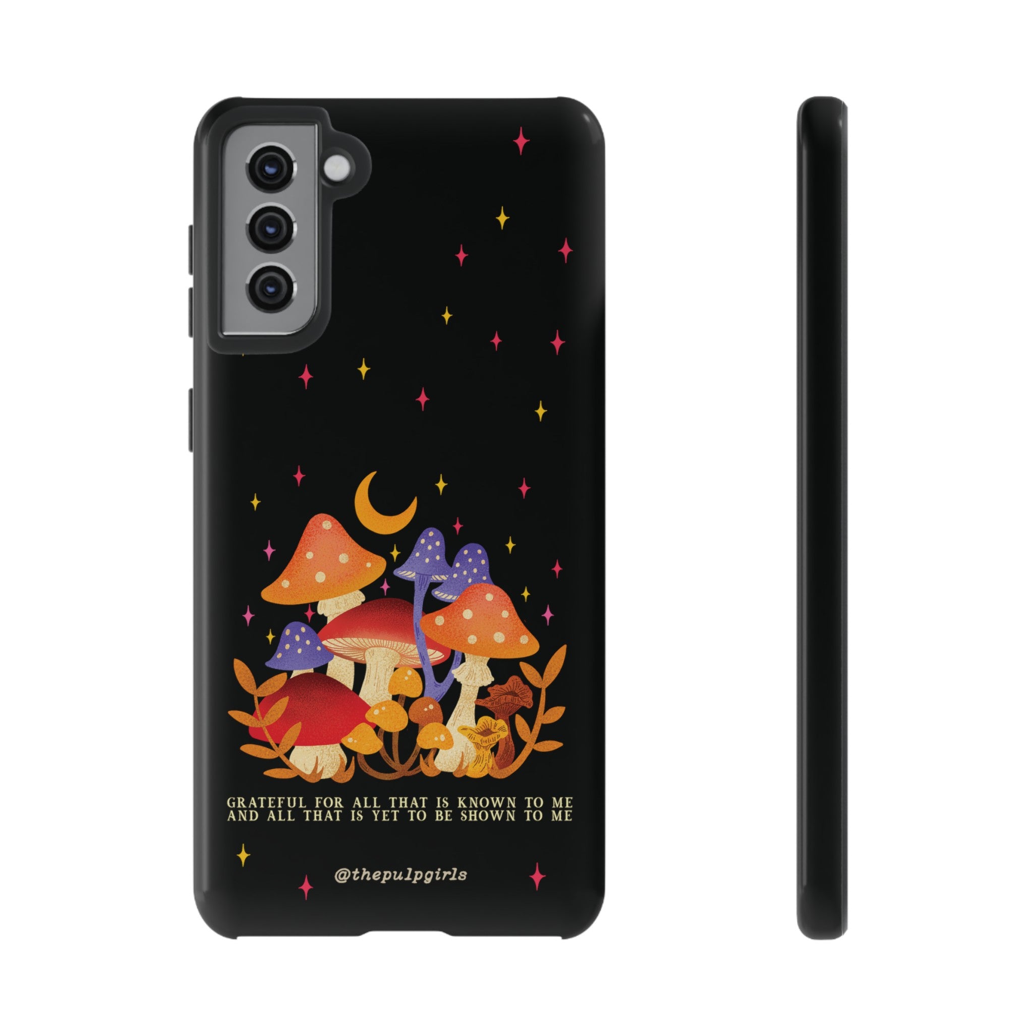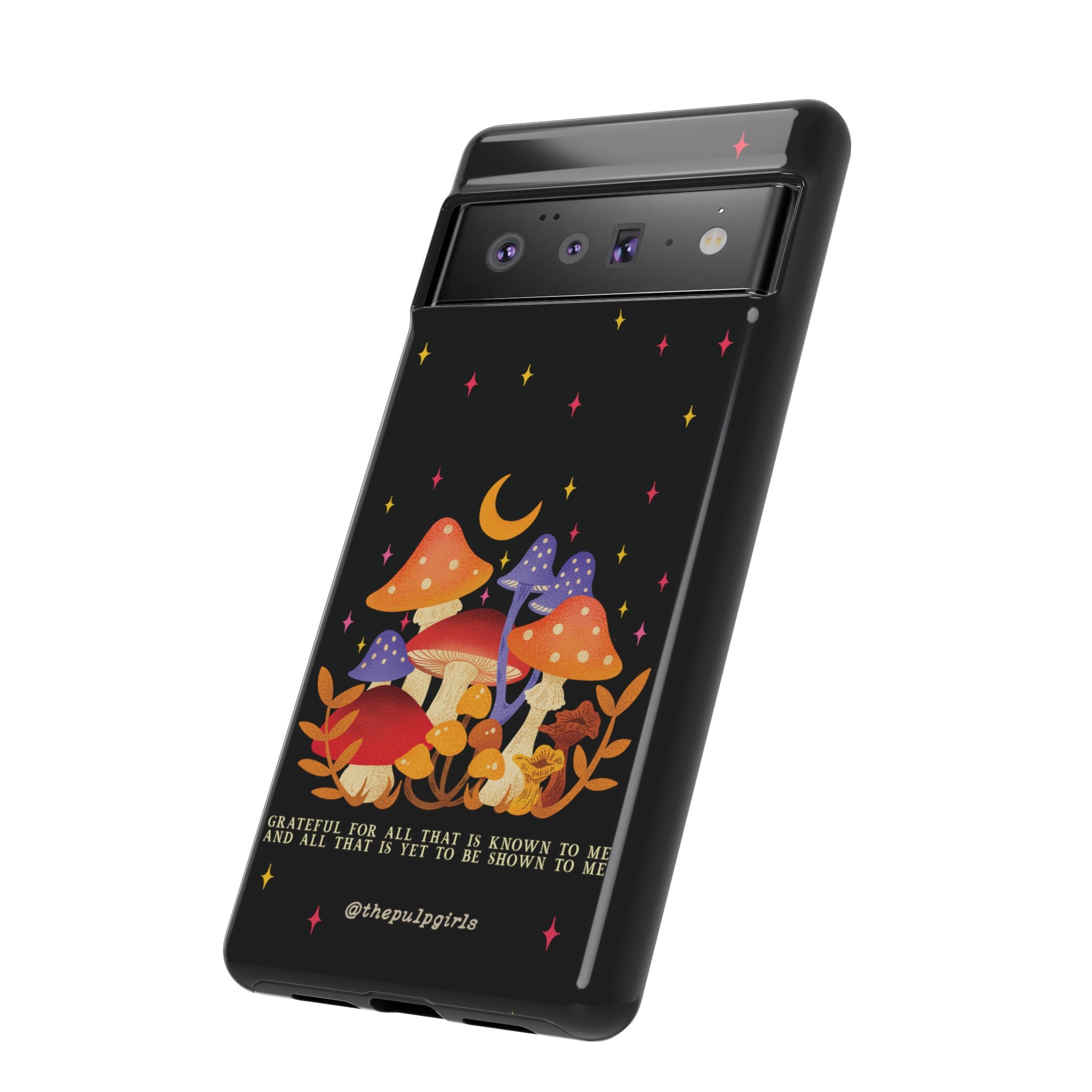 Do you love all things cute, cottagecore, and mushroom-related? This is the tough phone case for you! It's all about gratitude.