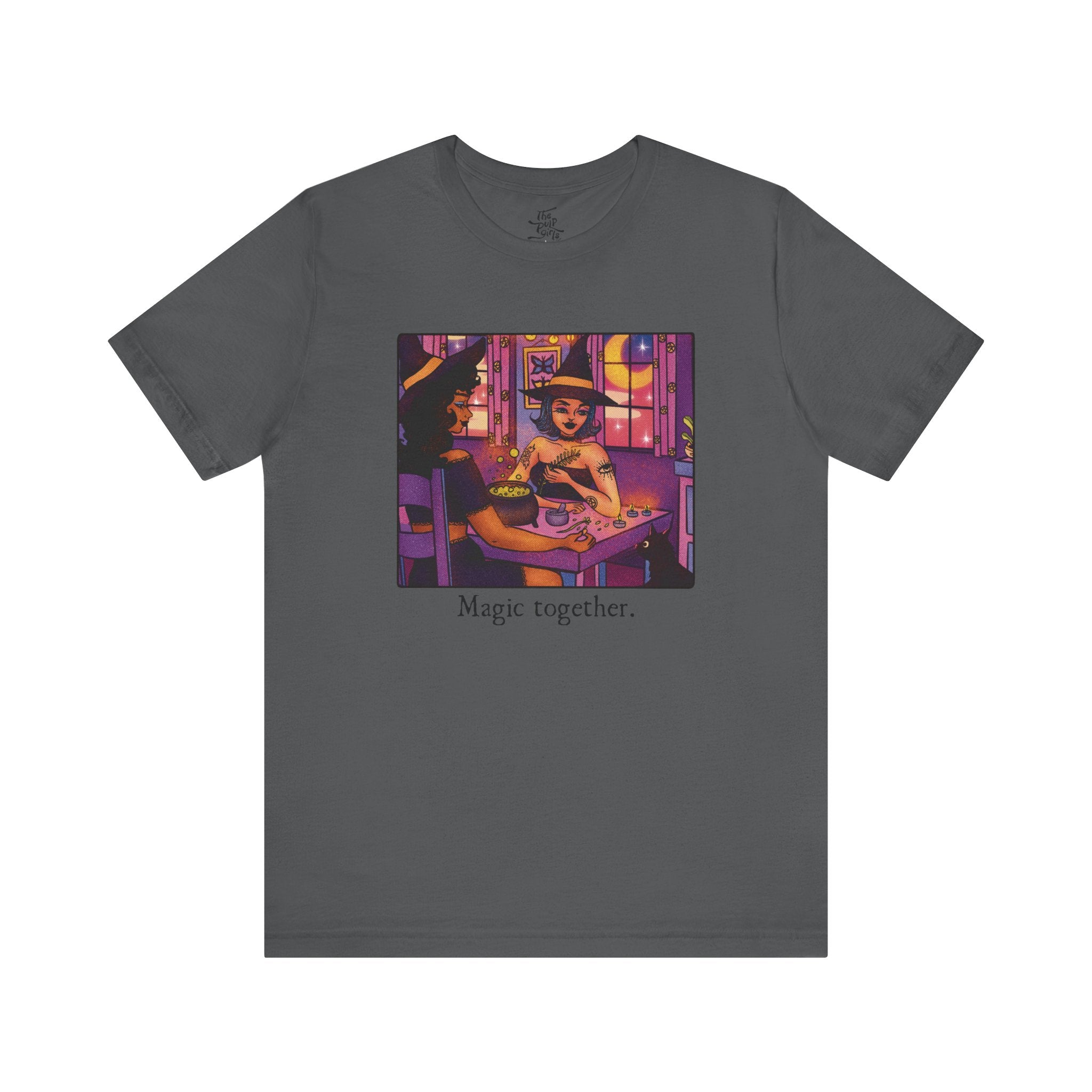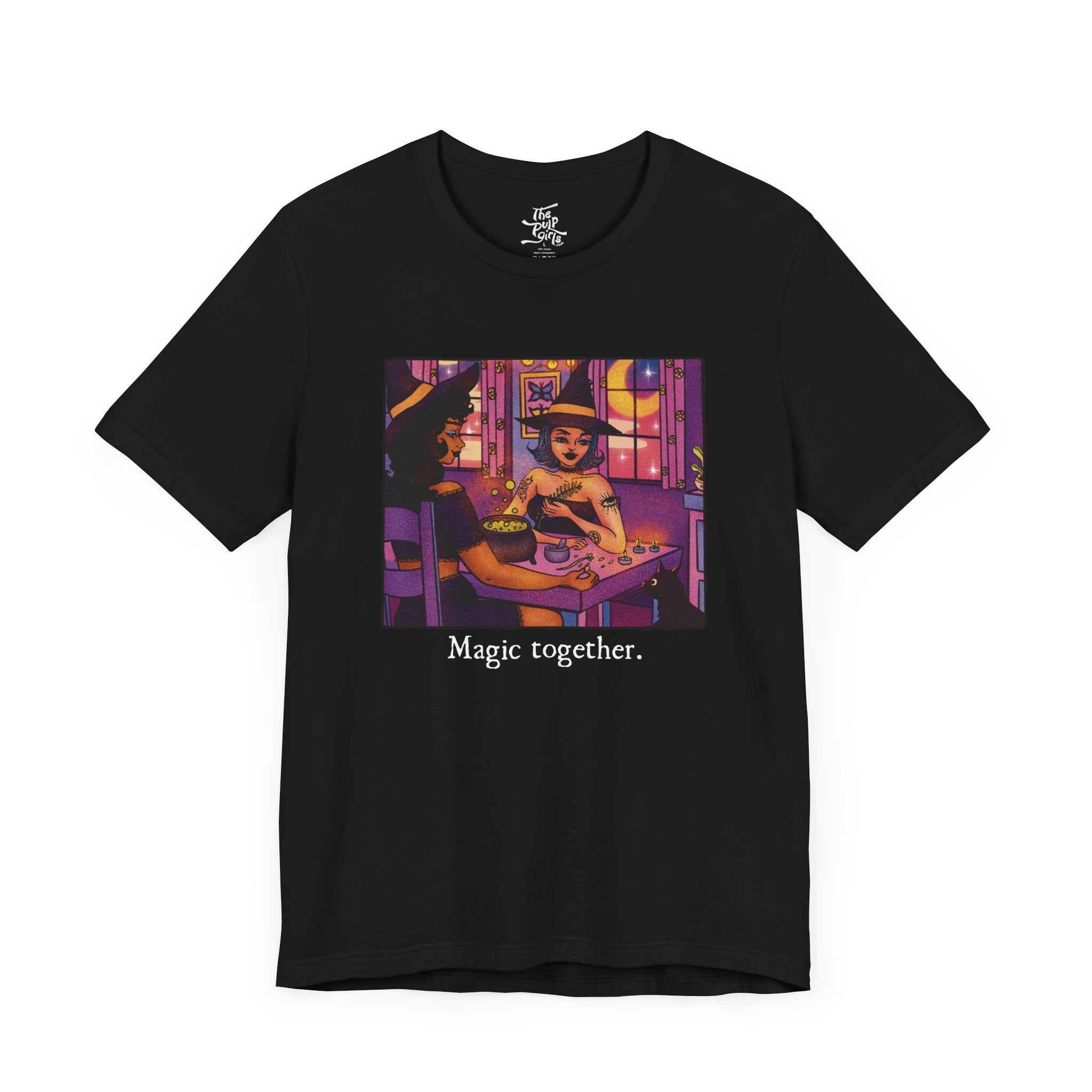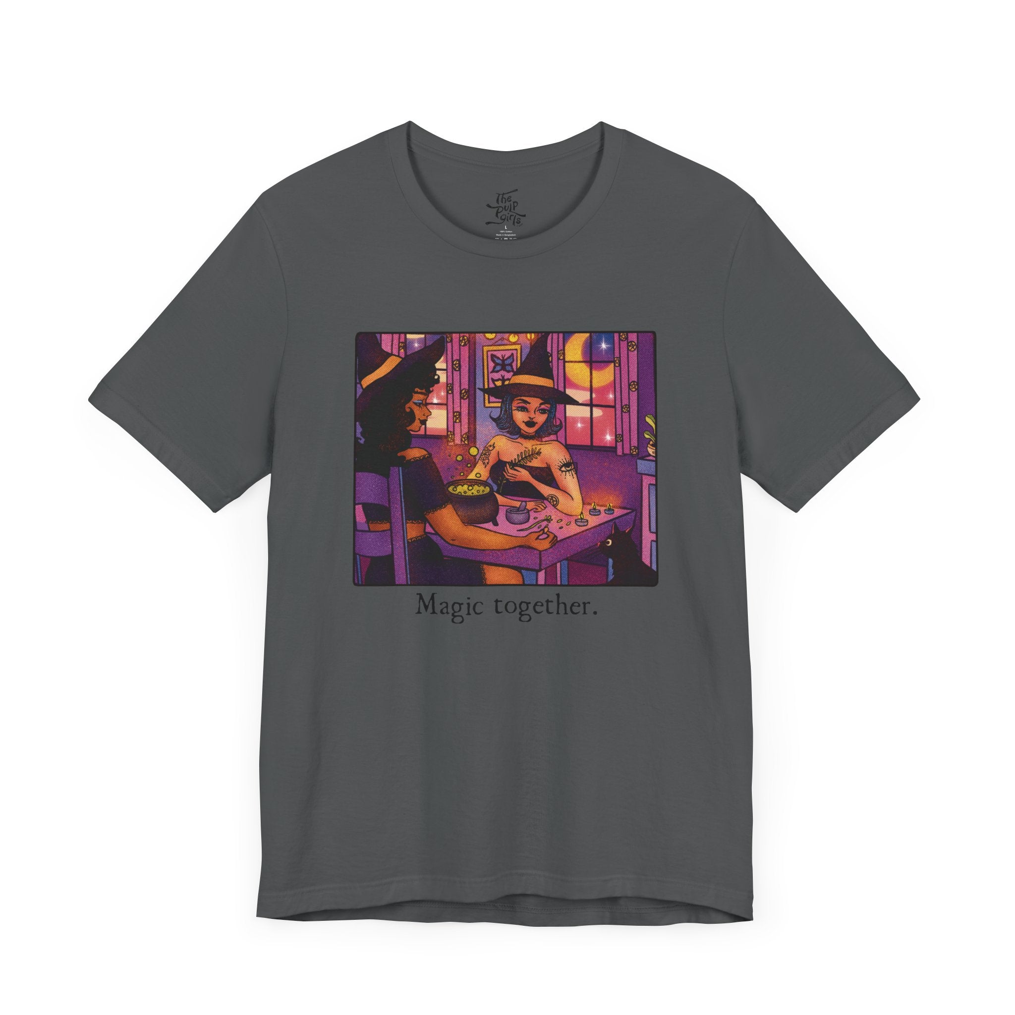 Unisex short sleeve tee featuring two witch besties mixing up some potions in their cozy cottage. Perfect for those who love witchy aesthetics and want to embrace their inner magic. Ideal for Halloween, witchcraft enthusiasts, and anyone looking to add a touch of the supernatural to their wardrobe.