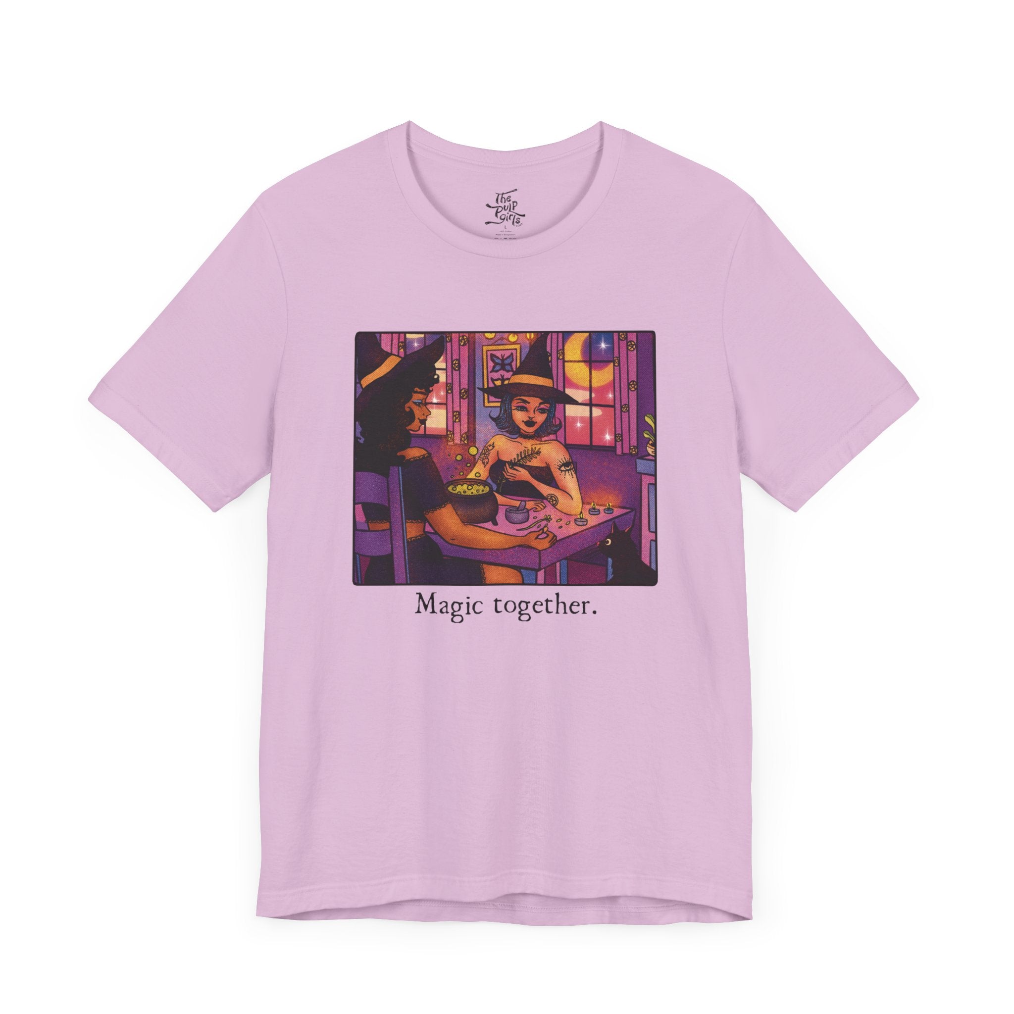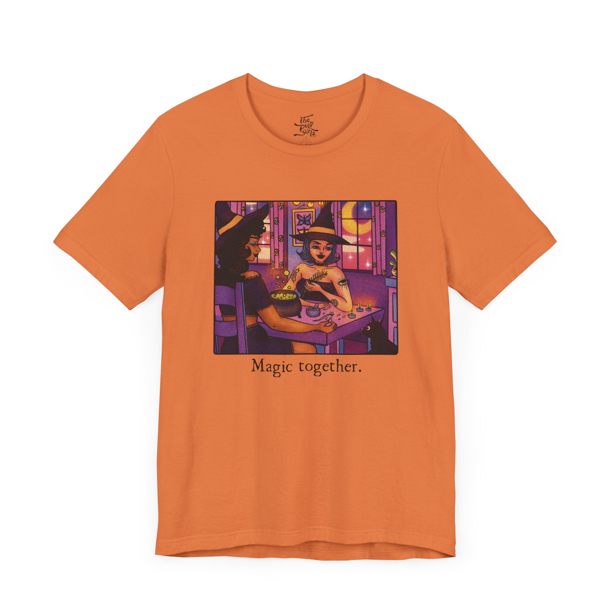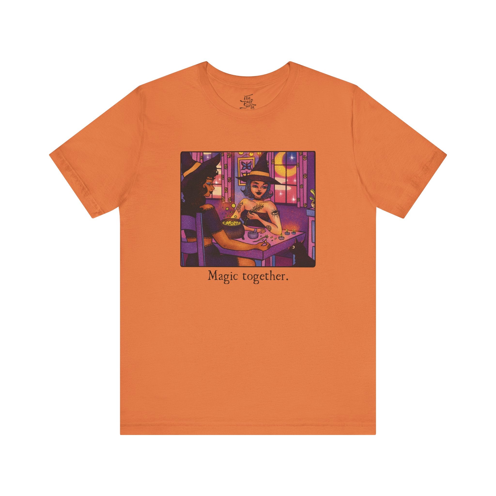 Unisex short sleeve tee featuring two witch besties mixing up some potions in their cozy cottage. Perfect for those who love witchy aesthetics and want to embrace their inner magic. Ideal for Halloween, witchcraft enthusiasts, and anyone looking to add a touch of the supernatural to their wardrobe.