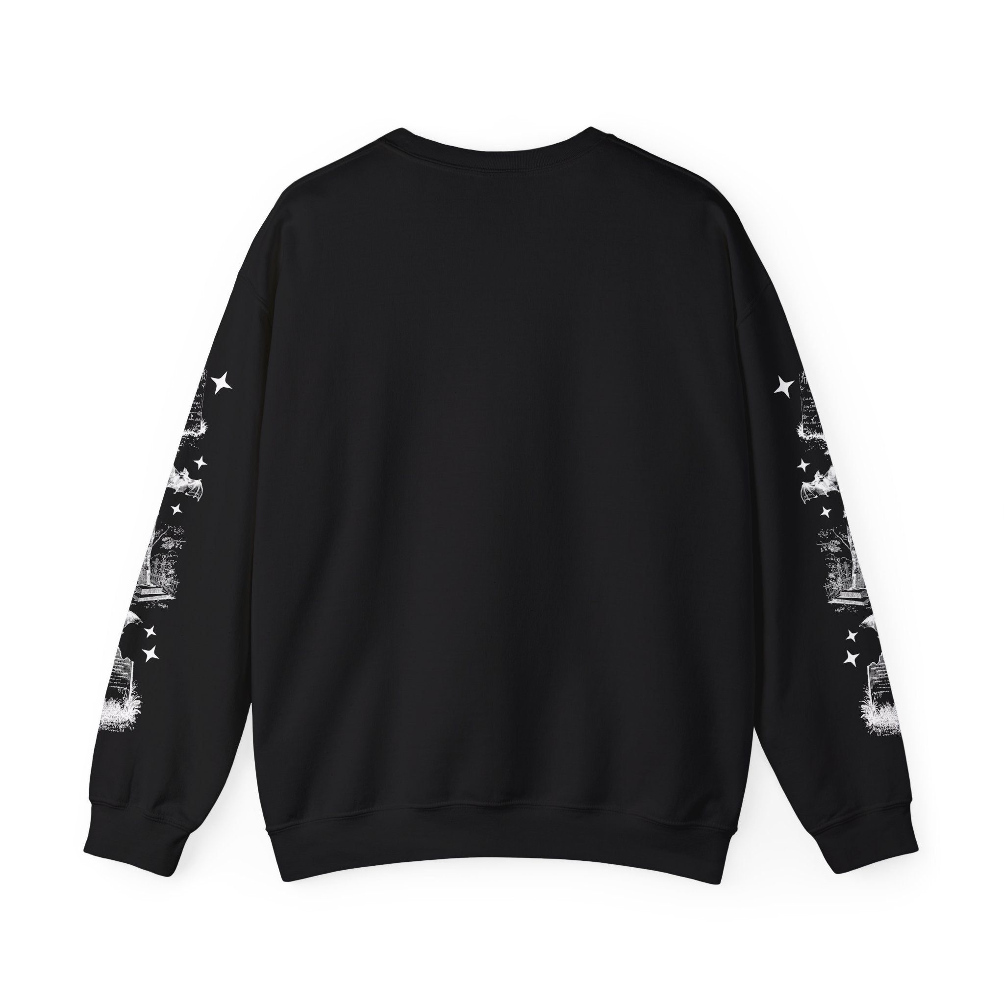 The perfect words for a ghoul's gravestone. Who says Halloween is once a year?! Wear this spooky epitaph crewneck all year round and let em know whats up.