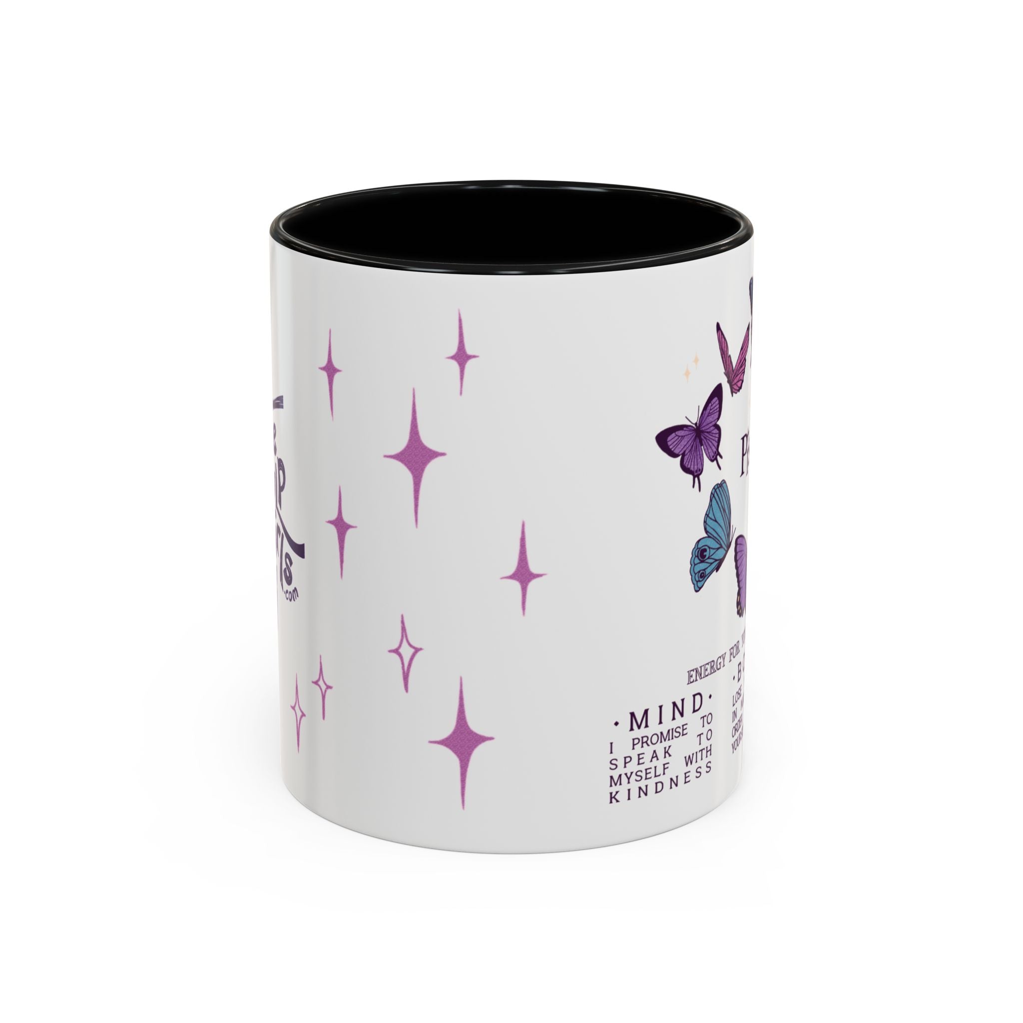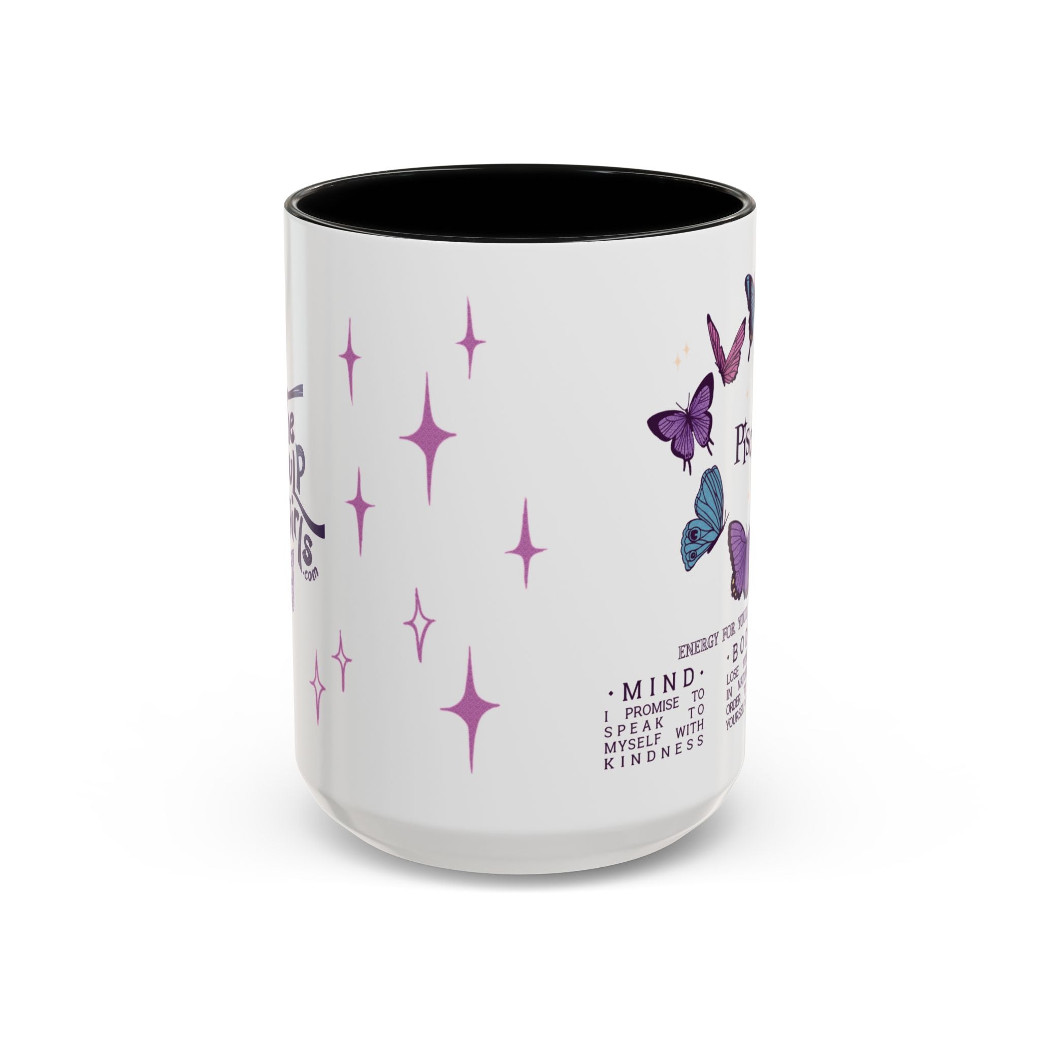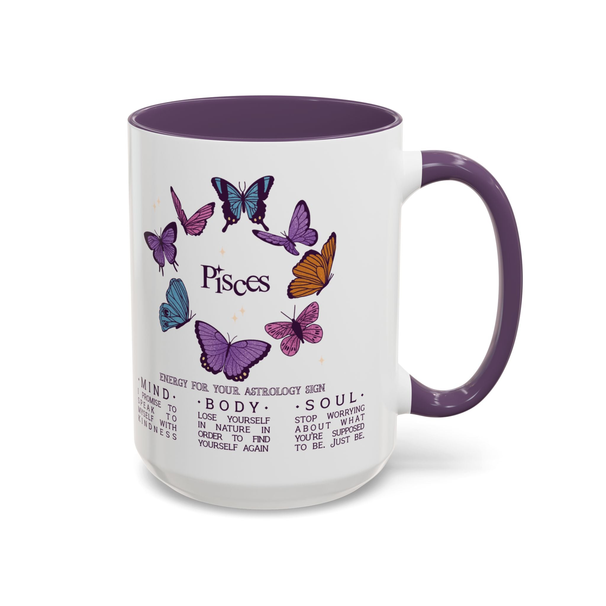 Attention all Pisces darlings! This gentle, self-loving mug belongs in your daily rotation! Featuring gorgeous butterflies framing your sign name, the star of this show is the soft little reminders to take good care of yourself--mind, body, and soul. Whether you're looking for a lovely gift or treating yourself, this is your mug!