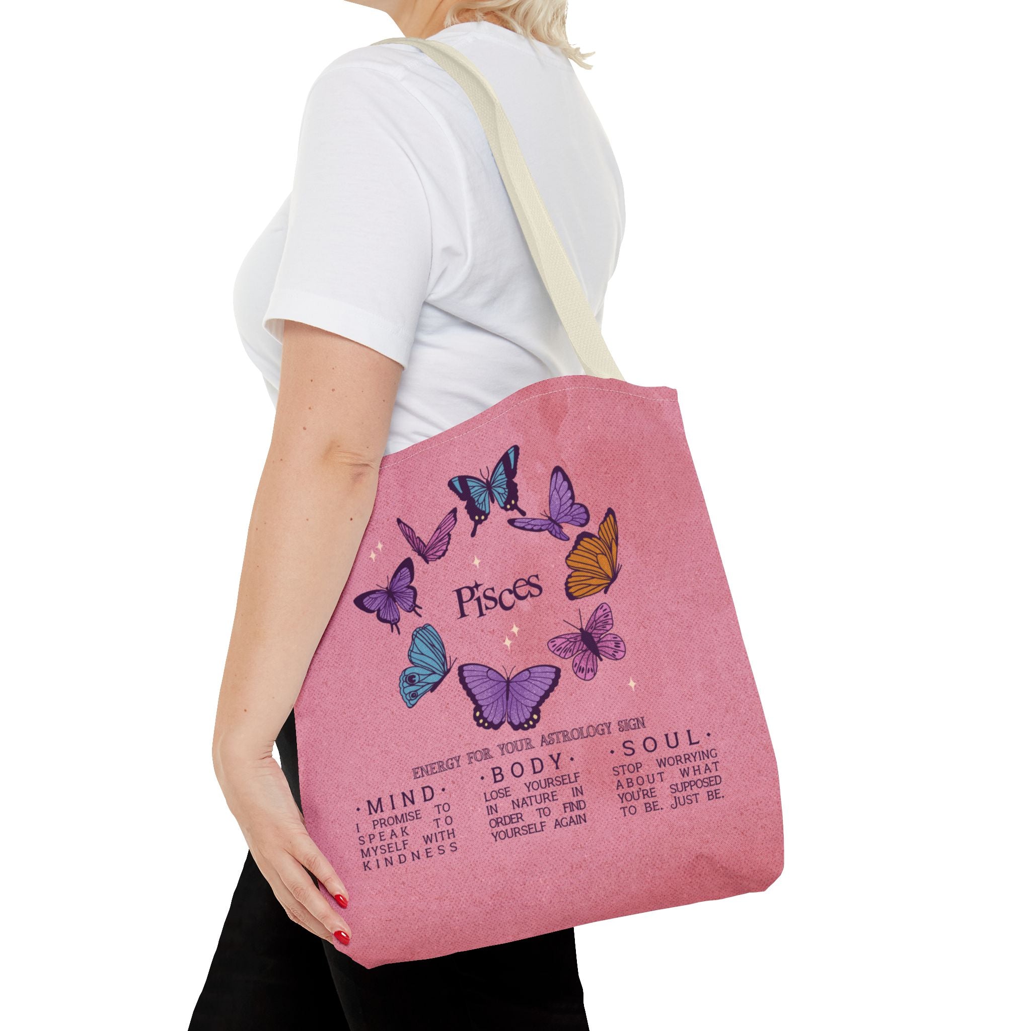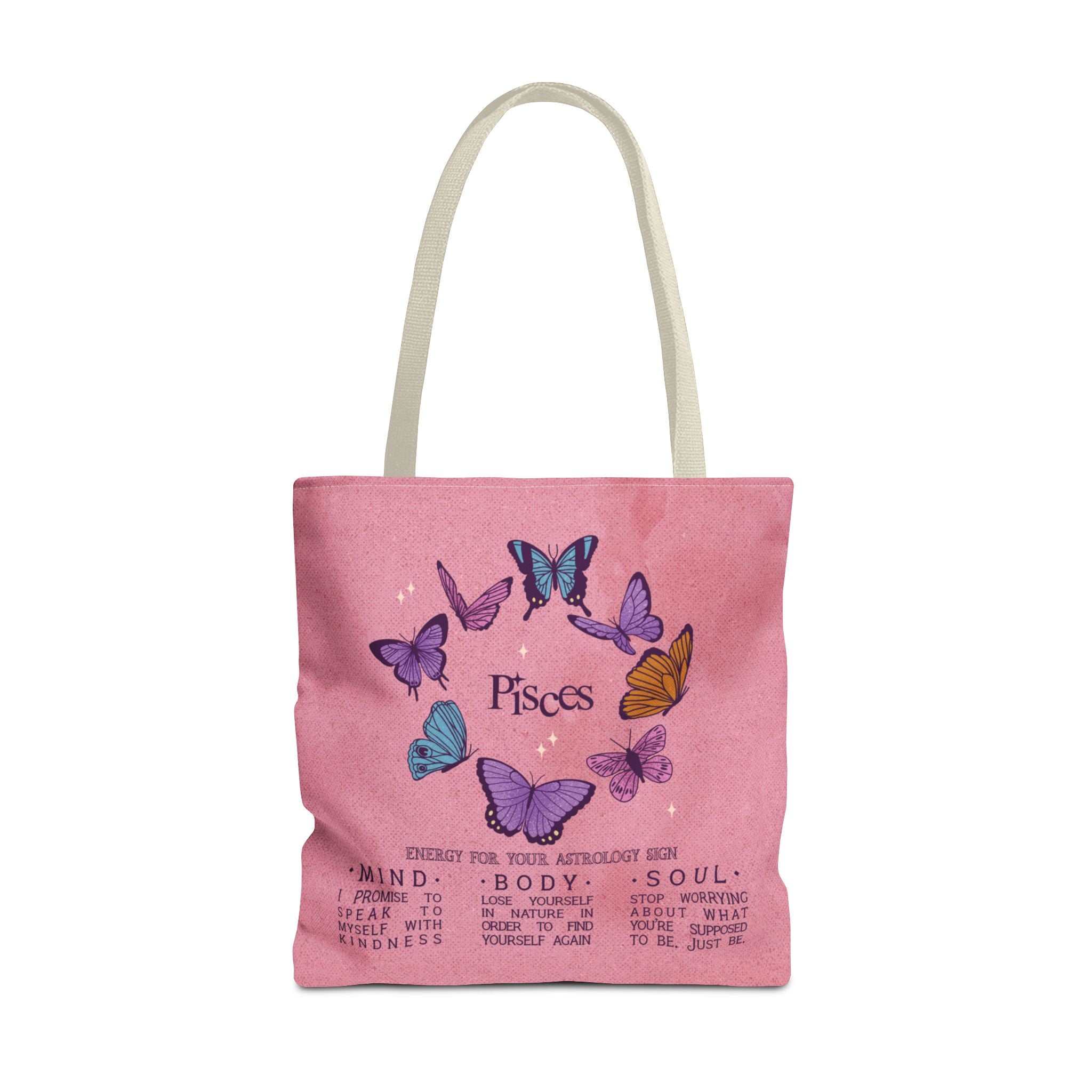 Pisces darlings! Carry some reminders for your own life with this charming tote bag featuring cute butterflies and inspiring words of wisdom for the Pisces mind, body, and soul. Ideal for carrying essentials, this tote bag is a must-have for Pisces individuals looking to showcase their zodiac pride. Great for gifting during birthdays, astrology-themed events, or for everyday use.