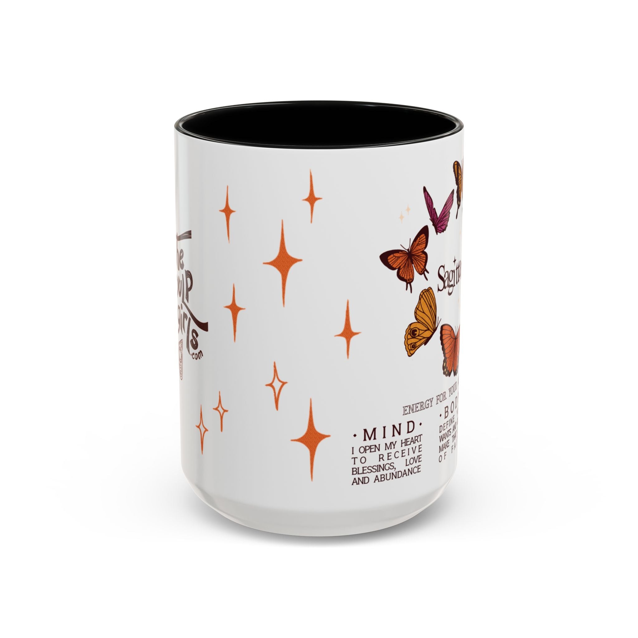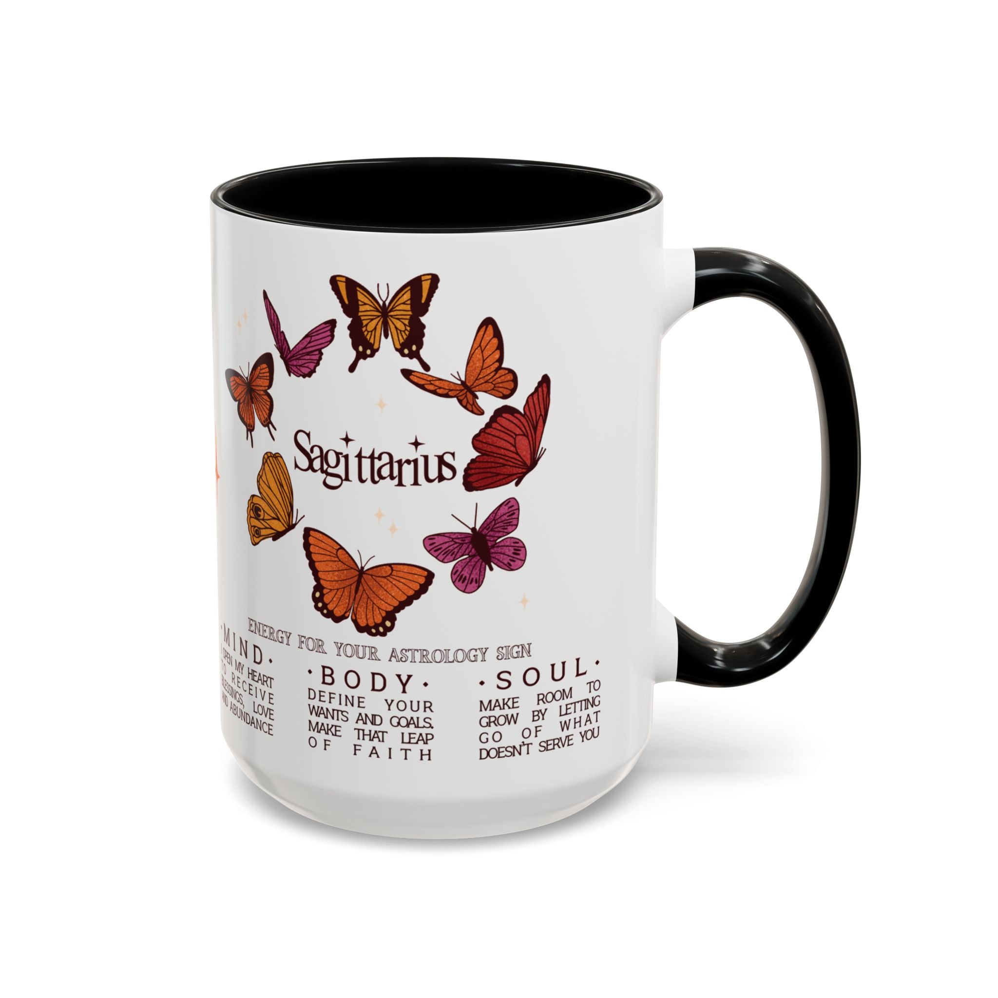 Attention all Sagittarius sweethearts! This gentle, self-loving mug belongs in your daily rotation! Featuring gorgeous butterflies framing your sign name, the star of this show is the soft little reminders to take good care of yourself--mind, body, and soul. Whether you're looking for a lovely gift or treating yourself, this is your mug!