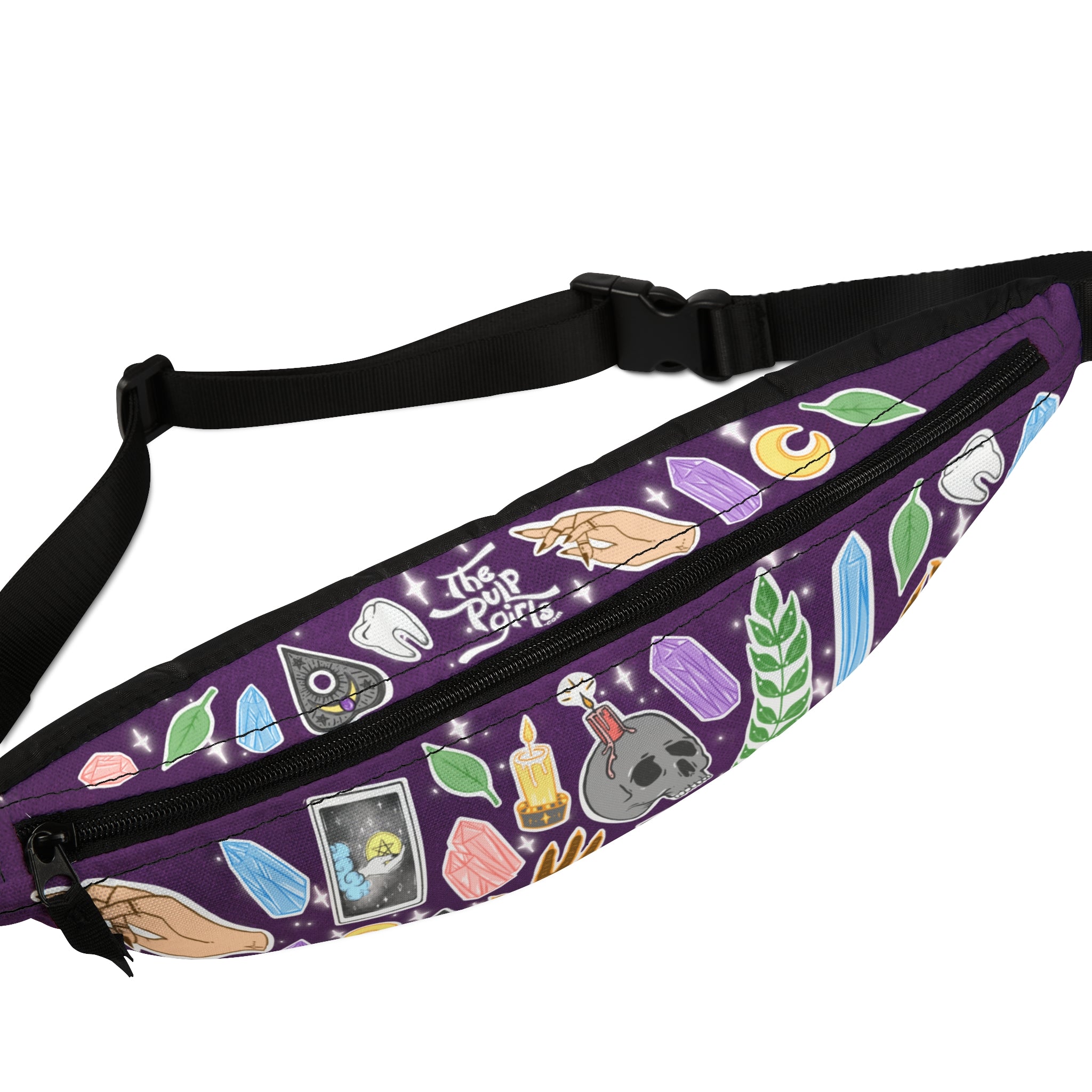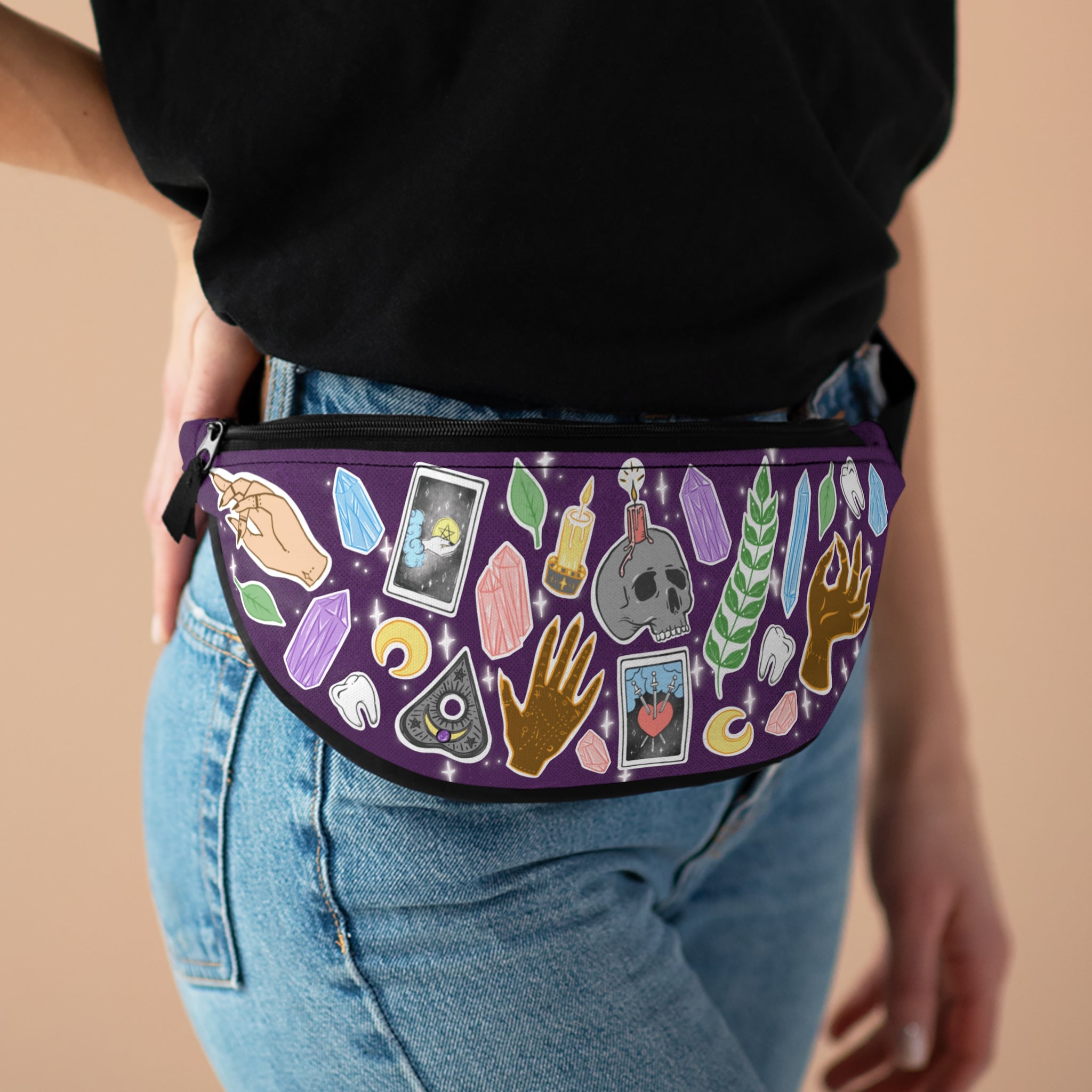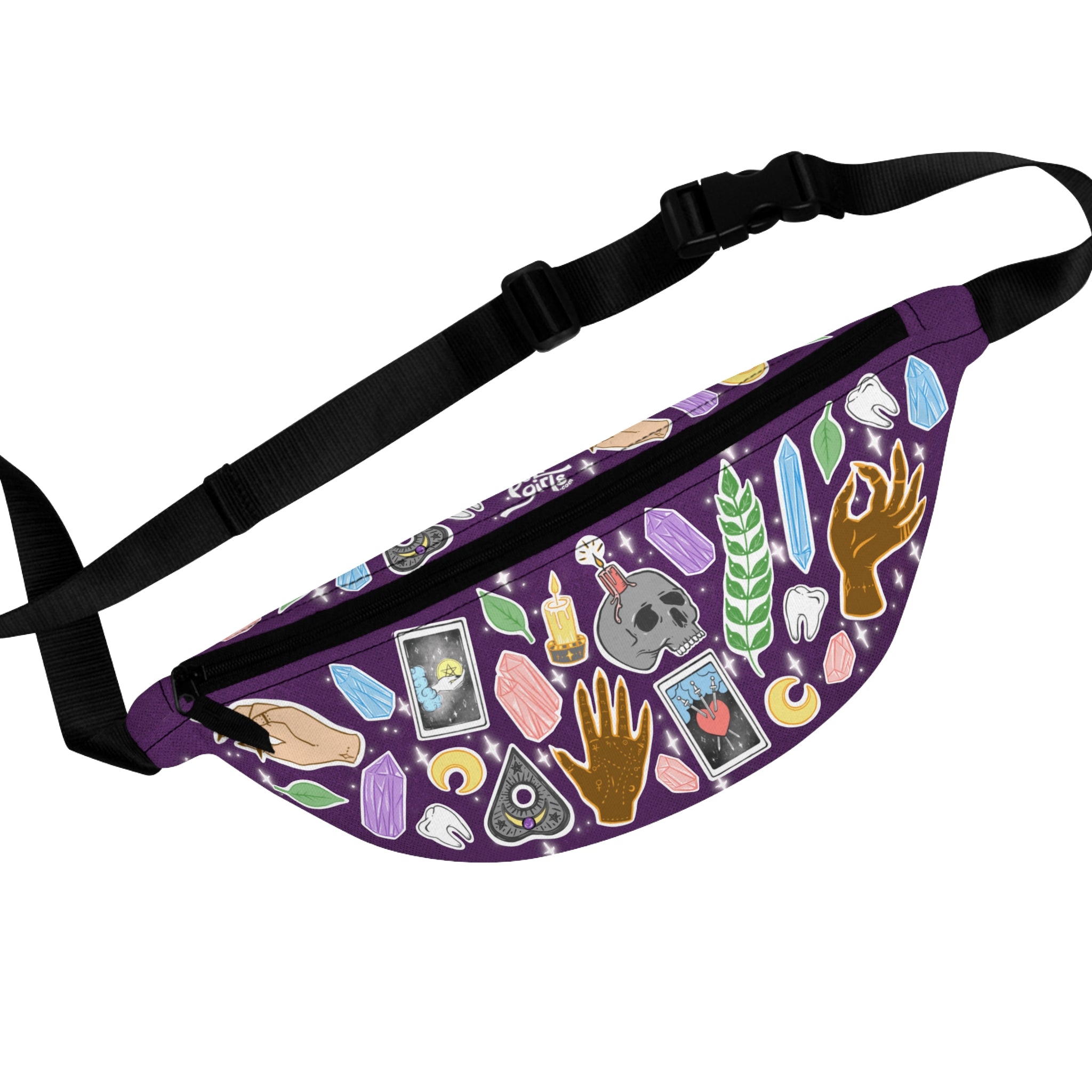 The PERFECT fanny pack for spooky season enthusiasts! It has an adjustable strap to fit any waist while lying flat against your body. The back panel is made to protect from wear and tear and is easy to clean. It also includes a back zipper, an inside zipper pocket, and 3 cardholders. It also features an adjustable handle with a clip and a liner with an inside divider for organizing. Make it pop with your designs!