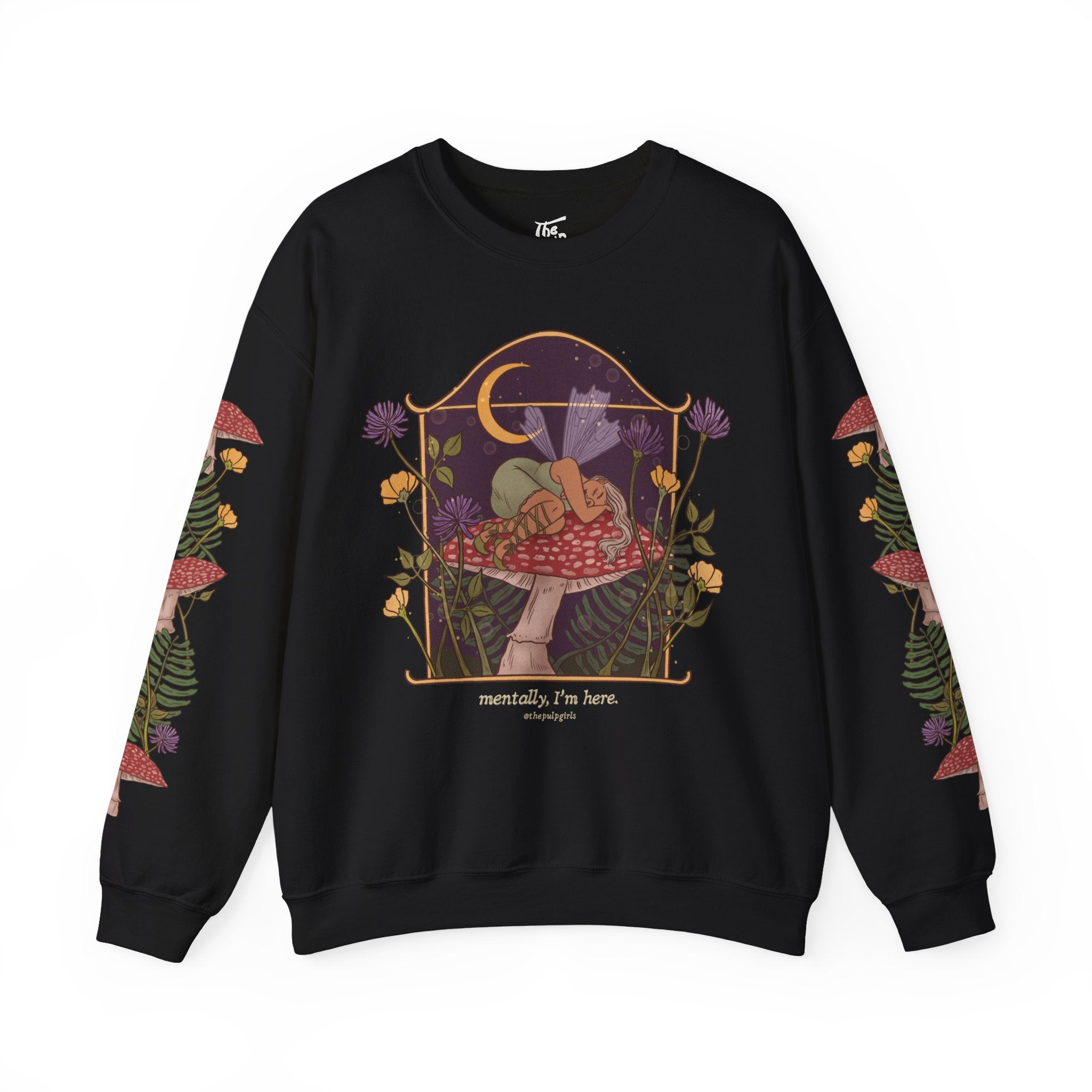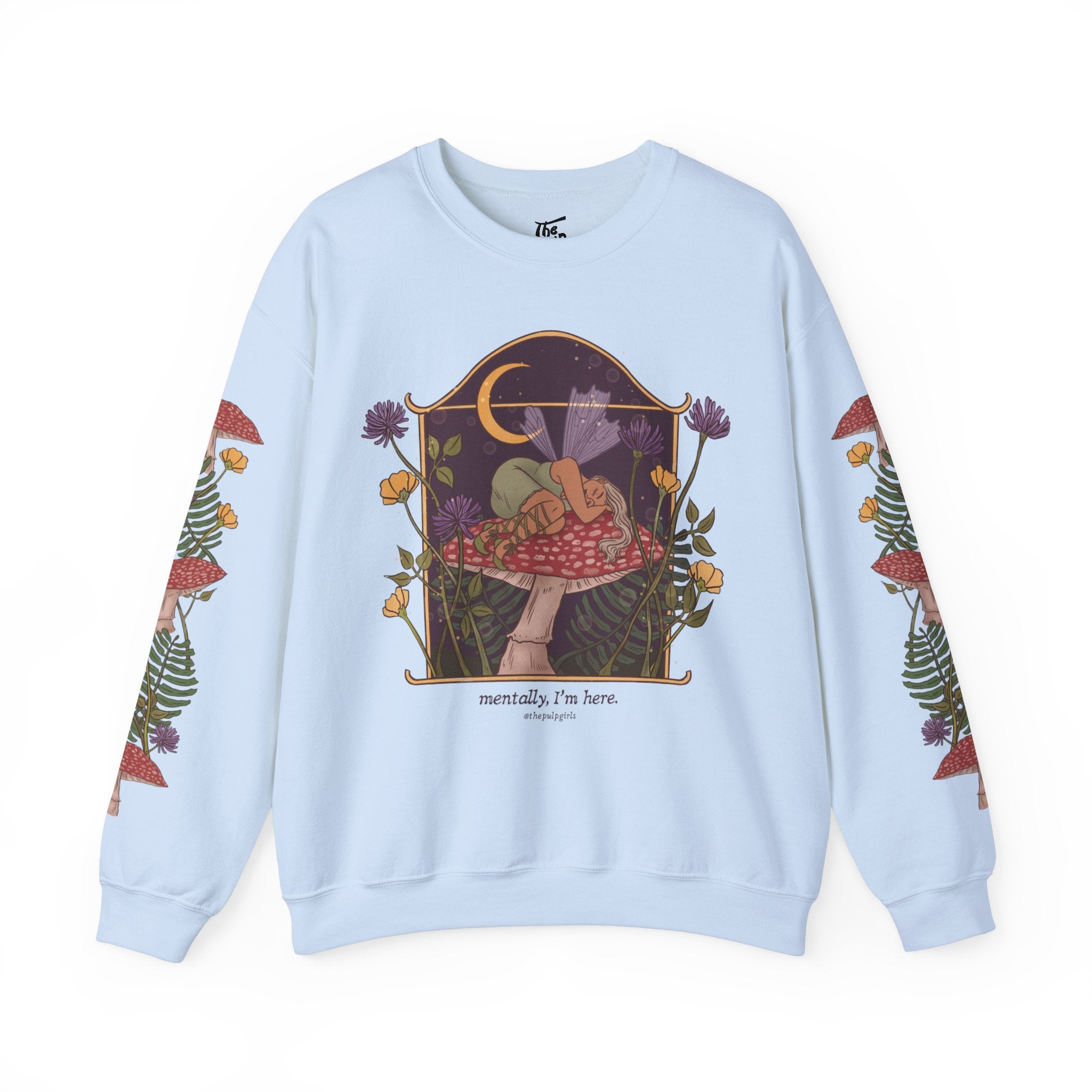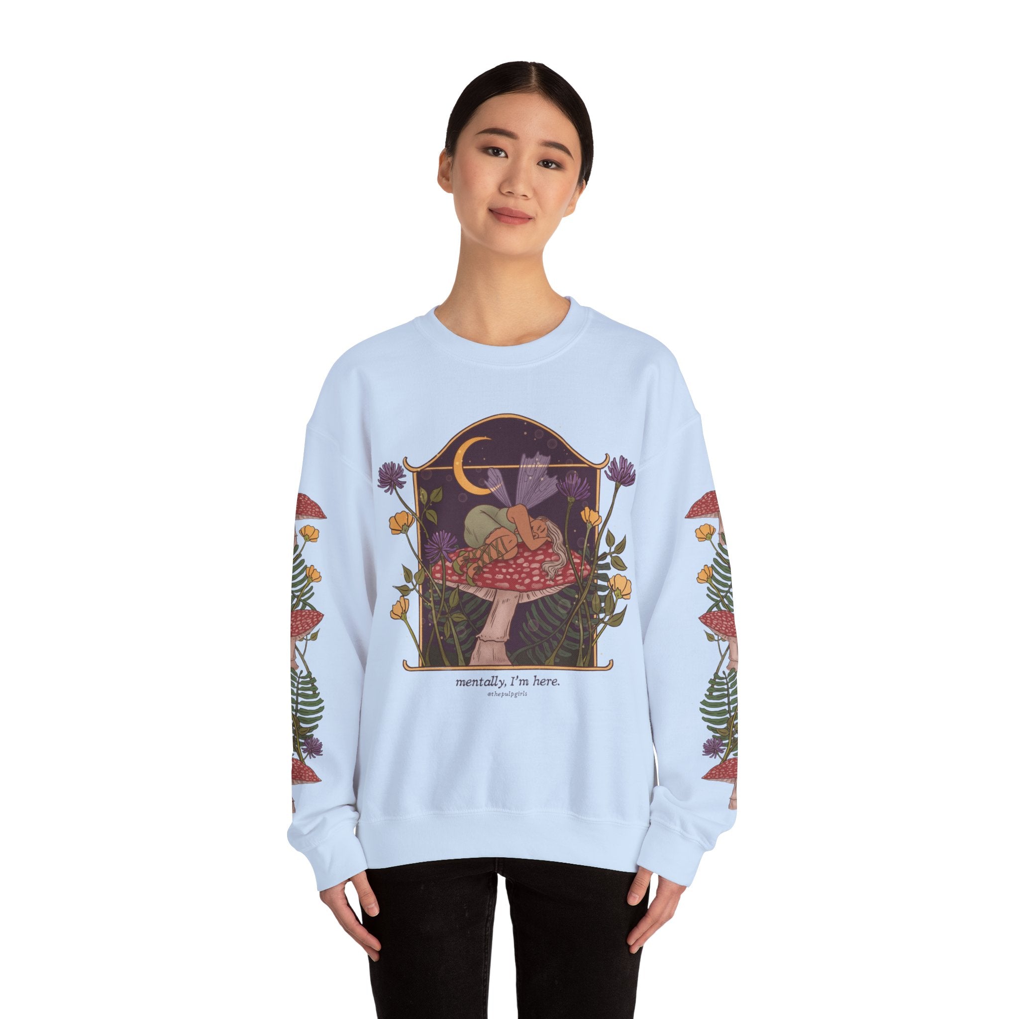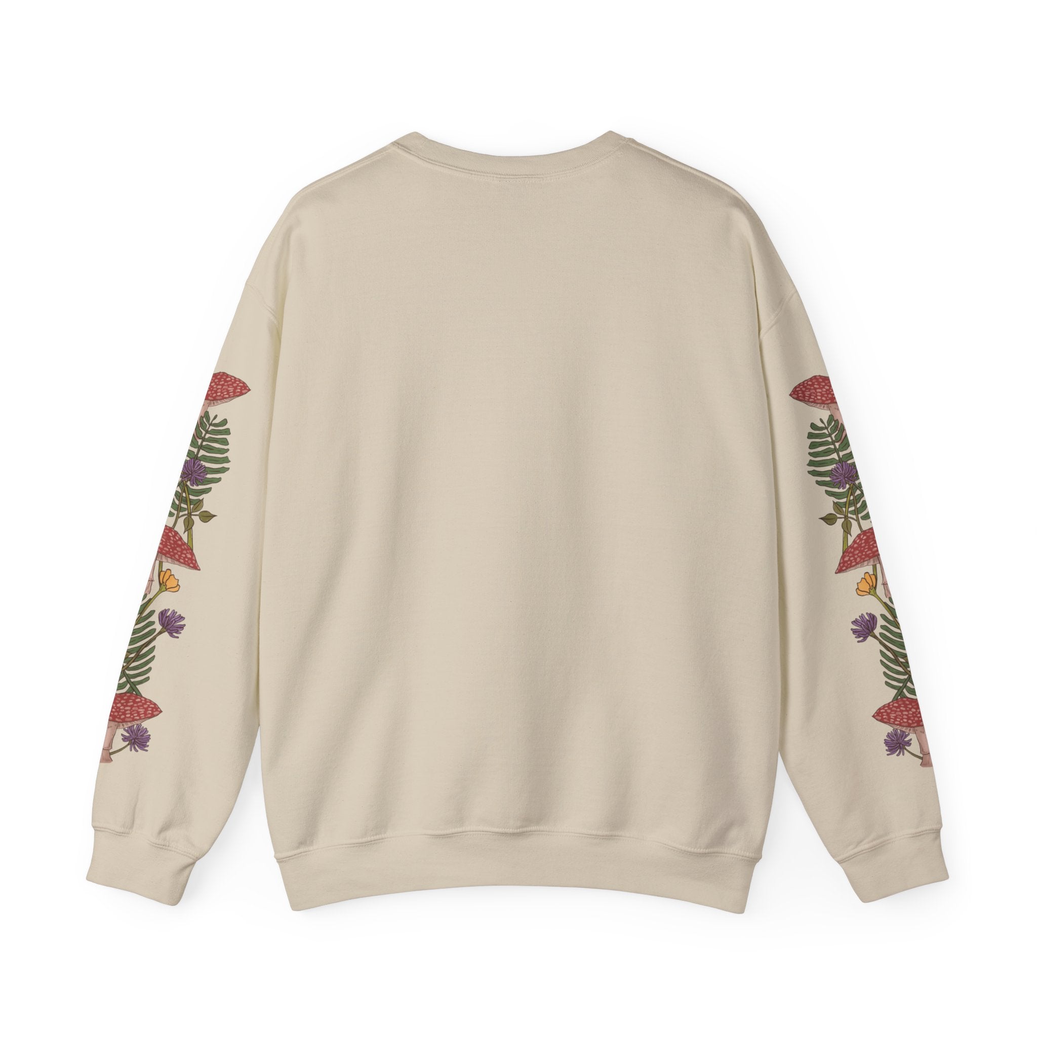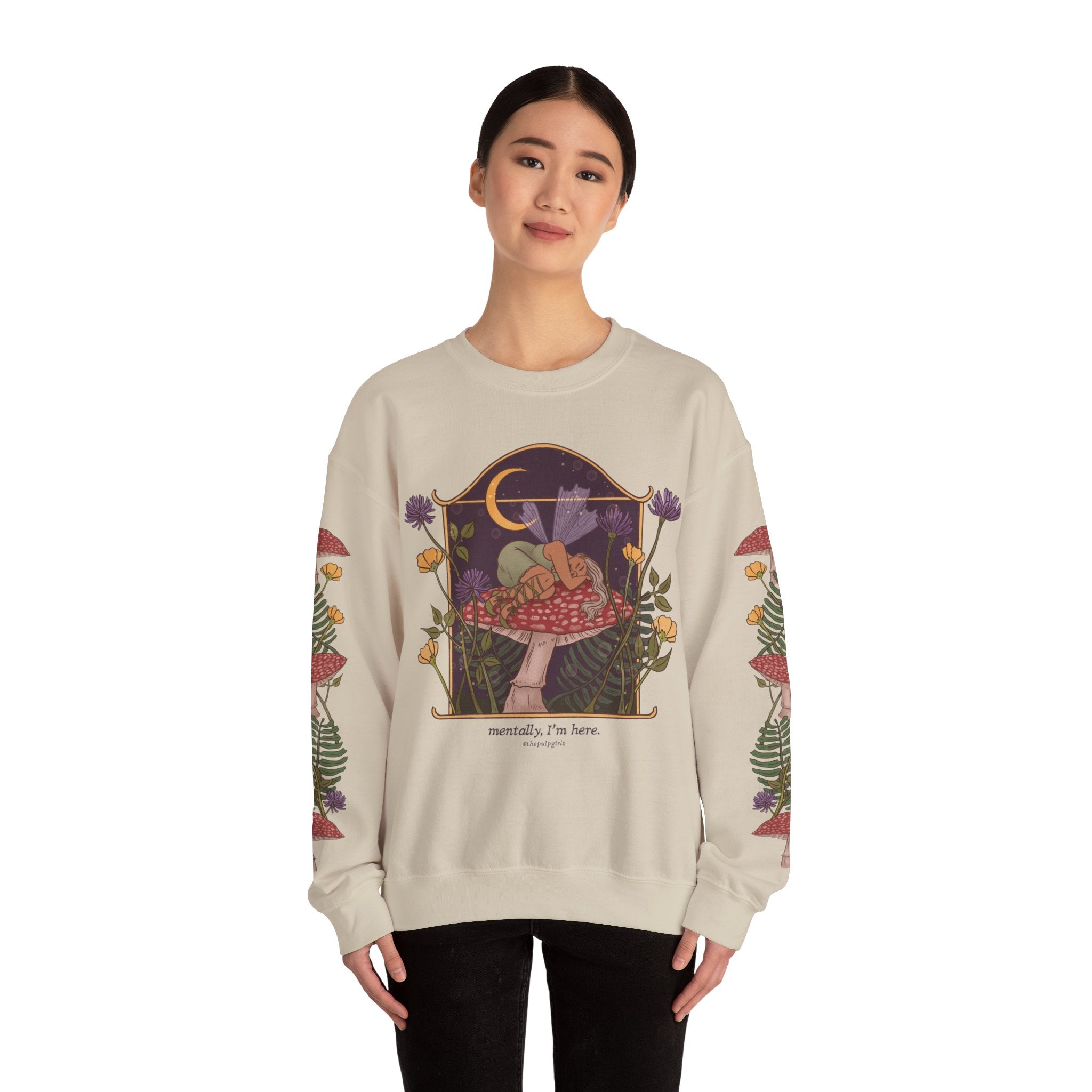 For all those earth signs (and mushroom lovers, fairycore cuties, and goblincore beauties) out there, this is the crewneck sweatshirt for you! Featuring a beautiful art nouveau-inspired earth goddess in fairy form, napping on a mushroom among wildflowers. Perfect for any and all lovers of the fae, magic, witchcraft, femme aesthetics, and fairycore!