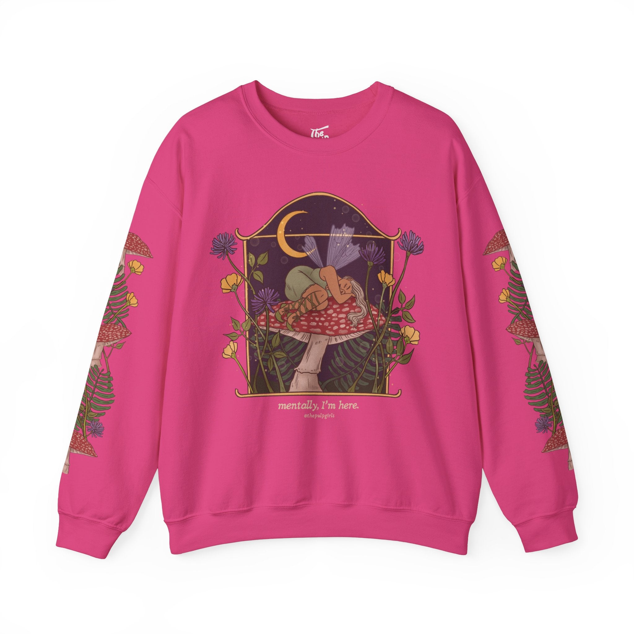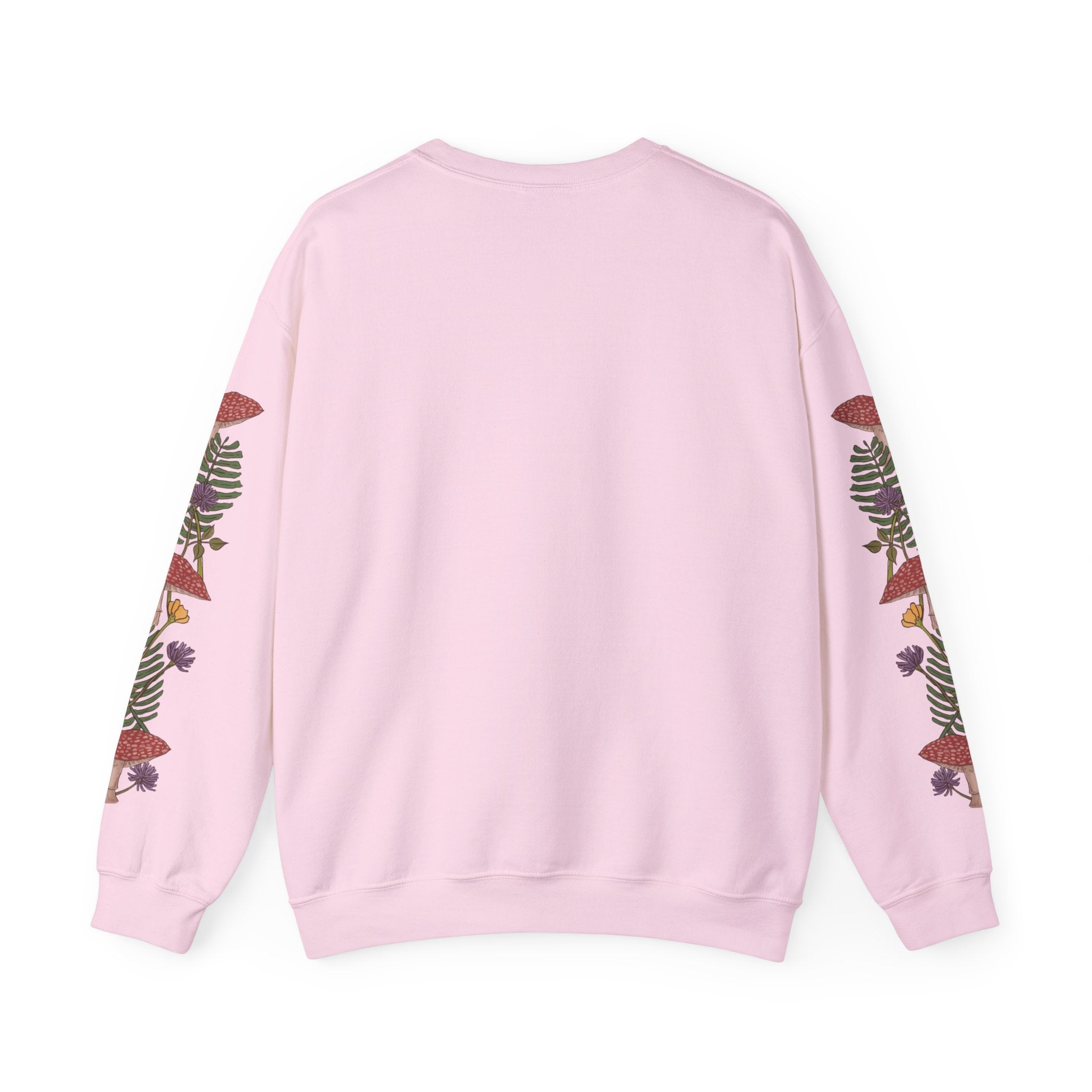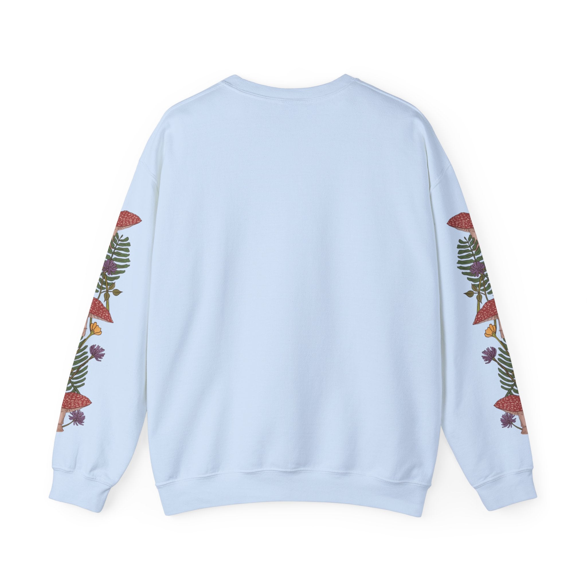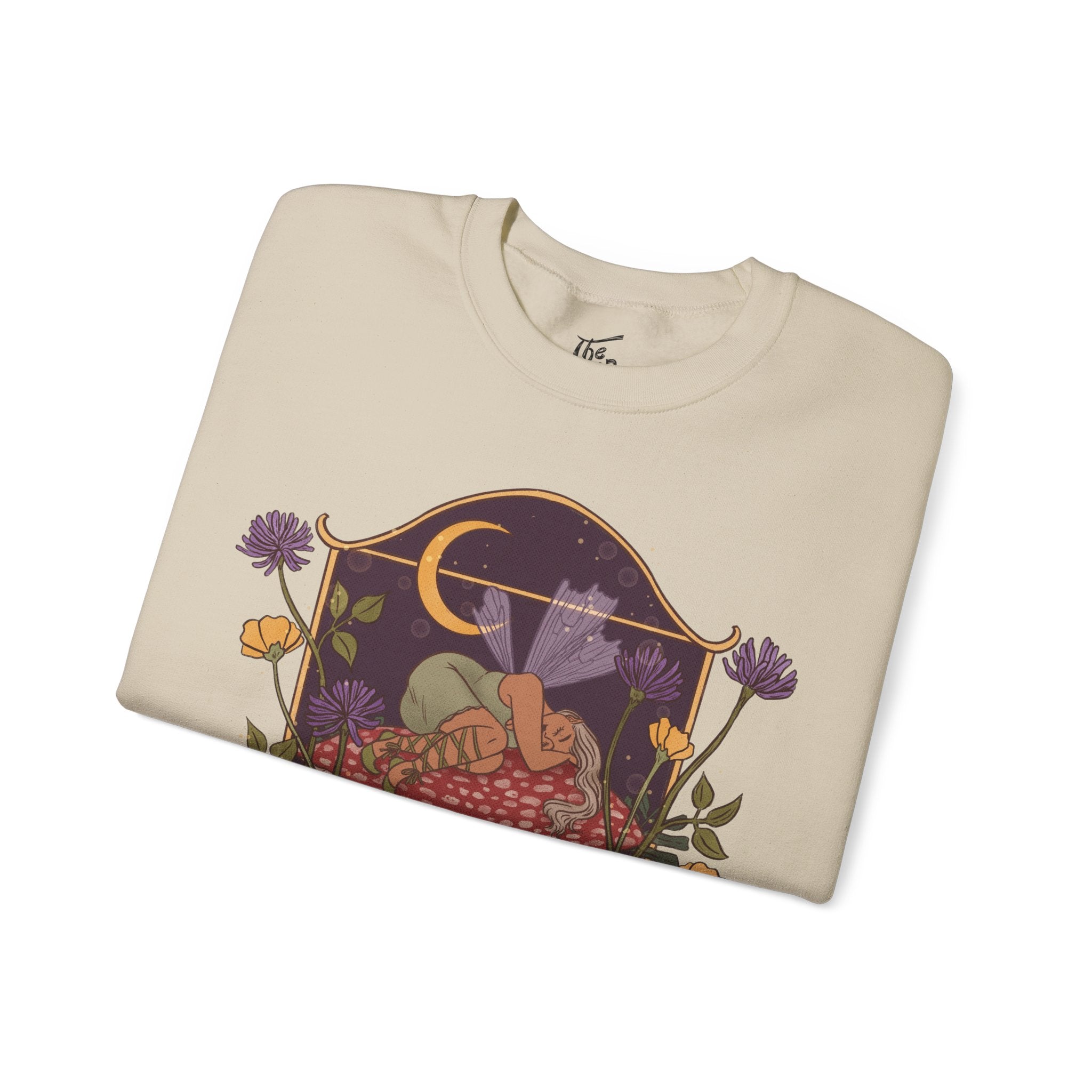 For all those earth signs (and mushroom lovers, fairycore cuties, and goblincore beauties) out there, this is the crewneck sweatshirt for you! Featuring a beautiful art nouveau-inspired earth goddess in fairy form, napping on a mushroom among wildflowers. Perfect for any and all lovers of the fae, magic, witchcraft, femme aesthetics, and fairycore!
