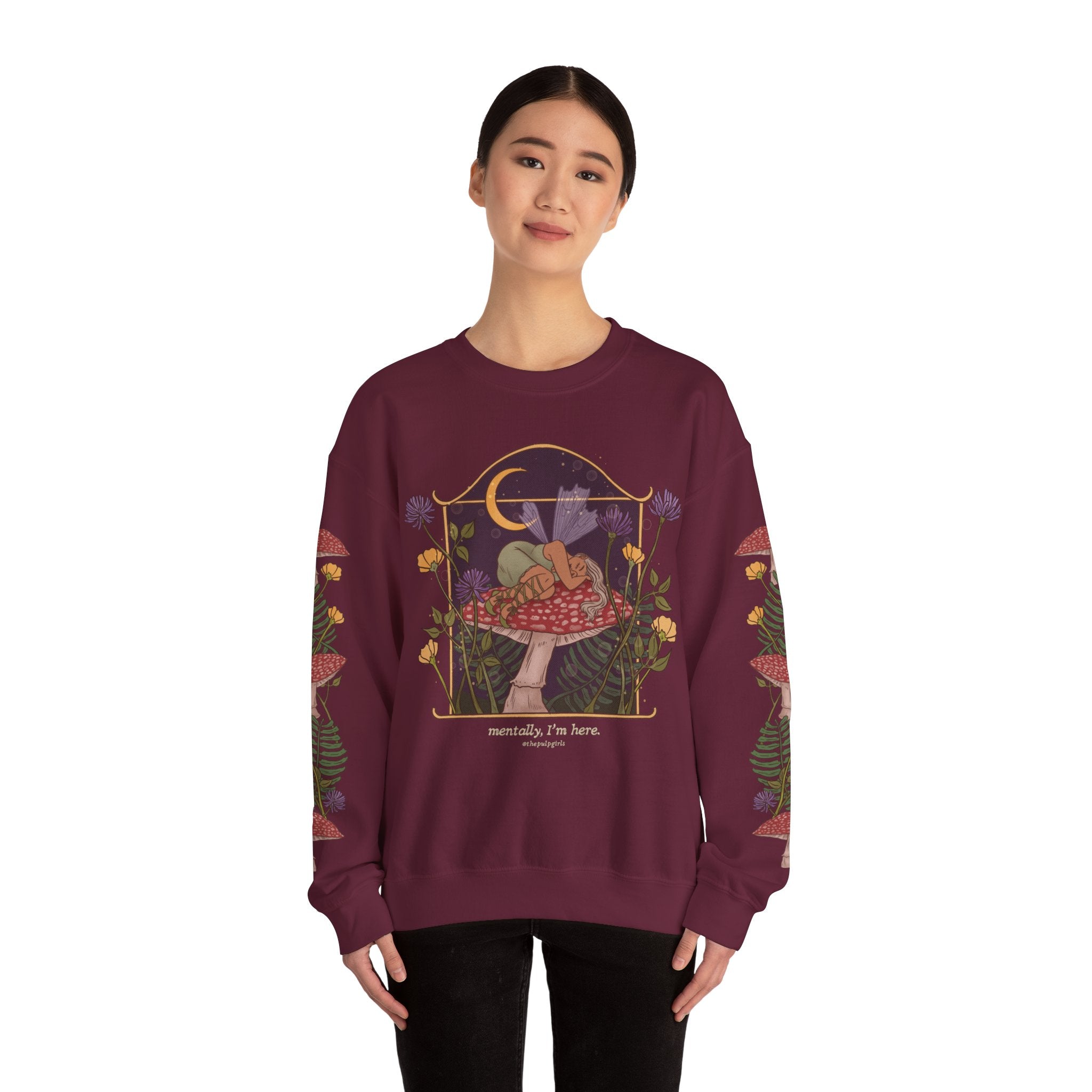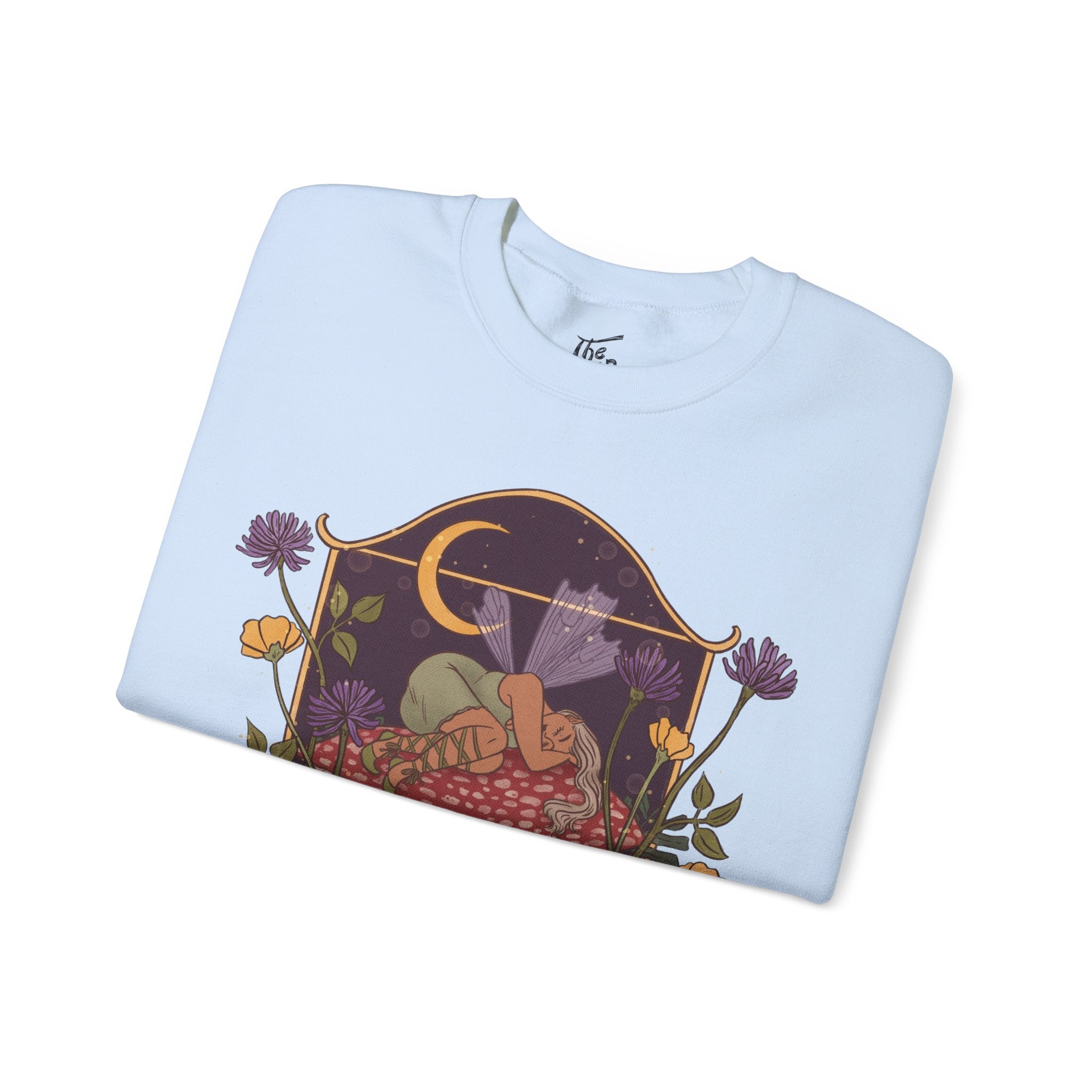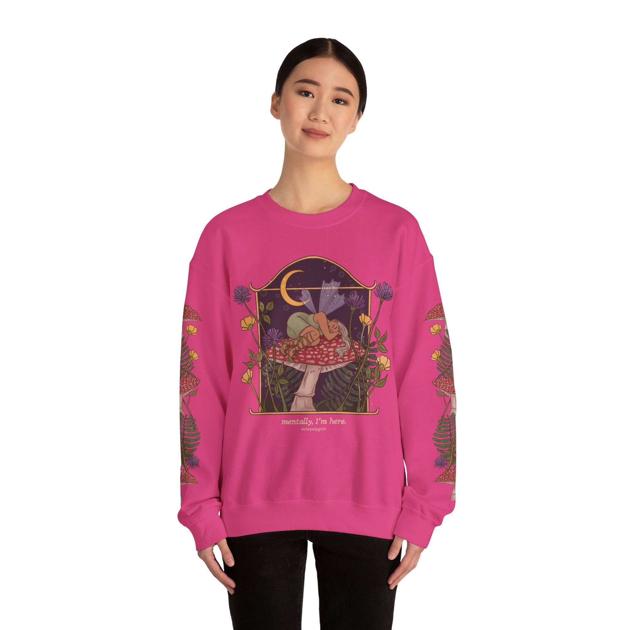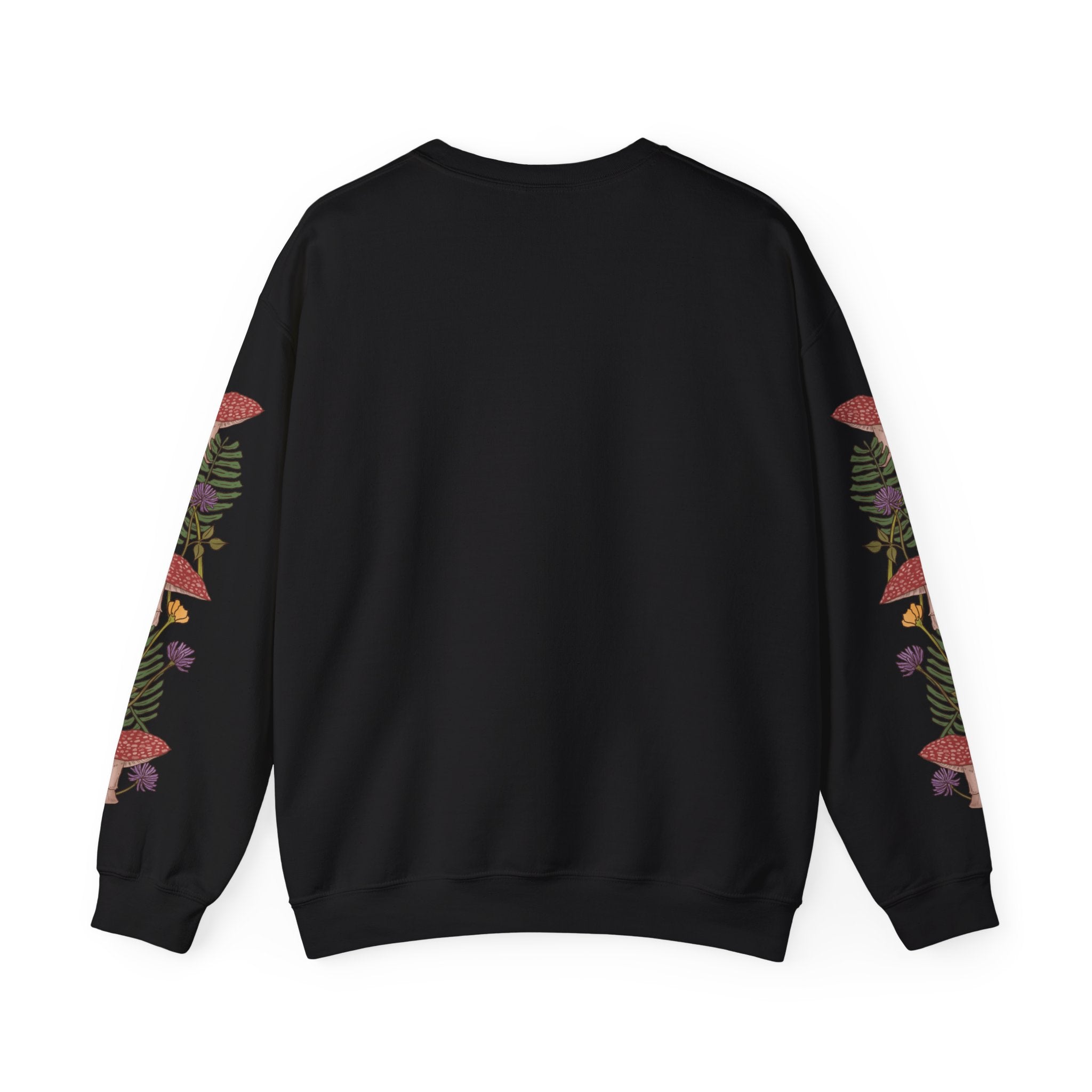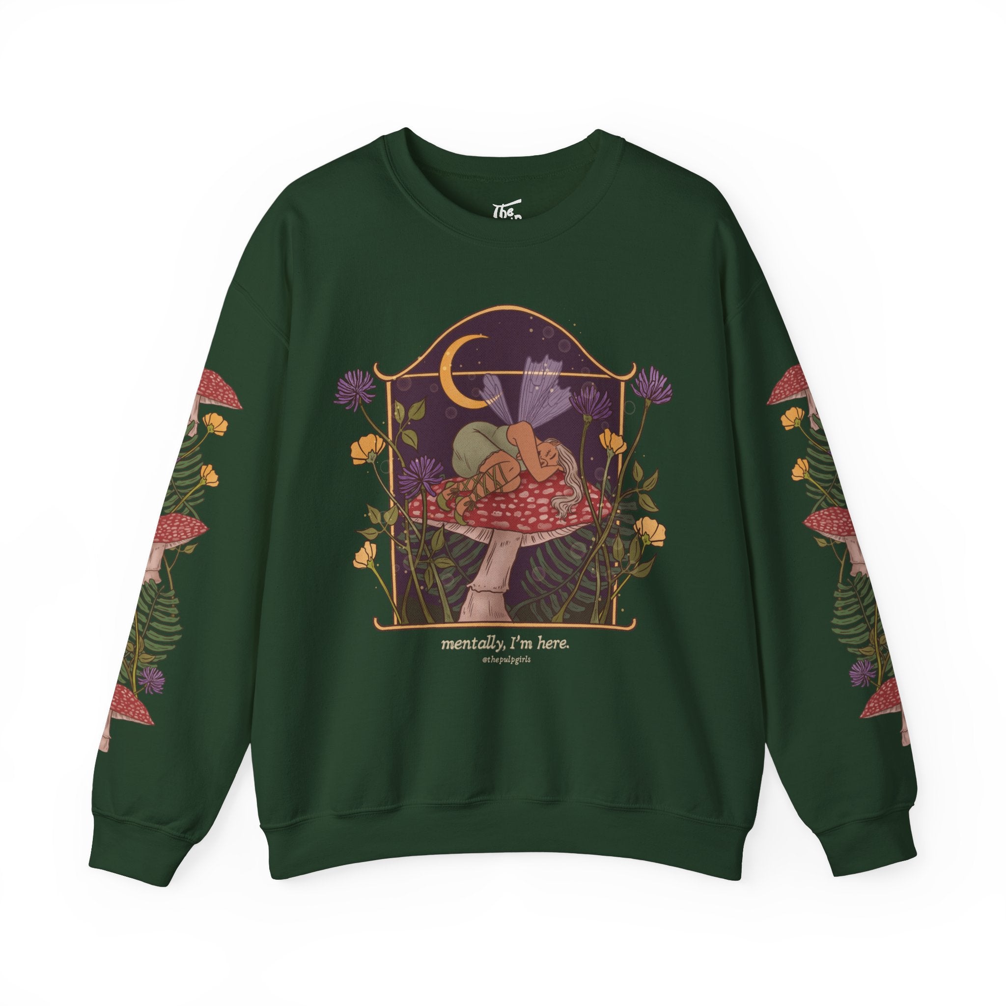 For all those earth signs (and mushroom lovers, fairycore cuties, and goblincore beauties) out there, this is the crewneck sweatshirt for you! Featuring a beautiful art nouveau-inspired earth goddess in fairy form, napping on a mushroom among wildflowers. Perfect for any and all lovers of the fae, magic, witchcraft, femme aesthetics, and fairycore!