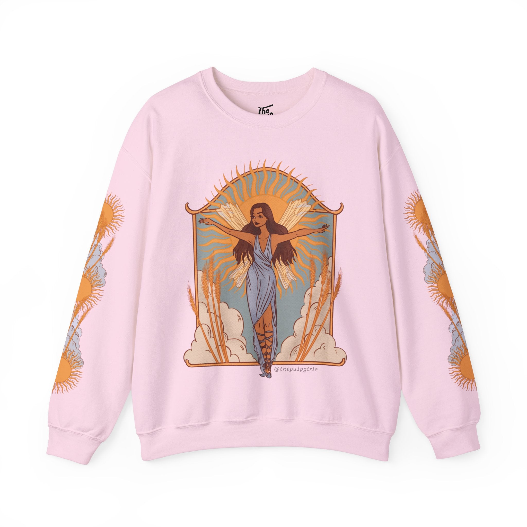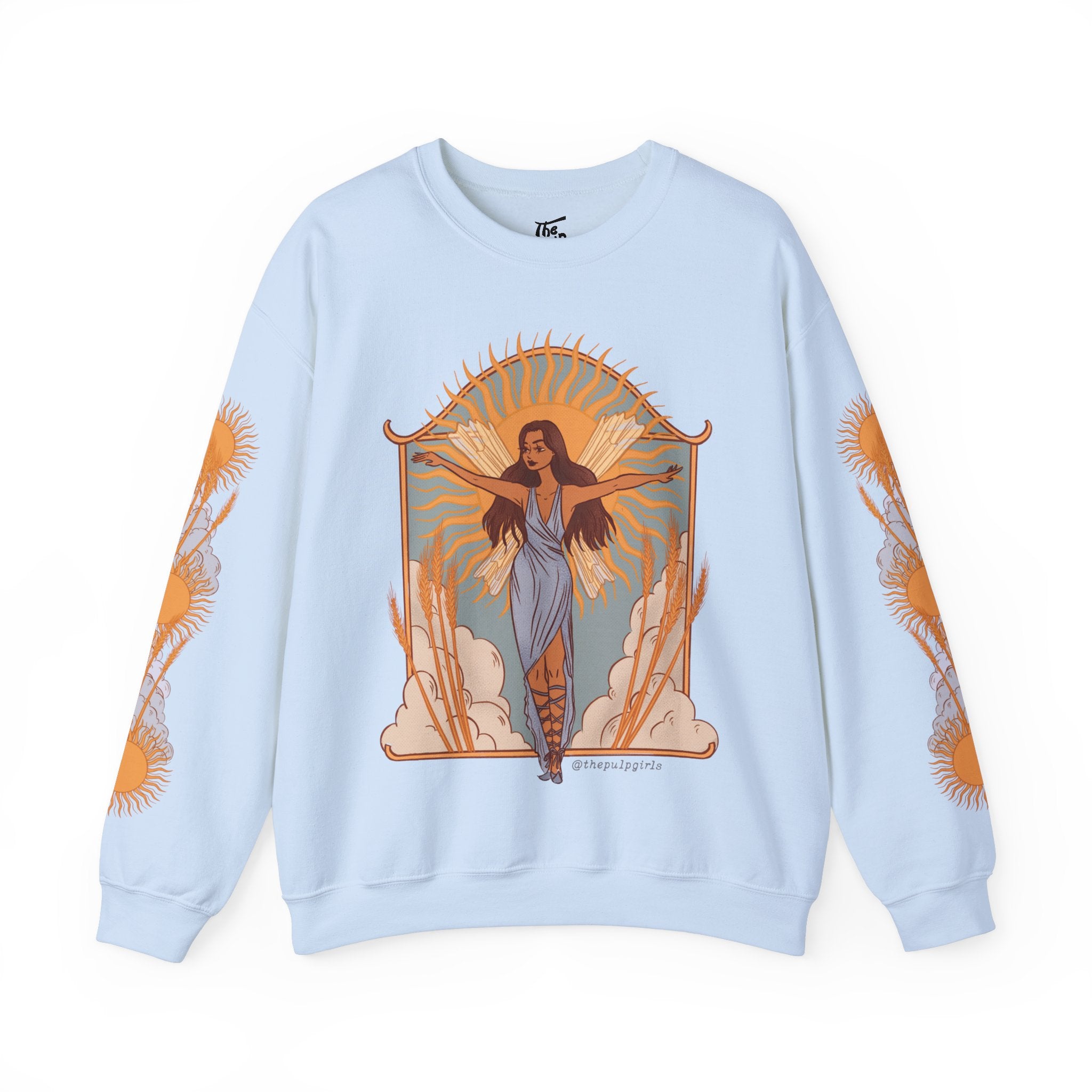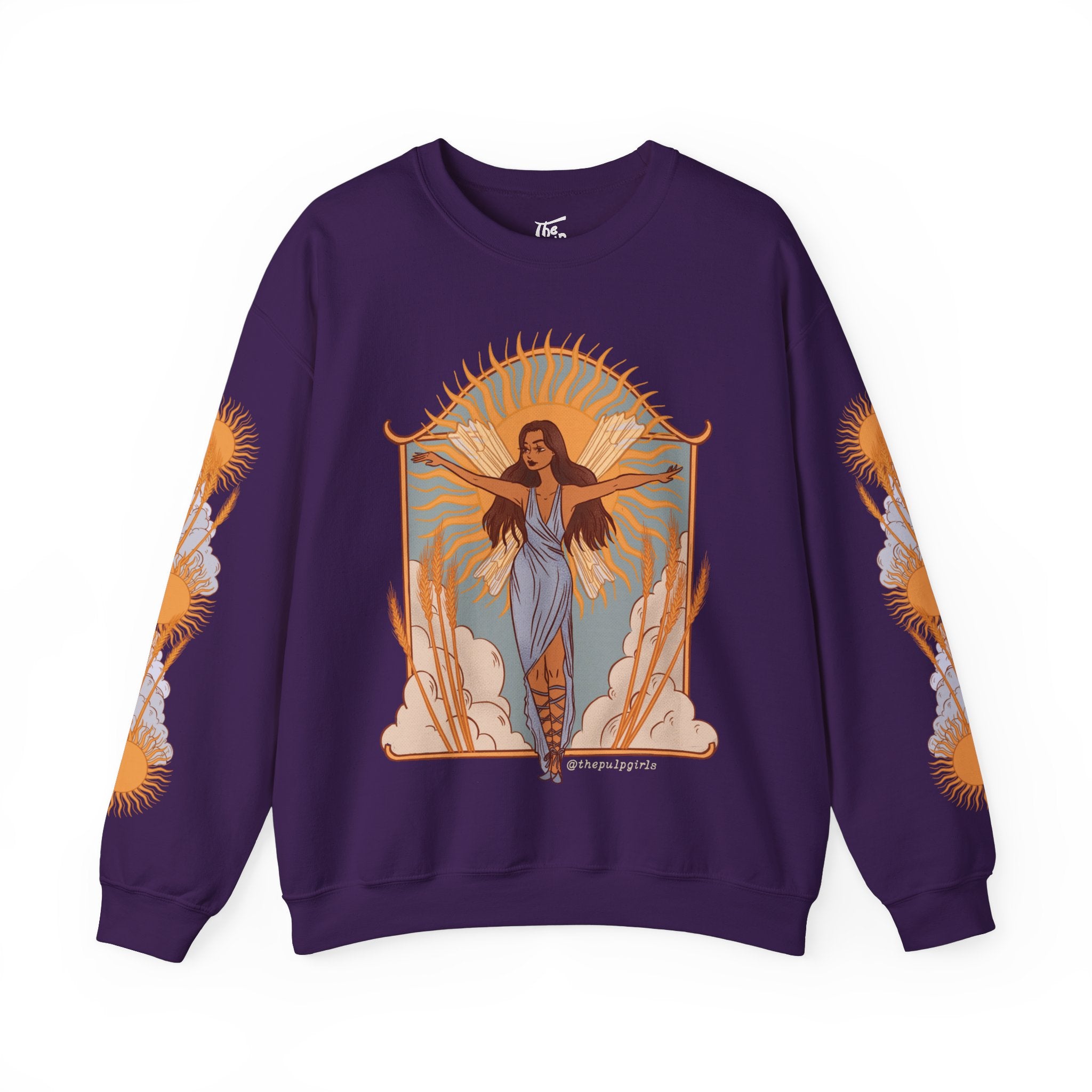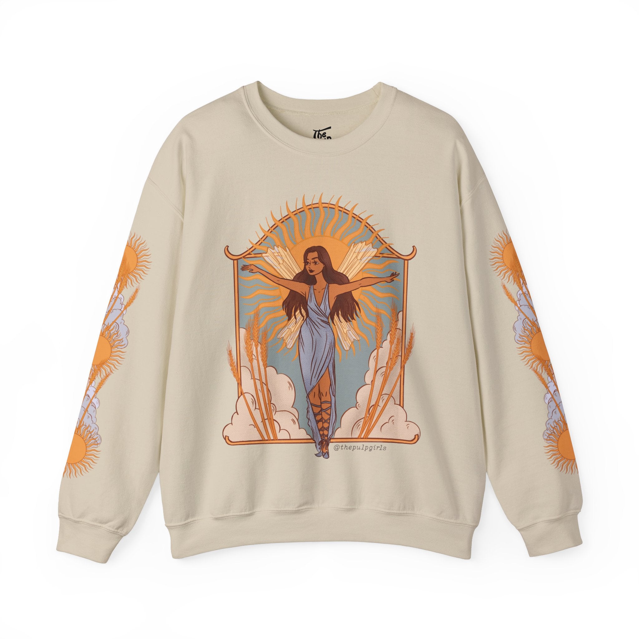 For all those fire signs (and sunny souls, radiant goddesses, and witchy folks) out there, this is the crewneck sweatshirt for you! Featuring a beautiful art nouveau-inspired fire goddess in fairy form, complete with abundant wheat and the bright, shining sun. Perfect for any and all lovers of the fae, magic, witchcraft, femme aesthetics, and fairycore!