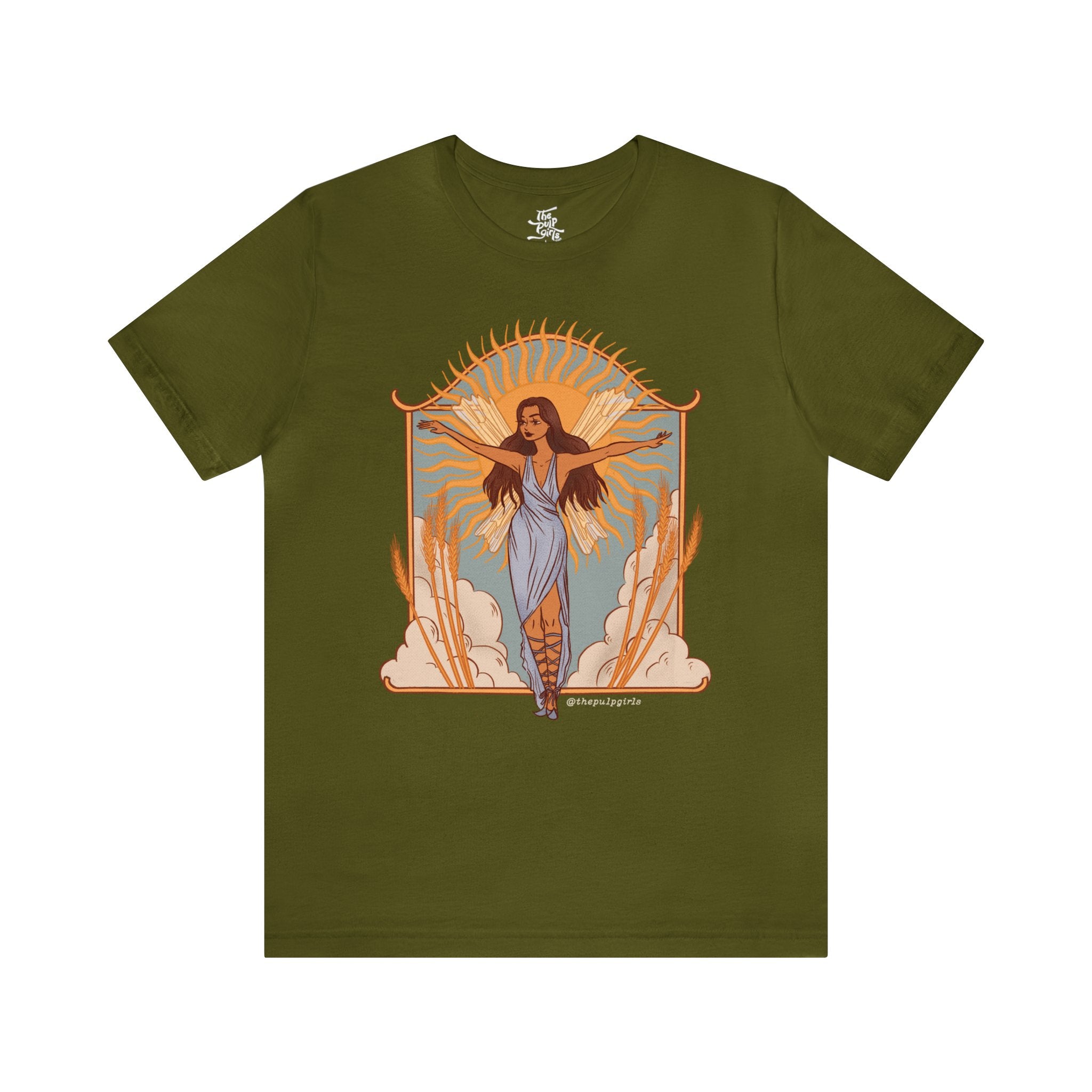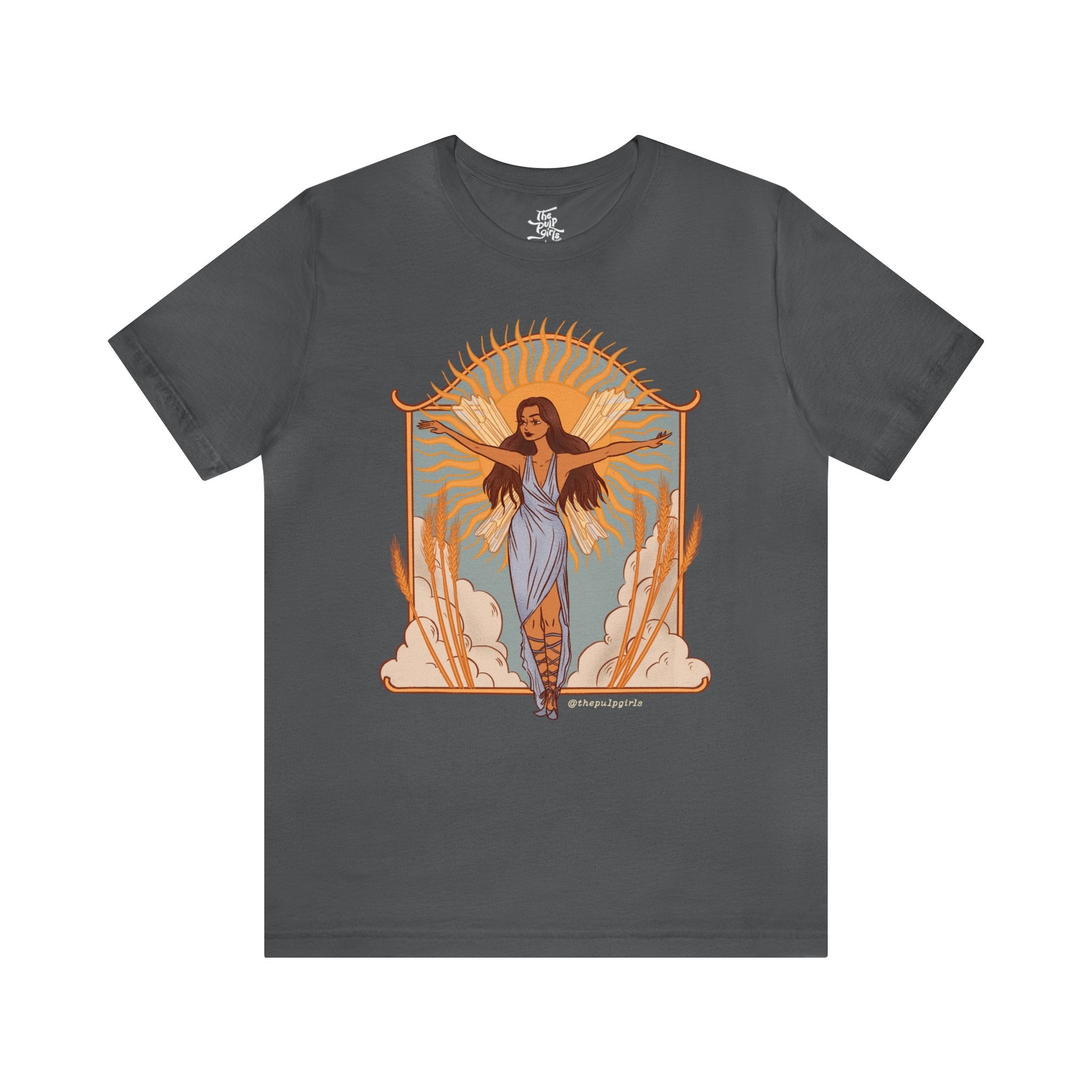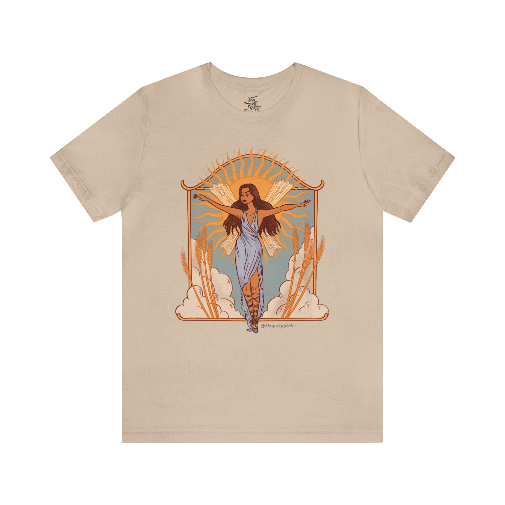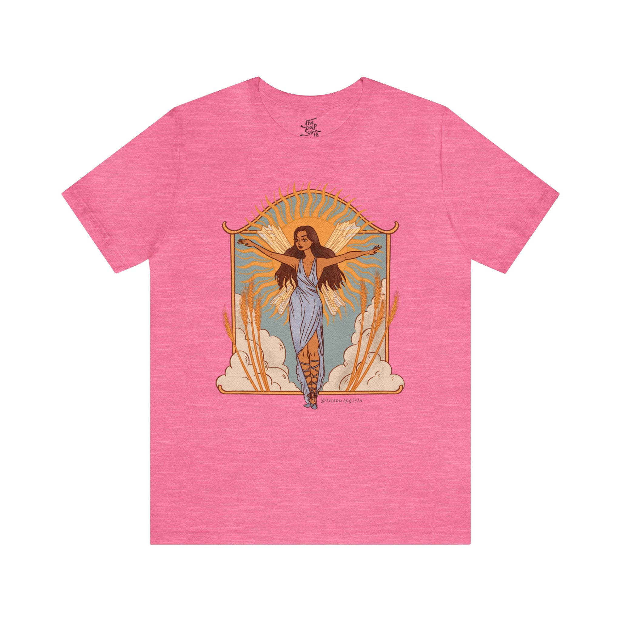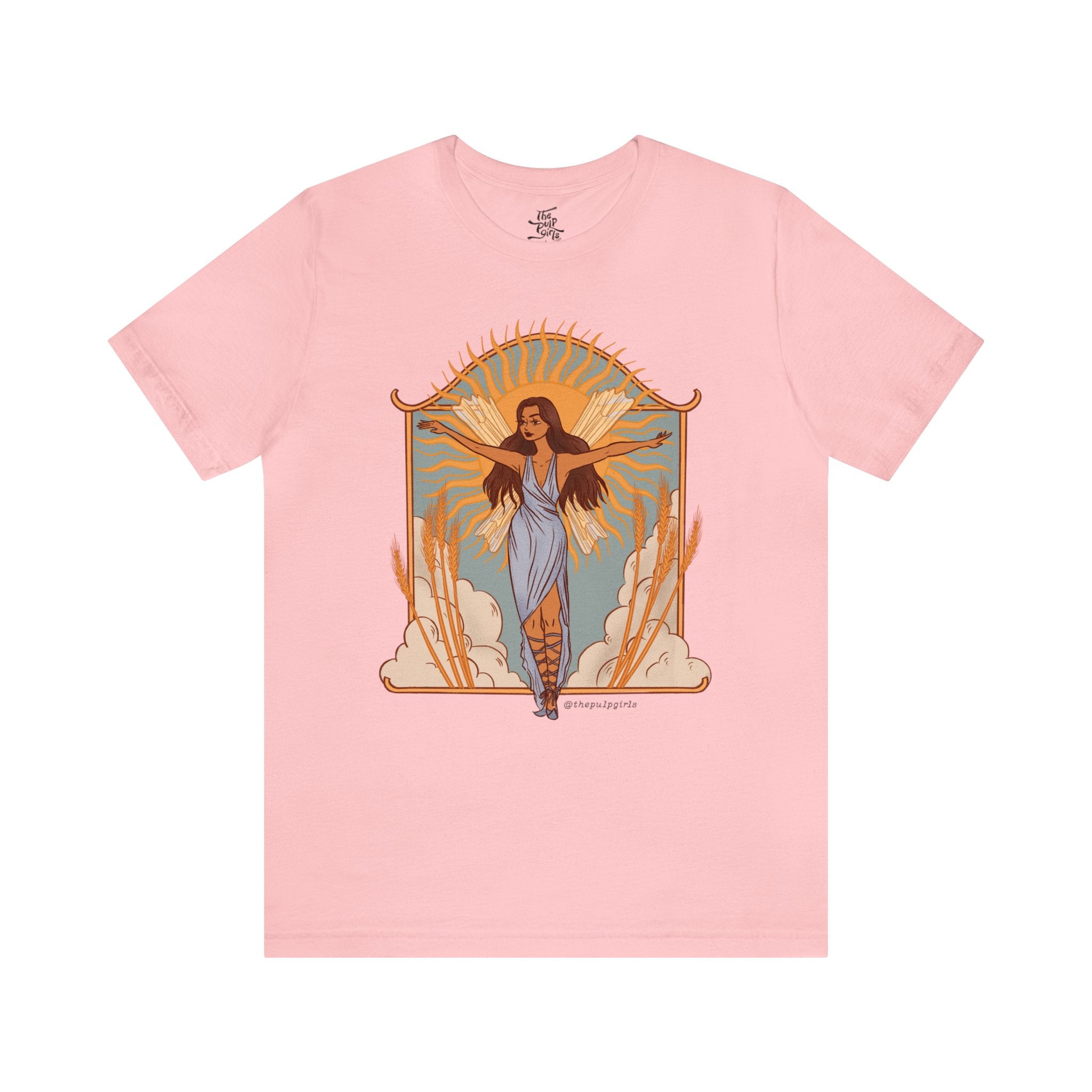 For all those fire signs (and sunny souls, radiant goddesses, and witchy folks) out there, this is the tee for you! Featuring a beautiful art nouveau-inspired fire goddess in fairy form, complete with abundant wheat and the bright, shining sun. Perfect for any and all lovers of the fae, magic, witchcraft, femme aesthetics, and fairycore!
