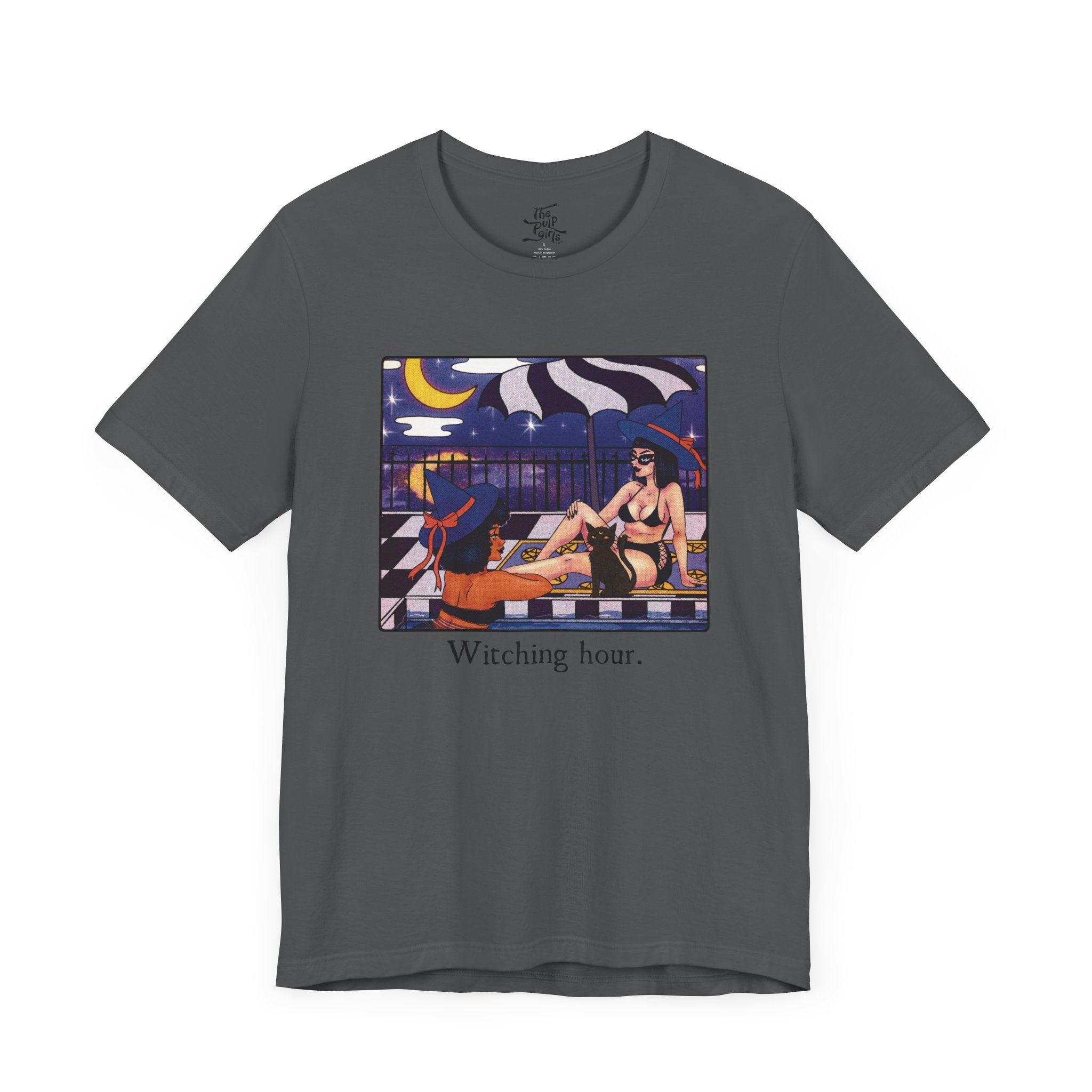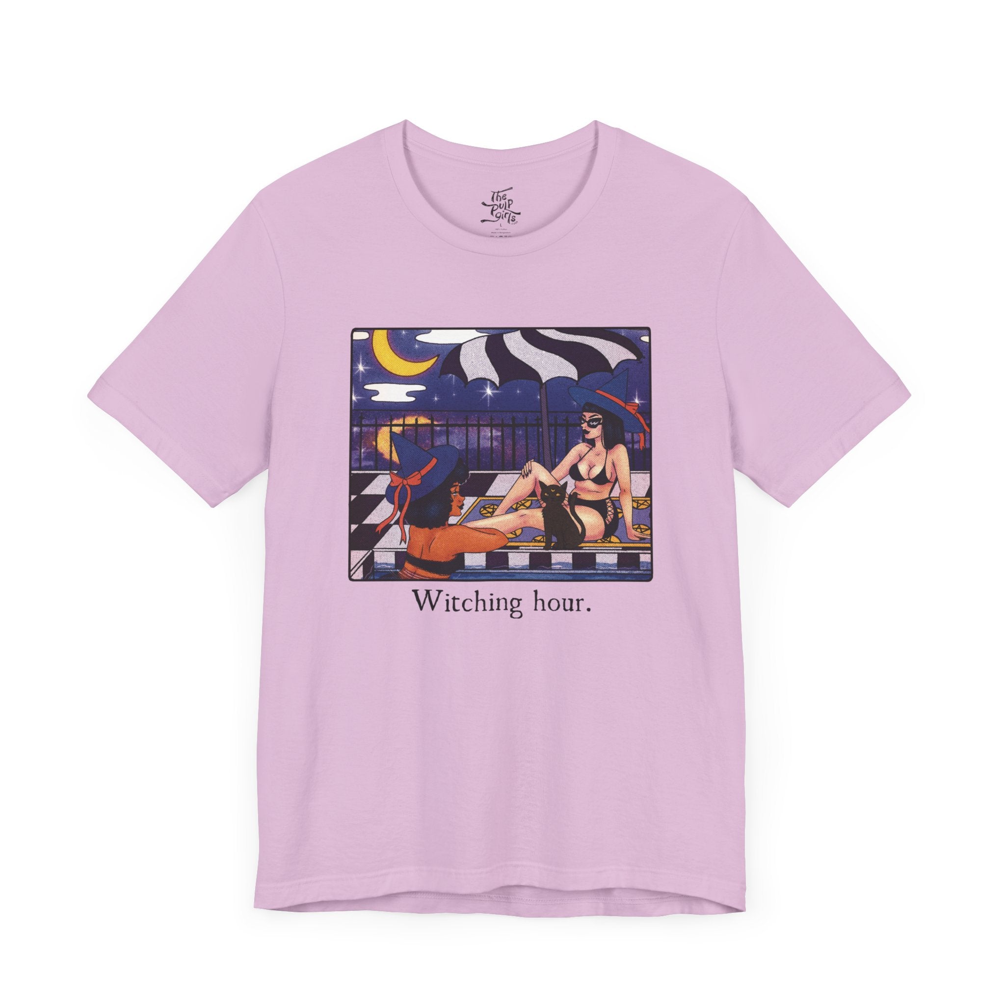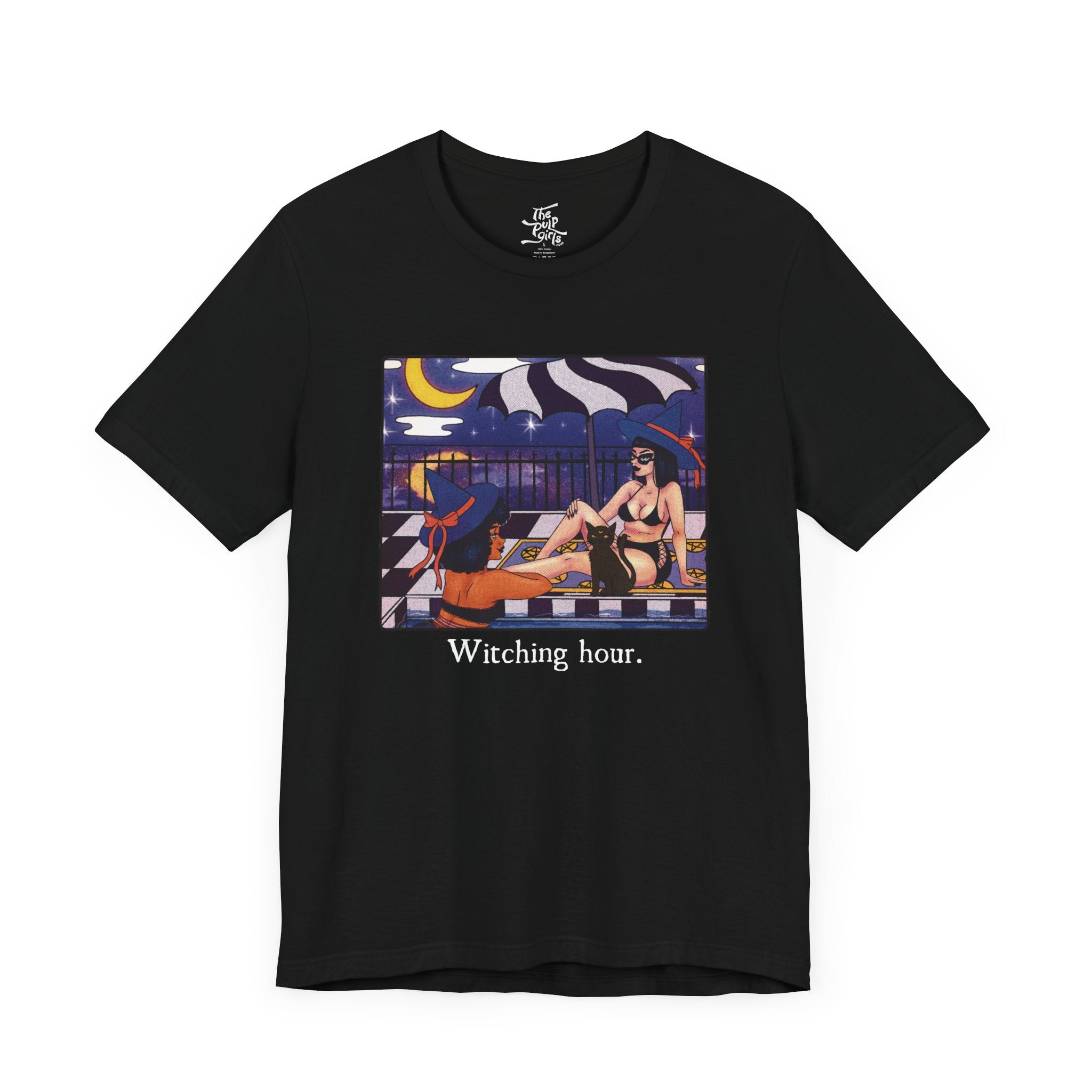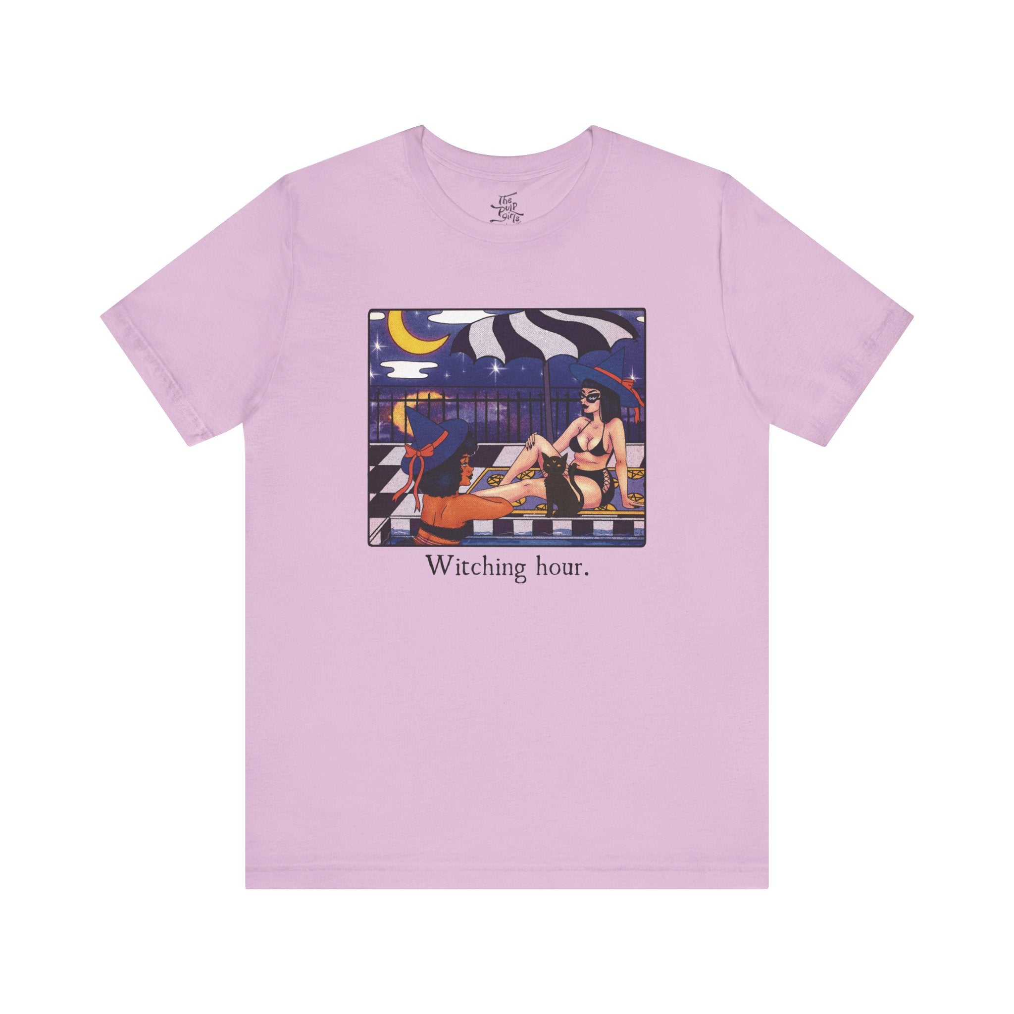 Unisex short sleeve tee featuring two witch besties chilling under the moon. Perfect for those who love witchy aesthetics and want to embrace their inner magic. Ideal for Halloween, witchcraft enthusiasts, and anyone looking to add a touch of the supernatural to their wardrobe.