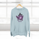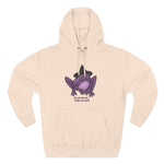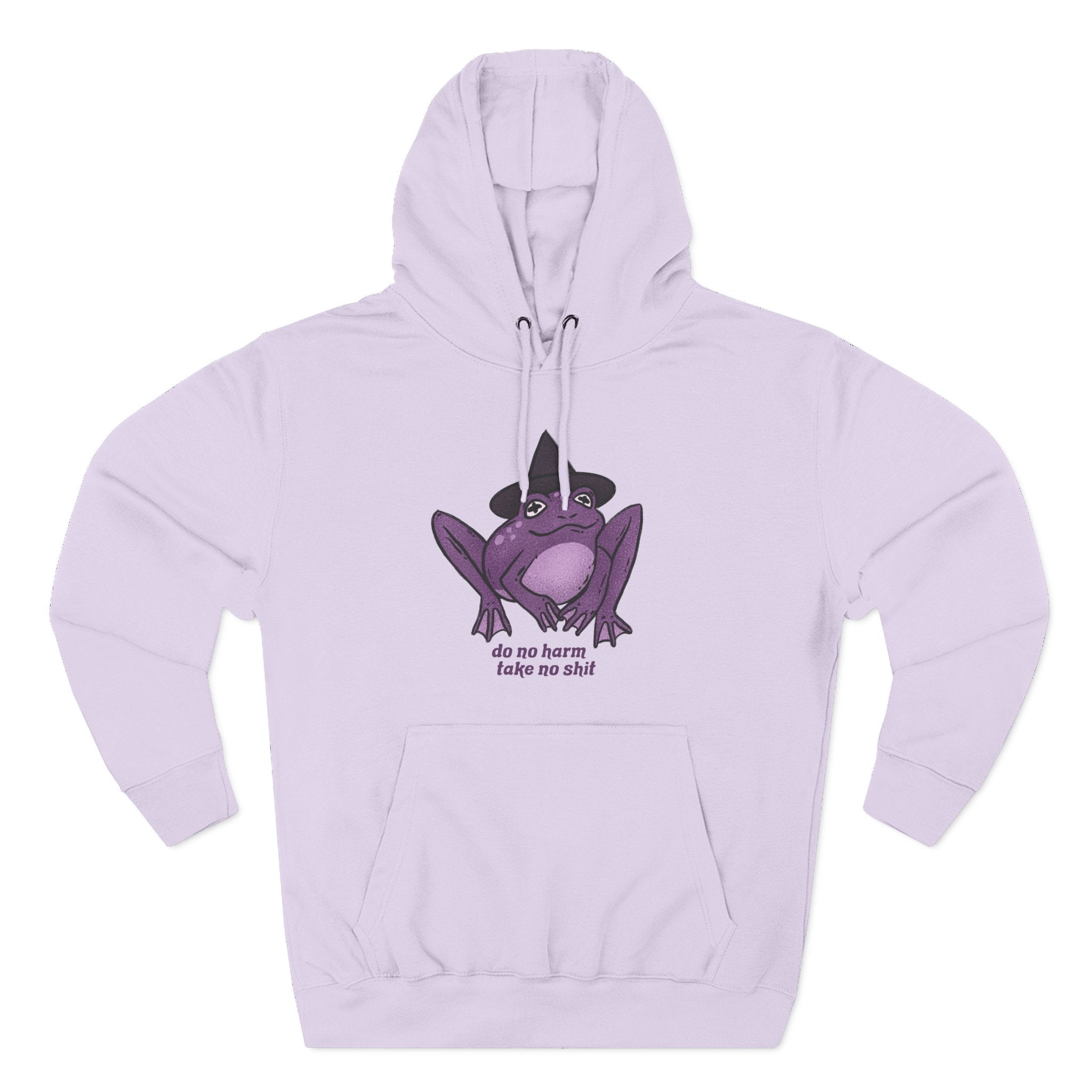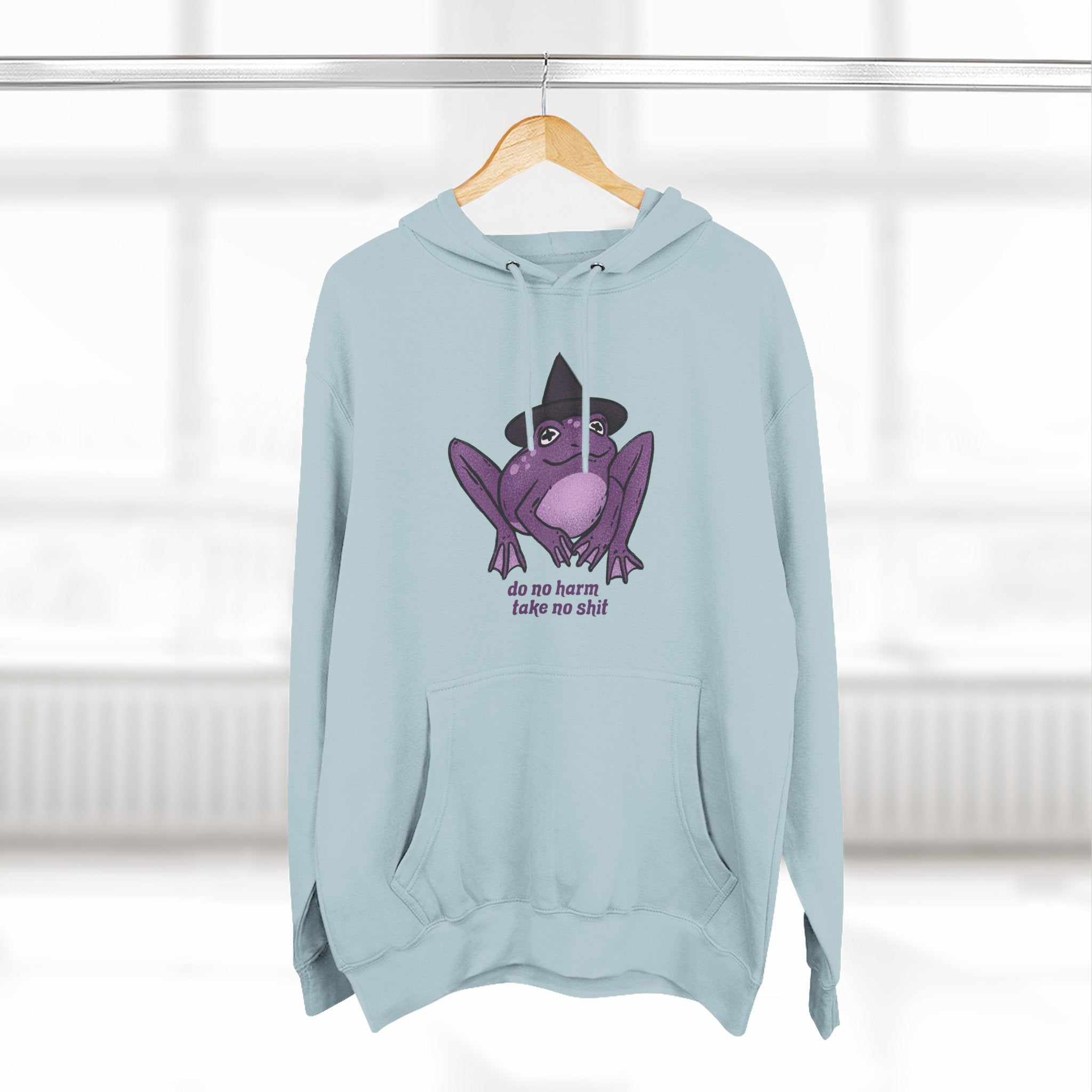 Cuddle into this three-panel fleece hoodie and let this little purple witchy frog do the talking. She's so serene, chilling all frog-like and cute over the words “do no harm take no shit". Wear it on slow mornings with coffee, late-night study sessions, or at small low-drama gatherings. The soft fleece, roomy kangaroo pocket, and adjustable hood make it feel lived-in from the first wear. Just a reminder that you can be kind, yet still maintain your boundaries.
