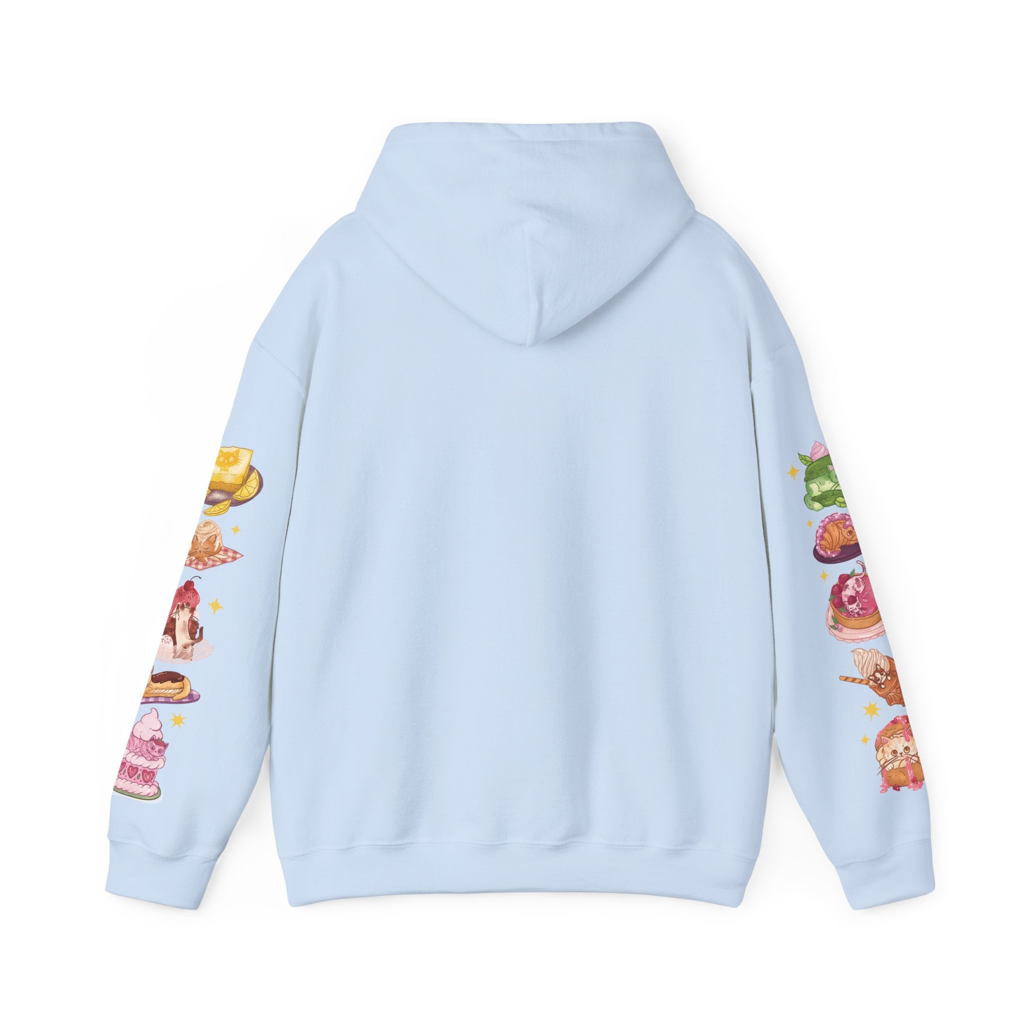 Do you love cats? What about desserts? Maybe even cats AND desserts?? Then this is for sure the comfy, cozy hooded sweatshirt for you! Featuring a scrumptious blueberry cheesecake kitty on the front and a bunch of darling dessert cats along the sleeves, this might be the sweetest shirt you can ever wear!