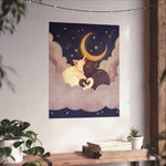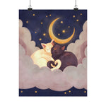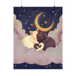 Celebrate love with this darling art print featuring two sweet, loving cats curled up together in a starry night sky. Perfect for cat lovers and those who enjoy a peaceful, serene atmosphere. Ideal for gifting during the holidays or to add a touch of romance to any room.