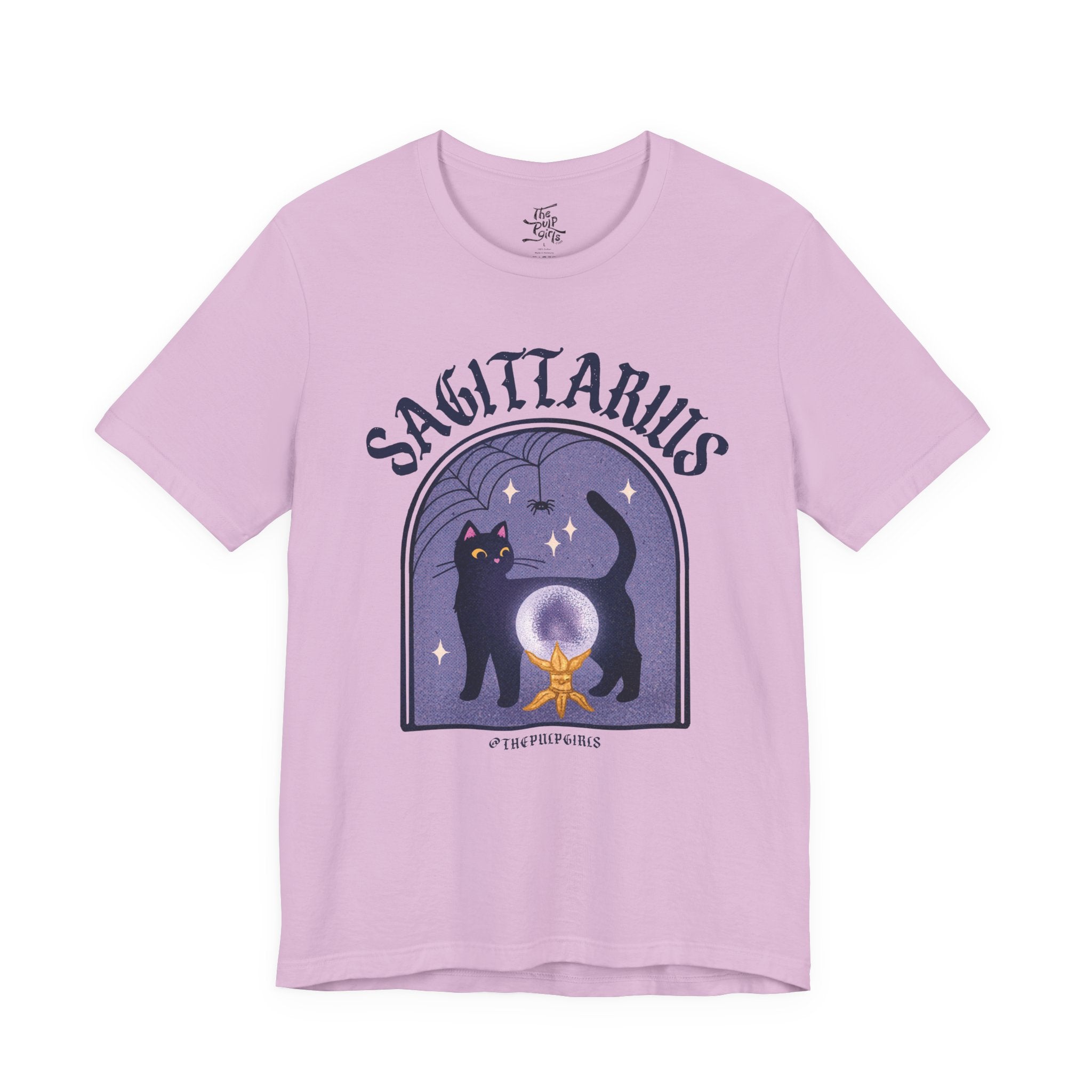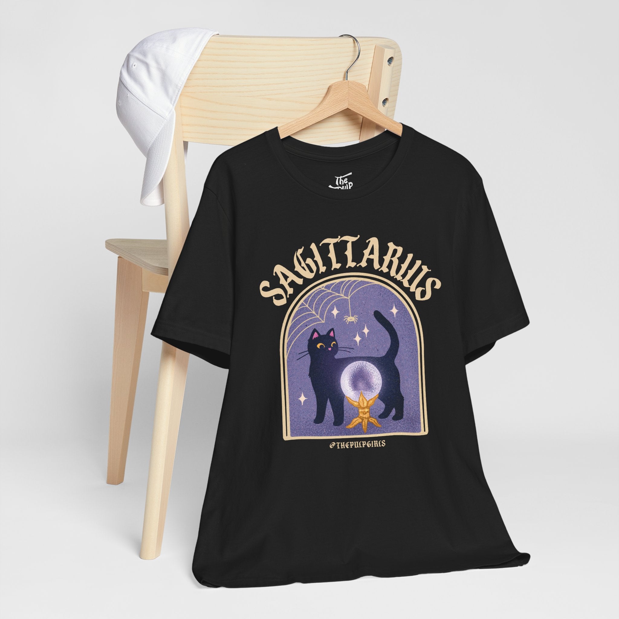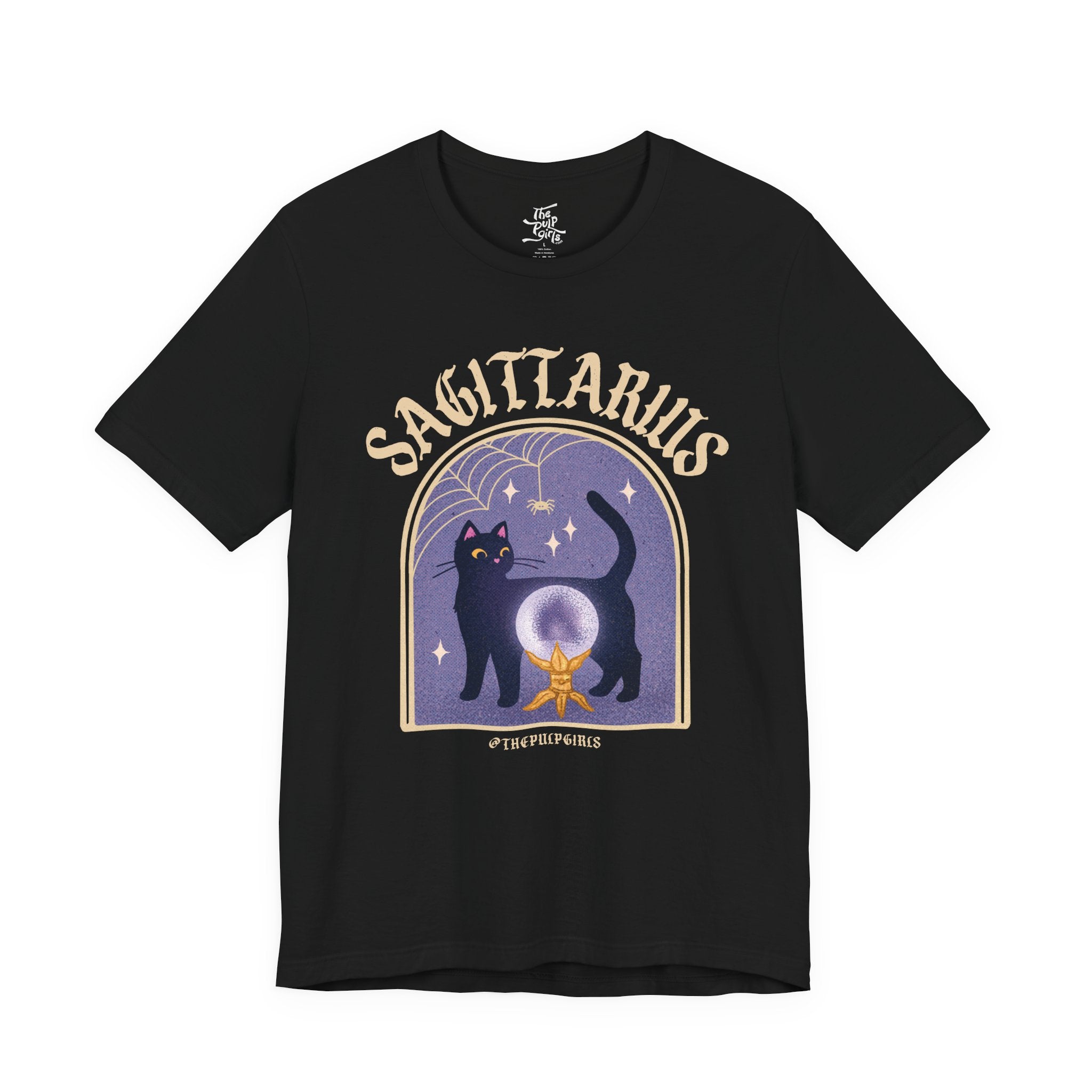 Love all things spooky and cute? We've got you Sagittarius darling! This ultra soft, super comfy tee features our adorable classic Pulp-style black cat along with spooky spiderweb motifs. Perfect for any and all witch girlies, cat lovers, goth cuties, and anyone who is simply just living their best witchy life!