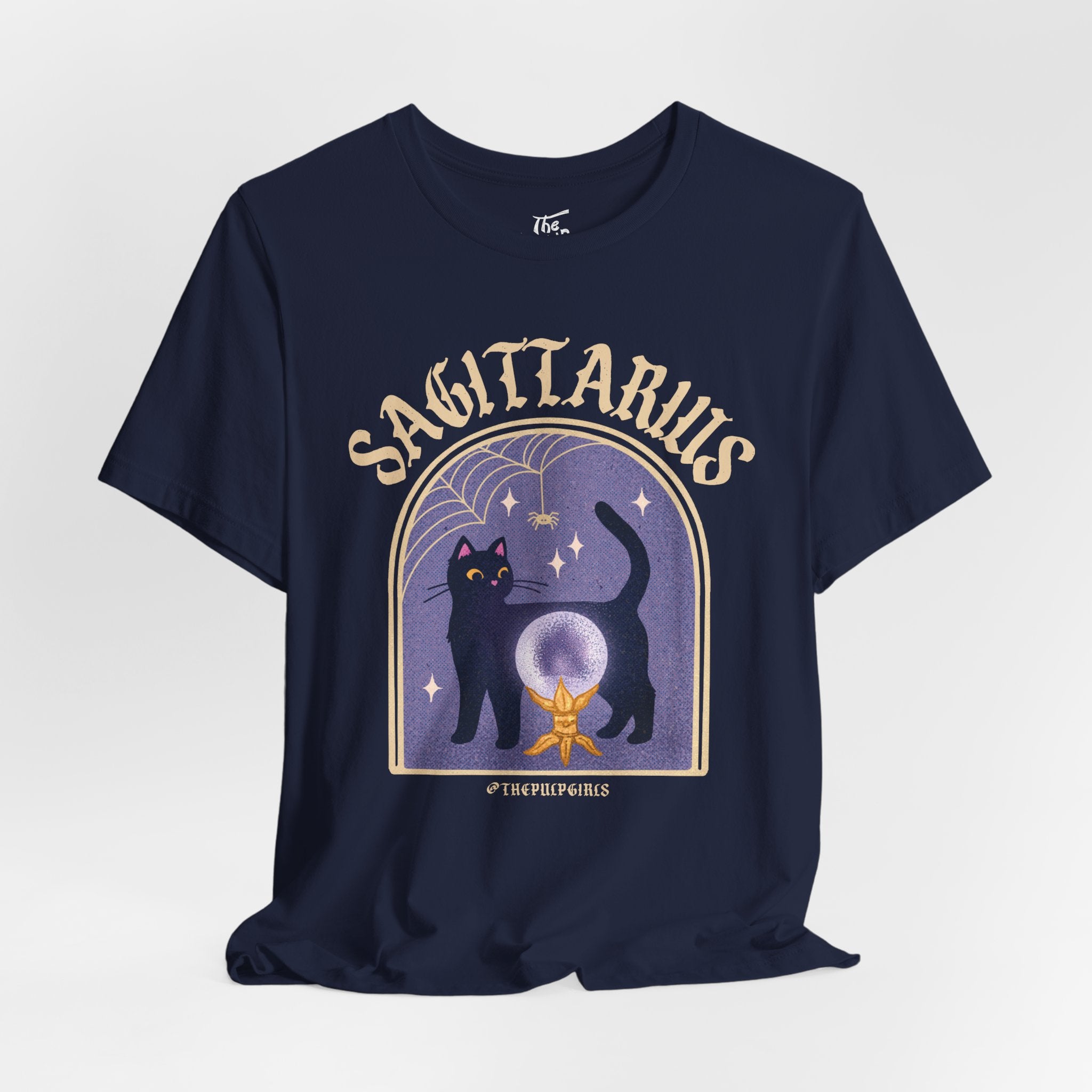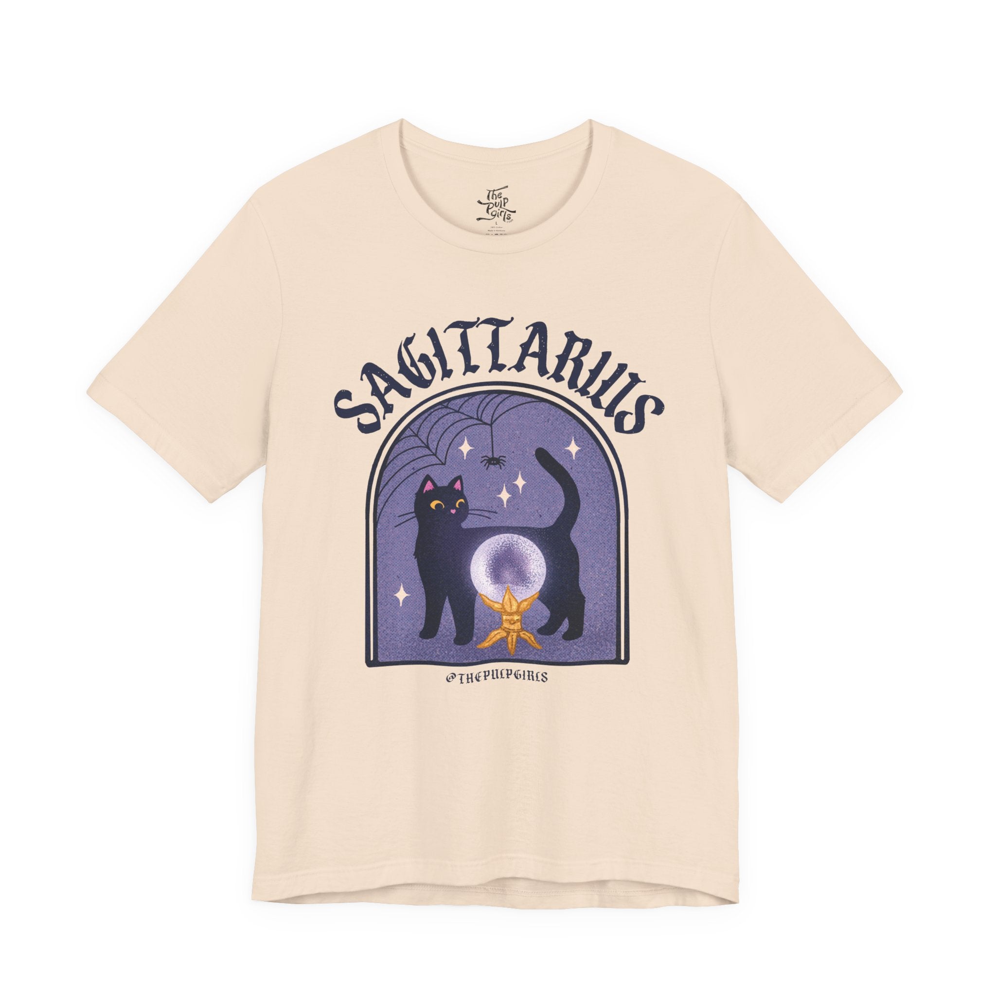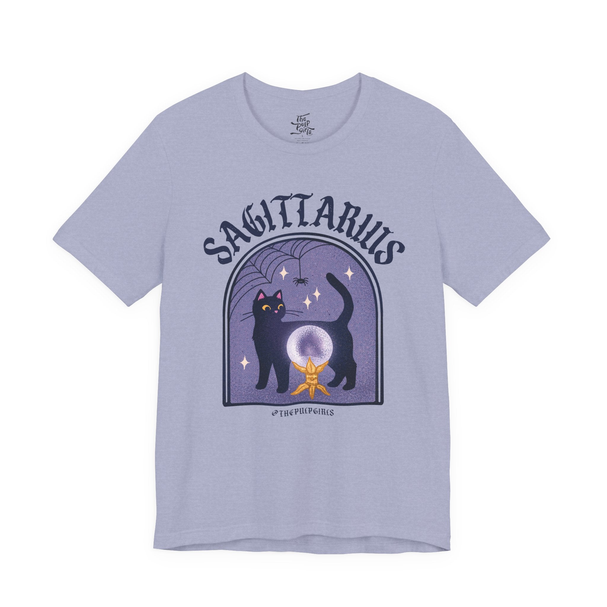 Love all things spooky and cute? We've got you Sagittarius darling! This ultra soft, super comfy tee features our adorable classic Pulp-style black cat along with spooky spiderweb motifs. Perfect for any and all witch girlies, cat lovers, goth cuties, and anyone who is simply just living their best witchy life!