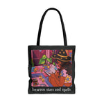 Tote featuring a witch reading in a cozy cottage. Perfect for those who love witchy aesthetics and want to embrace their inner magic. Ideal for Halloween, witchcraft enthusiasts, and anyone looking to add a touch of the supernatural to their wardrobe.